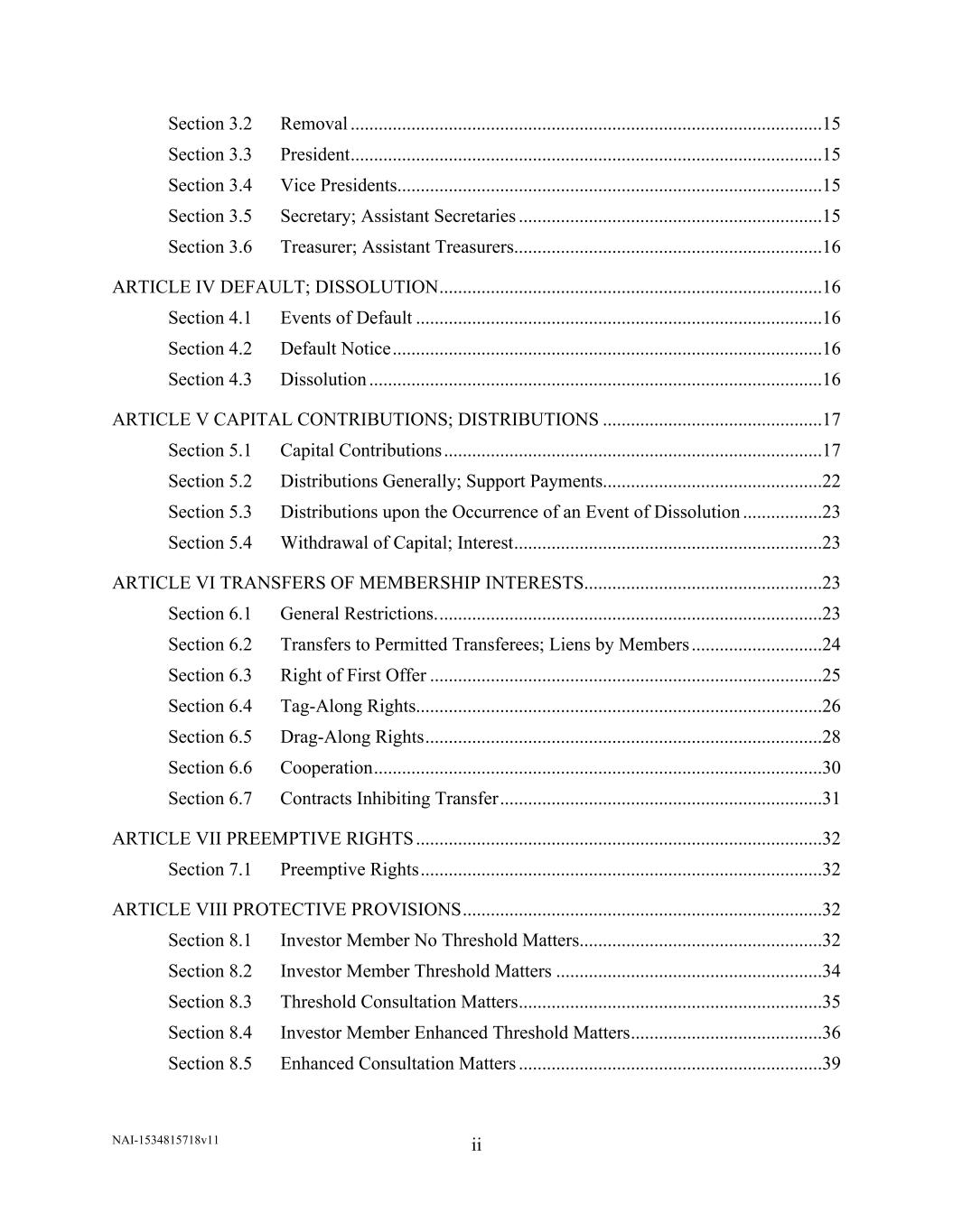 NAI-1534815718v11 ii Section 3.2 Removal .....................................................................................................15 Section 3.3 President .....................................................................................................15 Section 3.4 Vice Presidents ...........................................................................................15 Section 3.5 Secretary; Assistant Secretaries .................................................................15 Section 3.6 Treasurer; Assistant Treasurers ..................................................................16 ARTICLE IV DEFAULT; DISSOLUTION ..................................................................................16 Section 4.1 Events of Default .......................................................................................16 Section 4.2 Default Notice ............................................................................................16 Section 4.3 Dissolution .................................................................................................16 ARTICLE V CAPITAL CONTRIBUTIONS; DISTRIBUTIONS ...............................................17 Section 5.1 Capital Contributions .................................................................................17 Section 5.2 Distributions Generally; Support Payments...............................................22 Section 5.3 Distributions upon the Occurrence of an Event of Dissolution .................23 Section 5.4 Withdrawal of Capital; Interest ..................................................................23 ARTICLE VI TRANSFERS OF MEMBERSHIP INTERESTS ...................................................23 Section 6.1 General Restrictions. ..................................................................................23 Section 6.2 Transfers to Permitted Transferees; Liens by Members ............................24 Section 6.3 Right of First Offer ....................................................................................25 Section 6.4 Tag-Along Rights.......................................................................................26 Section 6.5 Drag-Along Rights .....................................................................................28 Section 6.6 Cooperation ................................................................................................30 Section 6.7 Contracts Inhibiting Transfer .....................................................................31 ARTICLE VII PREEMPTIVE RIGHTS .......................................................................................32 Section 7.1 Preemptive Rights ......................................................................................32 ARTICLE VIII PROTECTIVE PROVISIONS .............................................................................32 Section 8.1 Investor Member No Threshold Matters ....................................................32 Section 8.2 Investor Member Threshold Matters .........................................................34 Section 8.3 Threshold Consultation Matters .................................................................35 Section 8.4 Investor Member Enhanced Threshold Matters .........................................36 Section 8.5 Enhanced Consultation Matters .................................................................39