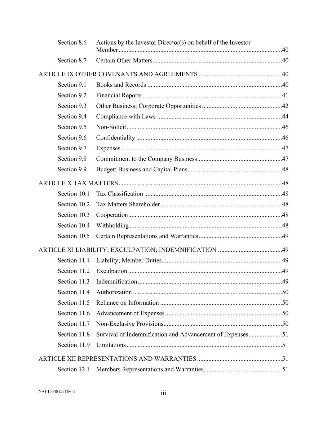 NAI-1534815718v11 iii Section 8.6 Actions by the Investor Director(s) on behalf of the Investor Member ......................................................................................................40 Section 8.7 Certain Other Matters ................................................................................40 ARTICLE IX OTHER COVENANTS AND AGREEMENTS ....................................................40 Section 9.1 Books and Records ....................................................................................40 Section 9.2 Financial Reports .......................................................................................41 Section 9.3 Other Business; Corporate Opportunities ..................................................42 Section 9.4 Compliance with Laws ..............................................................................44 Section 9.5 Non-Solicit .................................................................................................46 Section 9.6 Confidentiality ...........................................................................................46 Section 9.7 Expenses ....................................................................................................47 Section 9.8 Commitment to the Company Business .....................................................47 Section 9.9 Budget; Business and Capital Plans ...........................................................48 ARTICLE X TAX MATTERS ......................................................................................................48 Section 10.1 Tax Classification ......................................................................................48 Section 10.2 Tax Matters Shareholder ............................................................................48 Section 10.3 Cooperation ................................................................................................48 Section 10.4 Withholding ...............................................................................................48 Section 10.5 Certain Representations and Warranties ....................................................49 ARTICLE XI LIABILITY; EXCULPATION; INDEMNIFICATION ........................................49 Section 11.1 Liability; Member Duties ...........................................................................49 Section 11.2 Exculpation ................................................................................................49 Section 11.3 Indemnification ..........................................................................................49 Section 11.4 Authorization .............................................................................................50 Section 11.5 Reliance on Information ............................................................................50 Section 11.6 Advancement of Expenses .........................................................................50 Section 11.7 Non-Exclusive Provisions ..........................................................................50 Section 11.8 Survival of Indemnification and Advancement of Expenses .....................51 Section 11.9 Limitations .................................................................................................51 ARTICLE XII REPRESENTATIONS AND WARRANTIES .....................................................51 Section 12.1 Members Representations and Warranties .................................................51