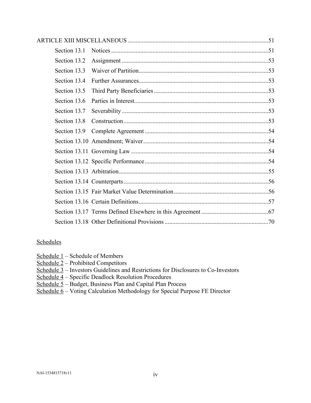 NAI-1534815718v11 iv ARTICLE XIII MISCELLANEOUS ............................................................................................51 Section 13.1 Notices .......................................................................................................51 Section 13.2 Assignment ................................................................................................53 Section 13.3 Waiver of Partition .....................................................................................53 Section 13.4 Further Assurances.....................................................................................53 Section 13.5 Third Party Beneficiaries ...........................................................................53 Section 13.6 Parties in Interest........................................................................................53 Section 13.7 Severability ................................................................................................53 Section 13.8 Construction ...............................................................................................53 Section 13.9 Complete Agreement .................................................................................54 Section 13.10 Amendment; Waiver ..................................................................................54 Section 13.11 Governing Law ..........................................................................................54 Section 13.12 Specific Performance .................................................................................54 Section 13.13 Arbitration ..................................................................................................55 Section 13.14 Counterparts ...............................................................................................56 Section 13.15 Fair Market Value Determination ..............................................................56 Section 13.16 Certain Definitions .....................................................................................57 Section 13.17 Terms Defined Elsewhere in this Agreement ............................................67 Section 13.18 Other Definitional Provisions ....................................................................70 Schedules Schedule 1 – Schedule of Members Schedule 2 – Prohibited Competitors Schedule 3 – Investors Guidelines and Restrictions for Disclosures to Co-Investors Schedule 4 – Specific Deadlock Resolution Procedures Schedule 5 – Budget, Business Plan and Capital Plan Process Schedule 6 – Voting Calculation Methodology for Special Purpose FE Director
