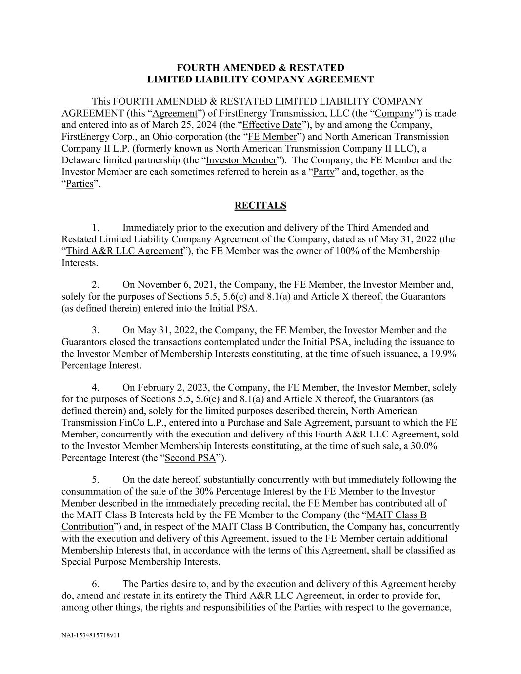 NAI-1534815718v11 FOURTH AMENDED & RESTATED LIMITED LIABILITY COMPANY AGREEMENT This FOURTH AMENDED & RESTATED LIMITED LIABILITY COMPANY AGREEMENT (this “Agreement”) of FirstEnergy Transmission, LLC (the “Company”) is made and entered into as of March 25, 2024 (the “Effective Date”), by and among the Company, FirstEnergy Corp., an Ohio corporation (the “FE Member”) and North American Transmission Company II L.P. (formerly known as North American Transmission Company II LLC), a Delaware limited partnership (the “Investor Member”). The Company, the FE Member and the Investor Member are each sometimes referred to herein as a “Party” and, together, as the “Parties”. RECITALS 1. Immediately prior to the execution and delivery of the Third Amended and Restated Limited Liability Company Agreement of the Company, dated as of May 31, 2022 (the “Third A&R LLC Agreement”), the FE Member was the owner of 100% of the Membership Interests. 2. On November 6, 2021, the Company, the FE Member, the Investor Member and, solely for the purposes of Sections 5.5, 5.6(c) and 8.1(a) and Article X thereof, the Guarantors (as defined therein) entered into the Initial PSA. 3. On May 31, 2022, the Company, the FE Member, the Investor Member and the Guarantors closed the transactions contemplated under the Initial PSA, including the issuance to the Investor Member of Membership Interests constituting, at the time of such issuance, a 19.9% Percentage Interest. 4. On February 2, 2023, the Company, the FE Member, the Investor Member, solely for the purposes of Sections 5.5, 5.6(c) and 8.1(a) and Article X thereof, the Guarantors (as defined therein) and, solely for the limited purposes described therein, North American Transmission FinCo L.P., entered into a Purchase and Sale Agreement, pursuant to which the FE Member, concurrently with the execution and delivery of this Fourth A&R LLC Agreement, sold to the Investor Member Membership Interests constituting, at the time of such sale, a 30.0% Percentage Interest (the “Second PSA”). 5. On the date hereof, substantially concurrently with but immediately following the consummation of the sale of the 30% Percentage Interest by the FE Member to the Investor Member described in the immediately preceding recital, the FE Member has contributed all of the MAIT Class B Interests held by the FE Member to the Company (the “MAIT Class B Contribution”) and, in respect of the MAIT Class B Contribution, the Company has, concurrently with the execution and delivery of this Agreement, issued to the FE Member certain additional Membership Interests that, in accordance with the terms of this Agreement, shall be classified as Special Purpose Membership Interests. 6. The Parties desire to, and by the execution and delivery of this Agreement hereby do, amend and restate in its entirety the Third A&R LLC Agreement, in order to provide for, among other things, the rights and responsibilities of the Parties with respect to the governance,