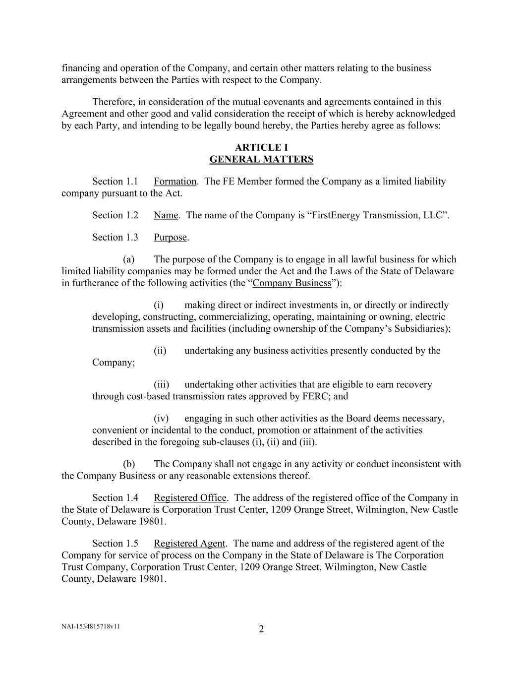 NAI-1534815718v11 2 financing and operation of the Company, and certain other matters relating to the business arrangements between the Parties with respect to the Company. Therefore, in consideration of the mutual covenants and agreements contained in this Agreement and other good and valid consideration the receipt of which is hereby acknowledged by each Party, and intending to be legally bound hereby, the Parties hereby agree as follows: ARTICLE I GENERAL MATTERS Section 1.1 Formation. The FE Member formed the Company as a limited liability company pursuant to the Act. Section 1.2 Name. The name of the Company is “FirstEnergy Transmission, LLC”. Section 1.3 Purpose. (a) The purpose of the Company is to engage in all lawful business for which limited liability companies may be formed under the Act and the Laws of the State of Delaware in furtherance of the following activities (the “Company Business”): (i) making direct or indirect investments in, or directly or indirectly developing, constructing, commercializing, operating, maintaining or owning, electric transmission assets and facilities (including ownership of the Company’s Subsidiaries); (ii) undertaking any business activities presently conducted by the Company; (iii) undertaking other activities that are eligible to earn recovery through cost-based transmission rates approved by FERC; and (iv) engaging in such other activities as the Board deems necessary, convenient or incidental to the conduct, promotion or attainment of the activities described in the foregoing sub-clauses (i), (ii) and (iii). (b) The Company shall not engage in any activity or conduct inconsistent with the Company Business or any reasonable extensions thereof. Section 1.4 Registered Office. The address of the registered office of the Company in the State of Delaware is Corporation Trust Center, 1209 Orange Street, Wilmington, New Castle County, Delaware 19801. Section 1.5 Registered Agent. The name and address of the registered agent of the Company for service of process on the Company in the State of Delaware is The Corporation Trust Company, Corporation Trust Center, 1209 Orange Street, Wilmington, New Castle County, Delaware 19801.