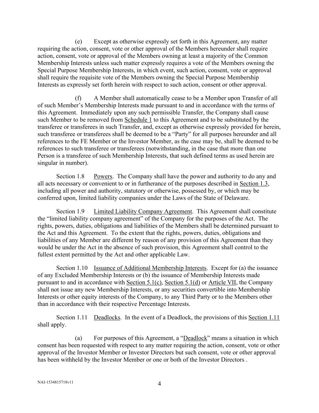 NAI-1534815718v11 4 (e) Except as otherwise expressly set forth in this Agreement, any matter requiring the action, consent, vote or other approval of the Members hereunder shall require action, consent, vote or approval of the Members owning at least a majority of the Common Membership Interests unless such matter expressly requires a vote of the Members owning the Special Purpose Membership Interests, in which event, such action, consent, vote or approval shall require the requisite vote of the Members owning the Special Purpose Membership Interests as expressly set forth herein with respect to such action, consent or other approval. (f) A Member shall automatically cease to be a Member upon Transfer of all of such Member’s Membership Interests made pursuant to and in accordance with the terms of this Agreement. Immediately upon any such permissible Transfer, the Company shall cause such Member to be removed from Schedule 1 to this Agreement and to be substituted by the transferee or transferees in such Transfer, and, except as otherwise expressly provided for herein, such transferee or transferees shall be deemed to be a “Party” for all purposes hereunder and all references to the FE Member or the Investor Member, as the case may be, shall be deemed to be references to such transferee or transferees (notwithstanding, in the case that more than one Person is a transferee of such Membership Interests, that such defined terms as used herein are singular in number). Section 1.8 Powers. The Company shall have the power and authority to do any and all acts necessary or convenient to or in furtherance of the purposes described in Section 1.3, including all power and authority, statutory or otherwise, possessed by, or which may be conferred upon, limited liability companies under the Laws of the State of Delaware. Section 1.9 Limited Liability Company Agreement. This Agreement shall constitute the “limited liability company agreement” of the Company for the purposes of the Act. The rights, powers, duties, obligations and liabilities of the Members shall be determined pursuant to the Act and this Agreement. To the extent that the rights, powers, duties, obligations and liabilities of any Member are different by reason of any provision of this Agreement than they would be under the Act in the absence of such provision, this Agreement shall control to the fullest extent permitted by the Act and other applicable Law. Section 1.10 Issuance of Additional Membership Interests. Except for (a) the issuance of any Excluded Membership Interests or (b) the issuance of Membership Interests made pursuant to and in accordance with Section 5.1(c), Section 5.1(d) or Article VII, the Company shall not issue any new Membership Interests, or any securities convertible into Membership Interests or other equity interests of the Company, to any Third Party or to the Members other than in accordance with their respective Percentage Interests. Section 1.11 Deadlocks. In the event of a Deadlock, the provisions of this Section 1.11 shall apply. (a) For purposes of this Agreement, a “Deadlock” means a situation in which consent has been requested with respect to any matter requiring the action, consent, vote or other approval of the Investor Member or Investor Directors but such consent, vote or other approval has been withheld by the Investor Member or one or both of the Investor Directors .