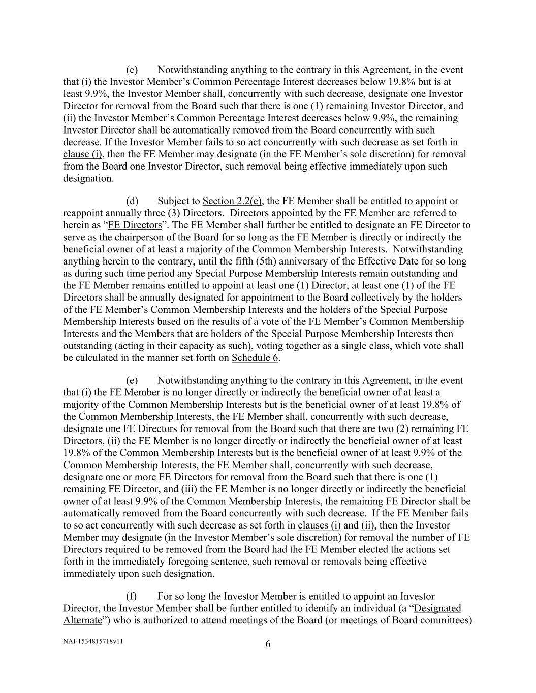 NAI-1534815718v11 6 (c) Notwithstanding anything to the contrary in this Agreement, in the event that (i) the Investor Member’s Common Percentage Interest decreases below 19.8% but is at least 9.9%, the Investor Member shall, concurrently with such decrease, designate one Investor Director for removal from the Board such that there is one (1) remaining Investor Director, and (ii) the Investor Member’s Common Percentage Interest decreases below 9.9%, the remaining Investor Director shall be automatically removed from the Board concurrently with such decrease. If the Investor Member fails to so act concurrently with such decrease as set forth in clause (i), then the FE Member may designate (in the FE Member’s sole discretion) for removal from the Board one Investor Director, such removal being effective immediately upon such designation. (d) Subject to Section 2.2(e), the FE Member shall be entitled to appoint or reappoint annually three (3) Directors. Directors appointed by the FE Member are referred to herein as “FE Directors”. The FE Member shall further be entitled to designate an FE Director to serve as the chairperson of the Board for so long as the FE Member is directly or indirectly the beneficial owner of at least a majority of the Common Membership Interests. Notwithstanding anything herein to the contrary, until the fifth (5th) anniversary of the Effective Date for so long as during such time period any Special Purpose Membership Interests remain outstanding and the FE Member remains entitled to appoint at least one (1) Director, at least one (1) of the FE Directors shall be annually designated for appointment to the Board collectively by the holders of the FE Member’s Common Membership Interests and the holders of the Special Purpose Membership Interests based on the results of a vote of the FE Member’s Common Membership Interests and the Members that are holders of the Special Purpose Membership Interests then outstanding (acting in their capacity as such), voting together as a single class, which vote shall be calculated in the manner set forth on Schedule 6. (e) Notwithstanding anything to the contrary in this Agreement, in the event that (i) the FE Member is no longer directly or indirectly the beneficial owner of at least a majority of the Common Membership Interests but is the beneficial owner of at least 19.8% of the Common Membership Interests, the FE Member shall, concurrently with such decrease, designate one FE Directors for removal from the Board such that there are two (2) remaining FE Directors, (ii) the FE Member is no longer directly or indirectly the beneficial owner of at least 19.8% of the Common Membership Interests but is the beneficial owner of at least 9.9% of the Common Membership Interests, the FE Member shall, concurrently with such decrease, designate one or more FE Directors for removal from the Board such that there is one (1) remaining FE Director, and (iii) the FE Member is no longer directly or indirectly the beneficial owner of at least 9.9% of the Common Membership Interests, the remaining FE Director shall be automatically removed from the Board concurrently with such decrease. If the FE Member fails to so act concurrently with such decrease as set forth in clauses (i) and (ii), then the Investor Member may designate (in the Investor Member’s sole discretion) for removal the number of FE Directors required to be removed from the Board had the FE Member elected the actions set forth in the immediately foregoing sentence, such removal or removals being effective immediately upon such designation. (f) For so long the Investor Member is entitled to appoint an Investor Director, the Investor Member shall be further entitled to identify an individual (a “Designated Alternate”) who is authorized to attend meetings of the Board (or meetings of Board committees)