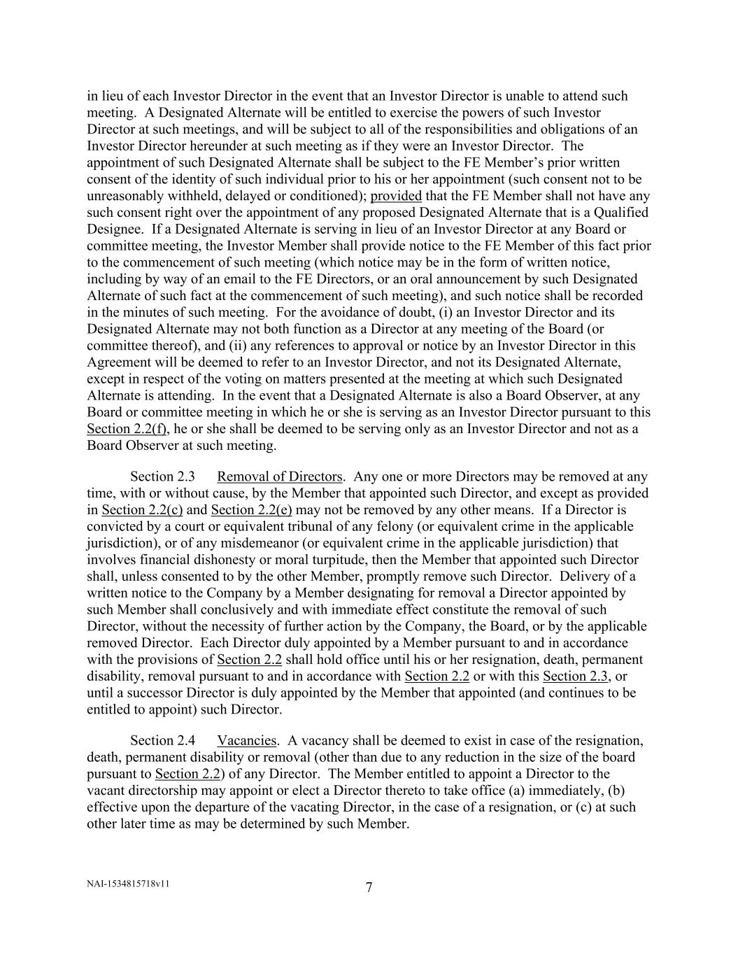NAI-1534815718v11 7 in lieu of each Investor Director in the event that an Investor Director is unable to attend such meeting. A Designated Alternate will be entitled to exercise the powers of such Investor Director at such meetings, and will be subject to all of the responsibilities and obligations of an Investor Director hereunder at such meeting as if they were an Investor Director. The appointment of such Designated Alternate shall be subject to the FE Member’s prior written consent of the identity of such individual prior to his or her appointment (such consent not to be unreasonably withheld, delayed or conditioned); provided that the FE Member shall not have any such consent right over the appointment of any proposed Designated Alternate that is a Qualified Designee. If a Designated Alternate is serving in lieu of an Investor Director at any Board or committee meeting, the Investor Member shall provide notice to the FE Member of this fact prior to the commencement of such meeting (which notice may be in the form of written notice, including by way of an email to the FE Directors, or an oral announcement by such Designated Alternate of such fact at the commencement of such meeting), and such notice shall be recorded in the minutes of such meeting. For the avoidance of doubt, (i) an Investor Director and its Designated Alternate may not both function as a Director at any meeting of the Board (or committee thereof), and (ii) any references to approval or notice by an Investor Director in this Agreement will be deemed to refer to an Investor Director, and not its Designated Alternate, except in respect of the voting on matters presented at the meeting at which such Designated Alternate is attending. In the event that a Designated Alternate is also a Board Observer, at any Board or committee meeting in which he or she is serving as an Investor Director pursuant to this Section 2.2(f), he or she shall be deemed to be serving only as an Investor Director and not as a Board Observer at such meeting. Section 2.3 Removal of Directors. Any one or more Directors may be removed at any time, with or without cause, by the Member that appointed such Director, and except as provided in Section 2.2(c) and Section 2.2(e) may not be removed by any other means. If a Director is convicted by a court or equivalent tribunal of any felony (or equivalent crime in the applicable jurisdiction), or of any misdemeanor (or equivalent crime in the applicable jurisdiction) that involves financial dishonesty or moral turpitude, then the Member that appointed such Director shall, unless consented to by the other Member, promptly remove such Director. Delivery of a written notice to the Company by a Member designating for removal a Director appointed by such Member shall conclusively and with immediate effect constitute the removal of such Director, without the necessity of further action by the Company, the Board, or by the applicable removed Director. Each Director duly appointed by a Member pursuant to and in accordance with the provisions of Section 2.2 shall hold office until his or her resignation, death, permanent disability, removal pursuant to and in accordance with Section 2.2 or with this Section 2.3, or until a successor Director is duly appointed by the Member that appointed (and continues to be entitled to appoint) such Director. Section 2.4 Vacancies. A vacancy shall be deemed to exist in case of the resignation, death, permanent disability or removal (other than due to any reduction in the size of the board pursuant to Section 2.2) of any Director. The Member entitled to appoint a Director to the vacant directorship may appoint or elect a Director thereto to take office (a) immediately, (b) effective upon the departure of the vacating Director, in the case of a resignation, or (c) at such other later time as may be determined by such Member.