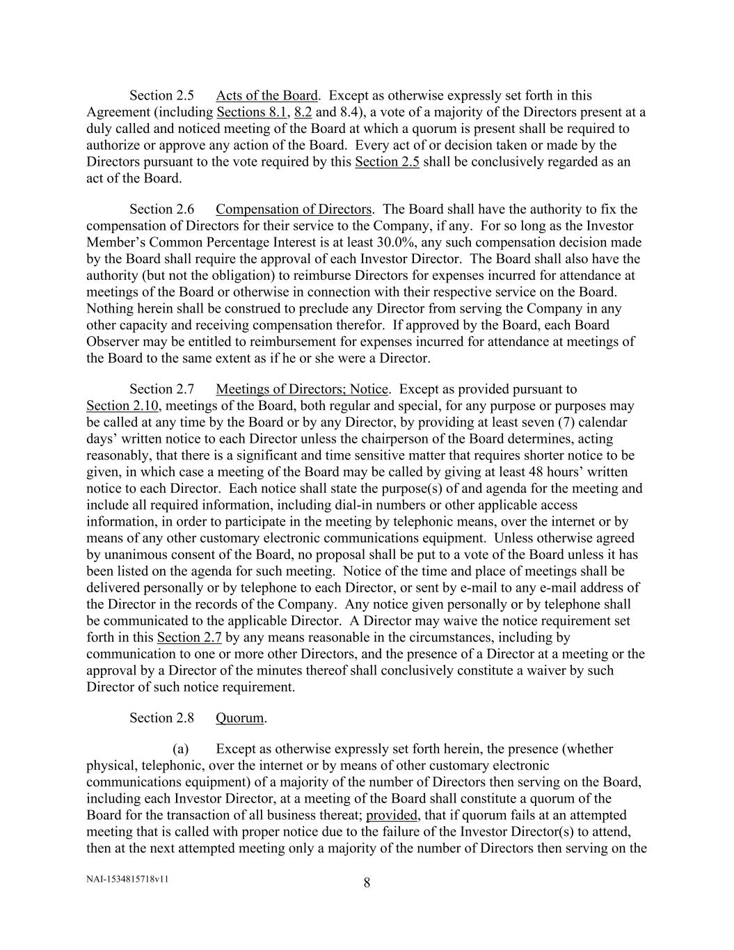 NAI-1534815718v11 8 Section 2.5 Acts of the Board. Except as otherwise expressly set forth in this Agreement (including Sections 8.1, 8.2 and 8.4), a vote of a majority of the Directors present at a duly called and noticed meeting of the Board at which a quorum is present shall be required to authorize or approve any action of the Board. Every act of or decision taken or made by the Directors pursuant to the vote required by this Section 2.5 shall be conclusively regarded as an act of the Board. Section 2.6 Compensation of Directors. The Board shall have the authority to fix the compensation of Directors for their service to the Company, if any. For so long as the Investor Member’s Common Percentage Interest is at least 30.0%, any such compensation decision made by the Board shall require the approval of each Investor Director. The Board shall also have the authority (but not the obligation) to reimburse Directors for expenses incurred for attendance at meetings of the Board or otherwise in connection with their respective service on the Board. Nothing herein shall be construed to preclude any Director from serving the Company in any other capacity and receiving compensation therefor. If approved by the Board, each Board Observer may be entitled to reimbursement for expenses incurred for attendance at meetings of the Board to the same extent as if he or she were a Director. Section 2.7 Meetings of Directors; Notice. Except as provided pursuant to Section 2.10, meetings of the Board, both regular and special, for any purpose or purposes may be called at any time by the Board or by any Director, by providing at least seven (7) calendar days’ written notice to each Director unless the chairperson of the Board determines, acting reasonably, that there is a significant and time sensitive matter that requires shorter notice to be given, in which case a meeting of the Board may be called by giving at least 48 hours’ written notice to each Director. Each notice shall state the purpose(s) of and agenda for the meeting and include all required information, including dial-in numbers or other applicable access information, in order to participate in the meeting by telephonic means, over the internet or by means of any other customary electronic communications equipment. Unless otherwise agreed by unanimous consent of the Board, no proposal shall be put to a vote of the Board unless it has been listed on the agenda for such meeting. Notice of the time and place of meetings shall be delivered personally or by telephone to each Director, or sent by e-mail to any e-mail address of the Director in the records of the Company. Any notice given personally or by telephone shall be communicated to the applicable Director. A Director may waive the notice requirement set forth in this Section 2.7 by any means reasonable in the circumstances, including by communication to one or more other Directors, and the presence of a Director at a meeting or the approval by a Director of the minutes thereof shall conclusively constitute a waiver by such Director of such notice requirement. Section 2.8 Quorum. (a) Except as otherwise expressly set forth herein, the presence (whether physical, telephonic, over the internet or by means of other customary electronic communications equipment) of a majority of the number of Directors then serving on the Board, including each Investor Director, at a meeting of the Board shall constitute a quorum of the Board for the transaction of all business thereat; provided, that if quorum fails at an attempted meeting that is called with proper notice due to the failure of the Investor Director(s) to attend, then at the next attempted meeting only a majority of the number of Directors then serving on the