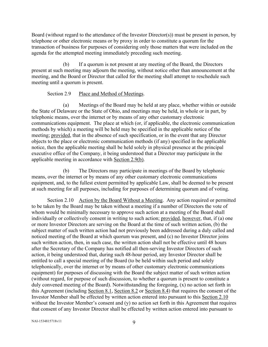 NAI-1534815718v11 9 Board (without regard to the attendance of the Investor Director(s)) must be present in person, by telephone or other electronic means or by proxy in order to constitute a quorum for the transaction of business for purposes of considering only those matters that were included on the agenda for the attempted meeting immediately preceding such meeting. (b) If a quorum is not present at any meeting of the Board, the Directors present at such meeting may adjourn the meeting, without notice other than announcement at the meeting, and the Board or Director that called for the meeting shall attempt to reschedule such meeting until a quorum is present. Section 2.9 Place and Method of Meetings. (a) Meetings of the Board may be held at any place, whether within or outside the State of Delaware or the State of Ohio, and meetings may be held, in whole or in part, by telephonic means, over the internet or by means of any other customary electronic communications equipment. The place at which (or, if applicable, the electronic communication methods by which) a meeting will be held may be specified in the applicable notice of the meeting; provided, that in the absence of such specification, or in the event that any Director objects to the place or electronic communication methods (if any) specified in the applicable notice, then the applicable meeting shall be held solely in physical presence at the principal executive office of the Company, it being understood that a Director may participate in the applicable meeting in accordance with Section 2.9(b). (b) The Directors may participate in meetings of the Board by telephonic means, over the internet or by means of any other customary electronic communications equipment, and, to the fullest extent permitted by applicable Law, shall be deemed to be present at such meeting for all purposes, including for purposes of determining quorum and of voting. Section 2.10 Action by the Board Without a Meeting. Any action required or permitted to be taken by the Board may be taken without a meeting if a number of Directors the vote of whom would be minimally necessary to approve such action at a meeting of the Board shall individually or collectively consent in writing to such action; provided, however, that, if (a) one or more Investor Directors are serving on the Board at the time of such written action, (b) the subject matter of such written action had not previously been addressed during a duly called and noticed meeting of the Board at which quorum was present, and (c) no Investor Director joins such written action, then, in such case, the written action shall not be effective until 48 hours after the Secretary of the Company has notified all then-serving Investor Directors of such action, it being understood that, during such 48-hour period, any Investor Director shall be entitled to call a special meeting of the Board (to be held within such period and solely telephonically, over the internet or by means of other customary electronic communications equipment) for purposes of discussing with the Board the subject matter of such written action (without regard, for purpose of such discussion, to whether a quorum is present to constitute a duly convened meeting of the Board). Notwithstanding the foregoing, (x) no action set forth in this Agreement (including Section 8.1, Section 8.2 or Section 8.4) that requires the consent of the Investor Member shall be effected by written action entered into pursuant to this Section 2.10 without the Investor Member’s consent and (y) no action set forth in this Agreement that requires that consent of any Investor Director shall be effected by written action entered into pursuant to