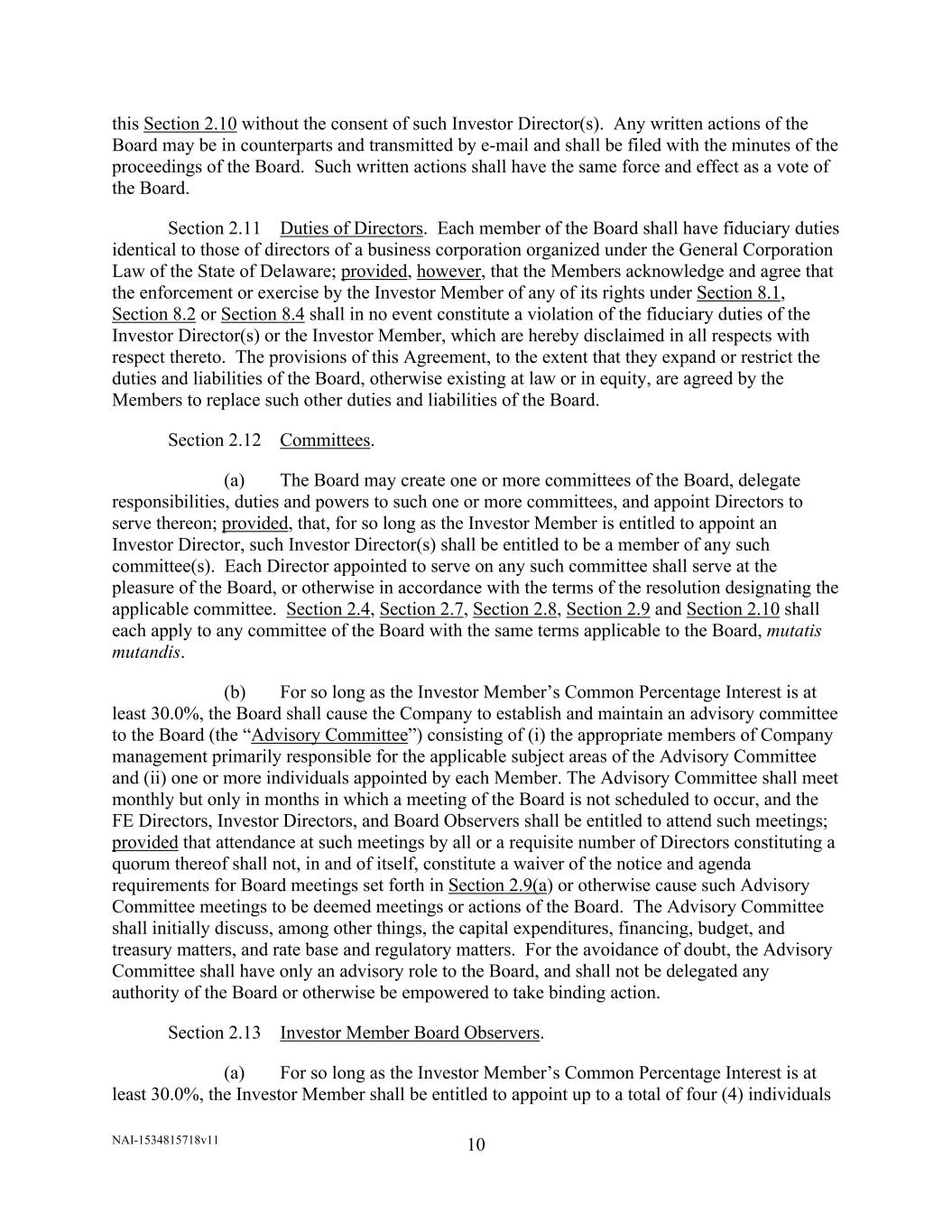 NAI-1534815718v11 10 this Section 2.10 without the consent of such Investor Director(s). Any written actions of the Board may be in counterparts and transmitted by e-mail and shall be filed with the minutes of the proceedings of the Board. Such written actions shall have the same force and effect as a vote of the Board. Section 2.11 Duties of Directors. Each member of the Board shall have fiduciary duties identical to those of directors of a business corporation organized under the General Corporation Law of the State of Delaware; provided, however, that the Members acknowledge and agree that the enforcement or exercise by the Investor Member of any of its rights under Section 8.1, Section 8.2 or Section 8.4 shall in no event constitute a violation of the fiduciary duties of the Investor Director(s) or the Investor Member, which are hereby disclaimed in all respects with respect thereto. The provisions of this Agreement, to the extent that they expand or restrict the duties and liabilities of the Board, otherwise existing at law or in equity, are agreed by the Members to replace such other duties and liabilities of the Board. Section 2.12 Committees. (a) The Board may create one or more committees of the Board, delegate responsibilities, duties and powers to such one or more committees, and appoint Directors to serve thereon; provided, that, for so long as the Investor Member is entitled to appoint an Investor Director, such Investor Director(s) shall be entitled to be a member of any such committee(s). Each Director appointed to serve on any such committee shall serve at the pleasure of the Board, or otherwise in accordance with the terms of the resolution designating the applicable committee. Section 2.4, Section 2.7, Section 2.8, Section 2.9 and Section 2.10 shall each apply to any committee of the Board with the same terms applicable to the Board, mutatis mutandis. (b) For so long as the Investor Member’s Common Percentage Interest is at least 30.0%, the Board shall cause the Company to establish and maintain an advisory committee to the Board (the “Advisory Committee”) consisting of (i) the appropriate members of Company management primarily responsible for the applicable subject areas of the Advisory Committee and (ii) one or more individuals appointed by each Member. The Advisory Committee shall meet monthly but only in months in which a meeting of the Board is not scheduled to occur, and the FE Directors, Investor Directors, and Board Observers shall be entitled to attend such meetings; provided that attendance at such meetings by all or a requisite number of Directors constituting a quorum thereof shall not, in and of itself, constitute a waiver of the notice and agenda requirements for Board meetings set forth in Section 2.9(a) or otherwise cause such Advisory Committee meetings to be deemed meetings or actions of the Board. The Advisory Committee shall initially discuss, among other things, the capital expenditures, financing, budget, and treasury matters, and rate base and regulatory matters. For the avoidance of doubt, the Advisory Committee shall have only an advisory role to the Board, and shall not be delegated any authority of the Board or otherwise be empowered to take binding action. Section 2.13 Investor Member Board Observers. (a) For so long as the Investor Member’s Common Percentage Interest is at least 30.0%, the Investor Member shall be entitled to appoint up to a total of four (4) individuals