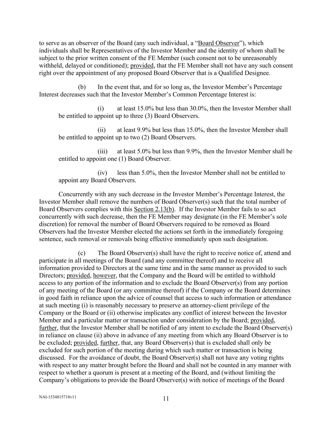 NAI-1534815718v11 11 to serve as an observer of the Board (any such individual, a “Board Observer”), which individuals shall be Representatives of the Investor Member and the identity of whom shall be subject to the prior written consent of the FE Member (such consent not to be unreasonably withheld, delayed or conditioned); provided, that the FE Member shall not have any such consent right over the appointment of any proposed Board Observer that is a Qualified Designee. (b) In the event that, and for so long as, the Investor Member’s Percentage Interest decreases such that the Investor Member’s Common Percentage Interest is: (i) at least 15.0% but less than 30.0%, then the Investor Member shall be entitled to appoint up to three (3) Board Observers. (ii) at least 9.9% but less than 15.0%, then the Investor Member shall be entitled to appoint up to two (2) Board Observers. (iii) at least 5.0% but less than 9.9%, then the Investor Member shall be entitled to appoint one (1) Board Observer. (iv) less than 5.0%, then the Investor Member shall not be entitled to appoint any Board Observers. Concurrently with any such decrease in the Investor Member’s Percentage Interest, the Investor Member shall remove the numbers of Board Observer(s) such that the total number of Board Observers complies with this Section 2.13(b). If the Investor Member fails to so act concurrently with such decrease, then the FE Member may designate (in the FE Member’s sole discretion) for removal the number of Board Observers required to be removed as Board Observers had the Investor Member elected the actions set forth in the immediately foregoing sentence, such removal or removals being effective immediately upon such designation. (c) The Board Observer(s) shall have the right to receive notice of, attend and participate in all meetings of the Board (and any committee thereof) and to receive all information provided to Directors at the same time and in the same manner as provided to such Directors; provided, however, that the Company and the Board will be entitled to withhold access to any portion of the information and to exclude the Board Observer(s) from any portion of any meeting of the Board (or any committee thereof) if the Company or the Board determines in good faith in reliance upon the advice of counsel that access to such information or attendance at such meeting (i) is reasonably necessary to preserve an attorney-client privilege of the Company or the Board or (ii) otherwise implicates any conflict of interest between the Investor Member and a particular matter or transaction under consideration by the Board; provided, further, that the Investor Member shall be notified of any intent to exclude the Board Observer(s) in reliance on clause (ii) above in advance of any meeting from which any Board Observer is to be excluded; provided, further, that, any Board Observer(s) that is excluded shall only be excluded for such portion of the meeting during which such matter or transaction is being discussed. For the avoidance of doubt, the Board Observer(s) shall not have any voting rights with respect to any matter brought before the Board and shall not be counted in any manner with respect to whether a quorum is present at a meeting of the Board, and (without limiting the Company’s obligations to provide the Board Observer(s) with notice of meetings of the Board