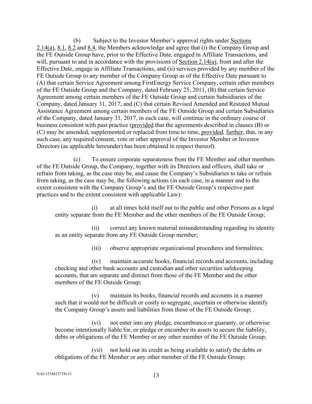 NAI-1534815718v11 13 (b) Subject to the Investor Member’s approval rights under Sections 2.14(a), 8.1, 8.2 and 8.4, the Members acknowledge and agree that (i) the Company Group and the FE Outside Group have, prior to the Effective Date, engaged in Affiliate Transactions, and will, pursuant to and in accordance with the provisions of Section 2.14(a), from and after the Effective Date, engage in Affiliate Transactions, and (ii) services provided by any member of the FE Outside Group to any member of the Company Group as of the Effective Date pursuant to (A) that certain Service Agreement among FirstEnergy Service Company, certain other members of the FE Outside Group and the Company, dated February 25, 2011, (B) that certain Service Agreement among certain members of the FE Outside Group and certain Subsidiaries of the Company, dated January 31, 2017, and (C) that certain Revised Amended and Restated Mutual Assistance Agreement among certain members of the FE Outside Group and certain Subsidiaries of the Company, dated January 31, 2017, in each case, will continue in the ordinary course of business consistent with past practice (provided that the agreements described in clauses (B) or (C) may be amended, supplemented or replaced from time to time, provided, further, that, in any such case, any required consent, vote or other approval of the Investor Member or Investor Directors (as applicable hereunder) has been obtained in respect thereof). (c) To ensure corporate separateness from the FE Member and other members of the FE Outside Group, the Company, together with its Directors and officers, shall take or refrain from taking, as the case may be, and cause the Company’s Subsidiaries to take or refrain from taking, as the case may be, the following actions (in each case, in a manner and to the extent consistent with the Company Group’s and the FE Outside Group’s respective past practices and to the extent consistent with applicable Law): (i) at all times hold itself out to the public and other Persons as a legal entity separate from the FE Member and the other members of the FE Outside Group; (ii) correct any known material misunderstanding regarding its identity as an entity separate from any FE Outside Group member; (iii) observe appropriate organizational procedures and formalities; (iv) maintain accurate books, financial records and accounts, including checking and other bank accounts and custodian and other securities safekeeping accounts, that are separate and distinct from those of the FE Member and the other members of the FE Outside Group; (v) maintain its books, financial records and accounts in a manner such that it would not be difficult or costly to segregate, ascertain or otherwise identify the Company Group’s assets and liabilities from those of the FE Outside Group; (vi) not enter into any pledge, encumbrance or guaranty, or otherwise become intentionally liable for, or pledge or encumber its assets to secure the liability, debts or obligations of the FE Member or any other member of the FE Outside Group; (vii) not hold out its credit as being available to satisfy the debts or obligations of the FE Member or any other member of the FE Outside Group;