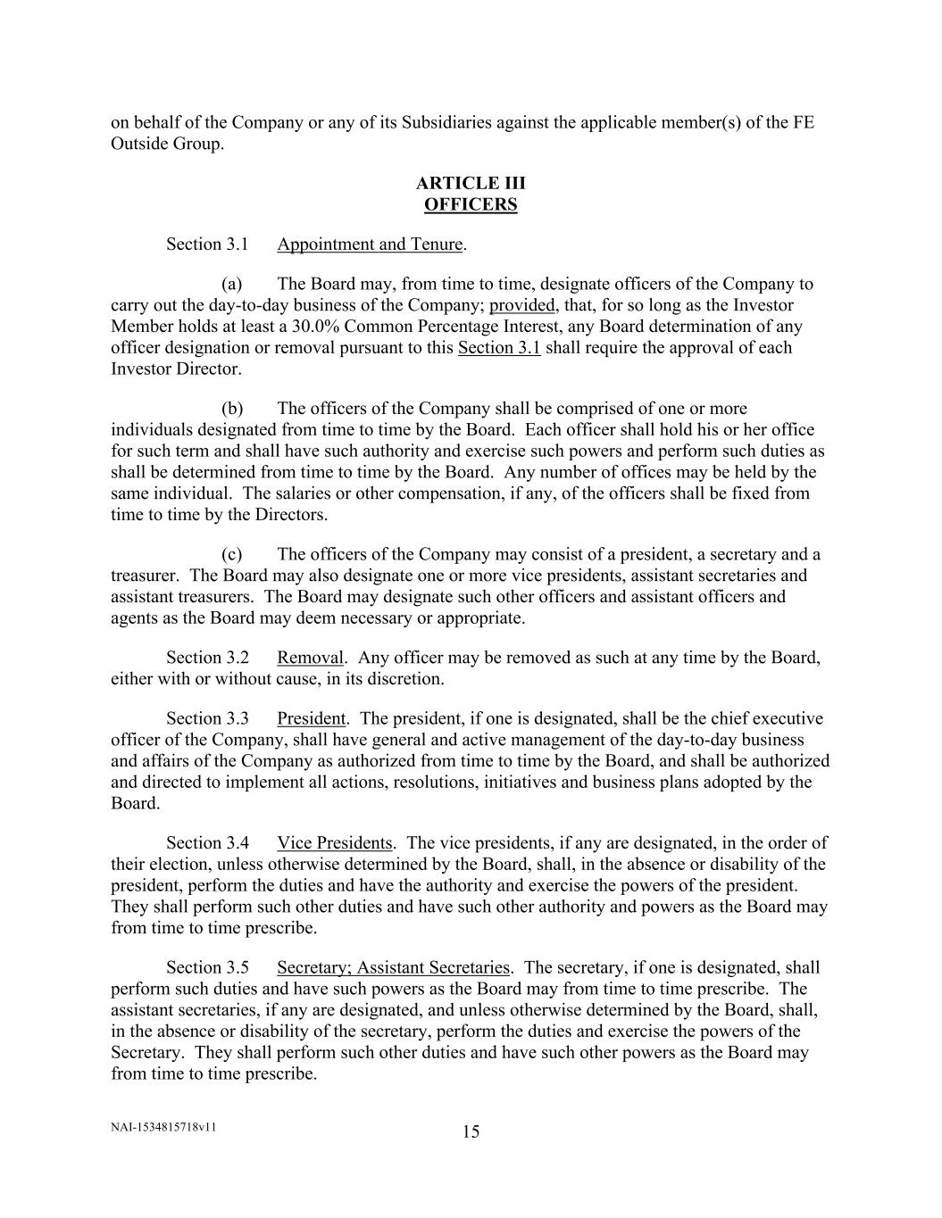 NAI-1534815718v11 15 on behalf of the Company or any of its Subsidiaries against the applicable member(s) of the FE Outside Group. ARTICLE III OFFICERS Section 3.1 Appointment and Tenure. (a) The Board may, from time to time, designate officers of the Company to carry out the day-to-day business of the Company; provided, that, for so long as the Investor Member holds at least a 30.0% Common Percentage Interest, any Board determination of any officer designation or removal pursuant to this Section 3.1 shall require the approval of each Investor Director. (b) The officers of the Company shall be comprised of one or more individuals designated from time to time by the Board. Each officer shall hold his or her office for such term and shall have such authority and exercise such powers and perform such duties as shall be determined from time to time by the Board. Any number of offices may be held by the same individual. The salaries or other compensation, if any, of the officers shall be fixed from time to time by the Directors. (c) The officers of the Company may consist of a president, a secretary and a treasurer. The Board may also designate one or more vice presidents, assistant secretaries and assistant treasurers. The Board may designate such other officers and assistant officers and agents as the Board may deem necessary or appropriate. Section 3.2 Removal. Any officer may be removed as such at any time by the Board, either with or without cause, in its discretion. Section 3.3 President. The president, if one is designated, shall be the chief executive officer of the Company, shall have general and active management of the day-to-day business and affairs of the Company as authorized from time to time by the Board, and shall be authorized and directed to implement all actions, resolutions, initiatives and business plans adopted by the Board. Section 3.4 Vice Presidents. The vice presidents, if any are designated, in the order of their election, unless otherwise determined by the Board, shall, in the absence or disability of the president, perform the duties and have the authority and exercise the powers of the president. They shall perform such other duties and have such other authority and powers as the Board may from time to time prescribe. Section 3.5 Secretary; Assistant Secretaries. The secretary, if one is designated, shall perform such duties and have such powers as the Board may from time to time prescribe. The assistant secretaries, if any are designated, and unless otherwise determined by the Board, shall, in the absence or disability of the secretary, perform the duties and exercise the powers of the Secretary. They shall perform such other duties and have such other powers as the Board may from time to time prescribe.