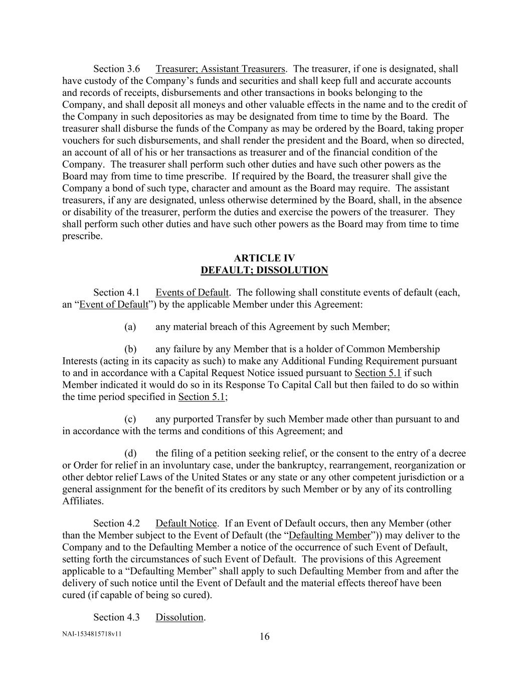 NAI-1534815718v11 16 Section 3.6 Treasurer; Assistant Treasurers. The treasurer, if one is designated, shall have custody of the Company’s funds and securities and shall keep full and accurate accounts and records of receipts, disbursements and other transactions in books belonging to the Company, and shall deposit all moneys and other valuable effects in the name and to the credit of the Company in such depositories as may be designated from time to time by the Board. The treasurer shall disburse the funds of the Company as may be ordered by the Board, taking proper vouchers for such disbursements, and shall render the president and the Board, when so directed, an account of all of his or her transactions as treasurer and of the financial condition of the Company. The treasurer shall perform such other duties and have such other powers as the Board may from time to time prescribe. If required by the Board, the treasurer shall give the Company a bond of such type, character and amount as the Board may require. The assistant treasurers, if any are designated, unless otherwise determined by the Board, shall, in the absence or disability of the treasurer, perform the duties and exercise the powers of the treasurer. They shall perform such other duties and have such other powers as the Board may from time to time prescribe. ARTICLE IV DEFAULT; DISSOLUTION Section 4.1 Events of Default. The following shall constitute events of default (each, an “Event of Default”) by the applicable Member under this Agreement: (a) any material breach of this Agreement by such Member; (b) any failure by any Member that is a holder of Common Membership Interests (acting in its capacity as such) to make any Additional Funding Requirement pursuant to and in accordance with a Capital Request Notice issued pursuant to Section 5.1 if such Member indicated it would do so in its Response To Capital Call but then failed to do so within the time period specified in Section 5.1; (c) any purported Transfer by such Member made other than pursuant to and in accordance with the terms and conditions of this Agreement; and (d) the filing of a petition seeking relief, or the consent to the entry of a decree or Order for relief in an involuntary case, under the bankruptcy, rearrangement, reorganization or other debtor relief Laws of the United States or any state or any other competent jurisdiction or a general assignment for the benefit of its creditors by such Member or by any of its controlling Affiliates. Section 4.2 Default Notice. If an Event of Default occurs, then any Member (other than the Member subject to the Event of Default (the “Defaulting Member”)) may deliver to the Company and to the Defaulting Member a notice of the occurrence of such Event of Default, setting forth the circumstances of such Event of Default. The provisions of this Agreement applicable to a “Defaulting Member” shall apply to such Defaulting Member from and after the delivery of such notice until the Event of Default and the material effects thereof have been cured (if capable of being so cured). Section 4.3 Dissolution.