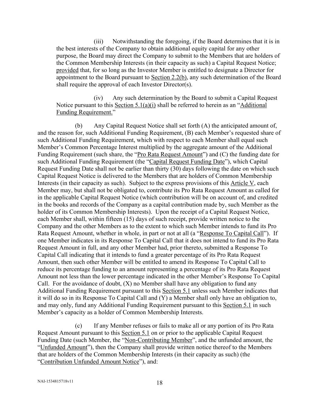 NAI-1534815718v11 18 (iii) Notwithstanding the foregoing, if the Board determines that it is in the best interests of the Company to obtain additional equity capital for any other purpose, the Board may direct the Company to submit to the Members that are holders of the Common Membership Interests (in their capacity as such) a Capital Request Notice; provided that, for so long as the Investor Member is entitled to designate a Director for appointment to the Board pursuant to Section 2.2(b), any such determination of the Board shall require the approval of each Investor Director(s). (iv) Any such determination by the Board to submit a Capital Request Notice pursuant to this Section 5.1(a)(i) shall be referred to herein as an “Additional Funding Requirement.” (b) Any Capital Request Notice shall set forth (A) the anticipated amount of, and the reason for, such Additional Funding Requirement, (B) each Member’s requested share of such Additional Funding Requirement, which with respect to each Member shall equal such Member’s Common Percentage Interest multiplied by the aggregate amount of the Additional Funding Requirement (such share, the “Pro Rata Request Amount”) and (C) the funding date for such Additional Funding Requirement (the “Capital Request Funding Date”), which Capital Request Funding Date shall not be earlier than thirty (30) days following the date on which such Capital Request Notice is delivered to the Members that are holders of Common Membership Interests (in their capacity as such). Subject to the express provisions of this Article V, each Member may, but shall not be obligated to, contribute its Pro Rata Request Amount as called for in the applicable Capital Request Notice (which contribution will be on account of, and credited in the books and records of the Company as a capital contribution made by, such Member as the holder of its Common Membership Interests). Upon the receipt of a Capital Request Notice, each Member shall, within fifteen (15) days of such receipt, provide written notice to the Company and the other Members as to the extent to which such Member intends to fund its Pro Rata Request Amount, whether in whole, in part or not at all (a “Response To Capital Call”). If one Member indicates in its Response To Capital Call that it does not intend to fund its Pro Rata Request Amount in full, and any other Member had, prior thereto, submitted a Response To Capital Call indicating that it intends to fund a greater percentage of its Pro Rata Request Amount, then such other Member will be entitled to amend its Response To Capital Call to reduce its percentage funding to an amount representing a percentage of its Pro Rata Request Amount not less than the lower percentage indicated in the other Member’s Response To Capital Call. For the avoidance of doubt, (X) no Member shall have any obligation to fund any Additional Funding Requirement pursuant to this Section 5.1 unless such Member indicates that it will do so in its Response To Capital Call and (Y) a Member shall only have an obligation to, and may only, fund any Additional Funding Requirement pursuant to this Section 5.1 in such Member’s capacity as a holder of Common Membership Interests. (c) If any Member refuses or fails to make all or any portion of its Pro Rata Request Amount pursuant to this Section 5.1 on or prior to the applicable Capital Request Funding Date (such Member, the “Non-Contributing Member”, and the unfunded amount, the “Unfunded Amount”), then the Company shall provide written notice thereof to the Members that are holders of the Common Membership Interests (in their capacity as such) (the “Contribution Unfunded Amount Notice”), and: