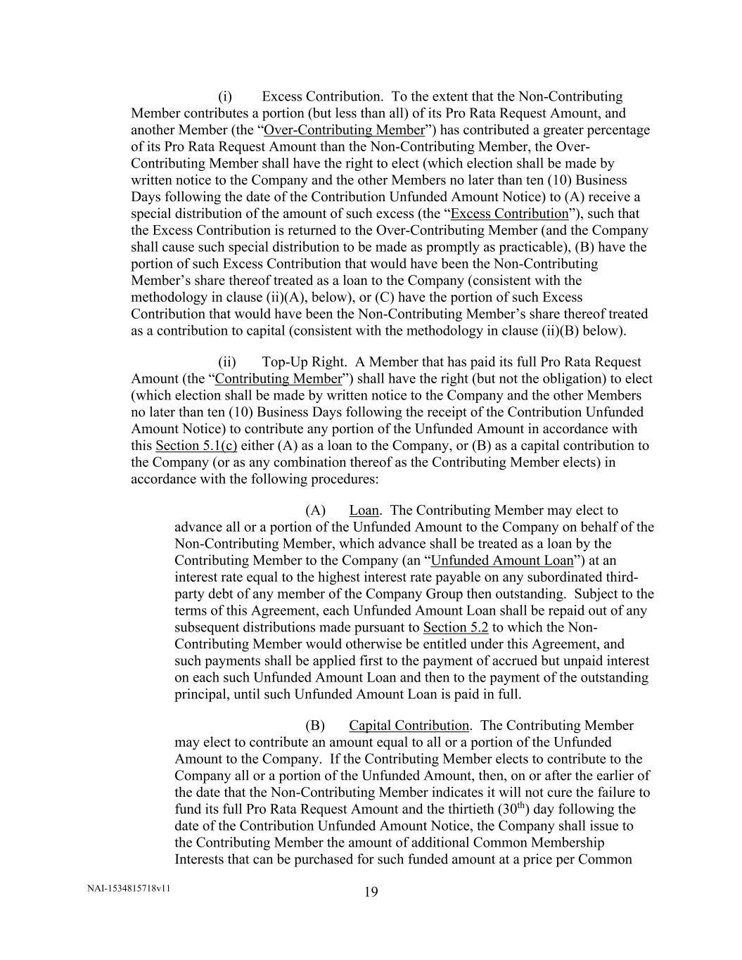 NAI-1534815718v11 19 (i) Excess Contribution. To the extent that the Non-Contributing Member contributes a portion (but less than all) of its Pro Rata Request Amount, and another Member (the “Over-Contributing Member”) has contributed a greater percentage of its Pro Rata Request Amount than the Non-Contributing Member, the Over- Contributing Member shall have the right to elect (which election shall be made by written notice to the Company and the other Members no later than ten (10) Business Days following the date of the Contribution Unfunded Amount Notice) to (A) receive a special distribution of the amount of such excess (the “Excess Contribution”), such that the Excess Contribution is returned to the Over-Contributing Member (and the Company shall cause such special distribution to be made as promptly as practicable), (B) have the portion of such Excess Contribution that would have been the Non-Contributing Member’s share thereof treated as a loan to the Company (consistent with the methodology in clause (ii)(A), below), or (C) have the portion of such Excess Contribution that would have been the Non-Contributing Member’s share thereof treated as a contribution to capital (consistent with the methodology in clause (ii)(B) below). (ii) Top-Up Right. A Member that has paid its full Pro Rata Request Amount (the “Contributing Member”) shall have the right (but not the obligation) to elect (which election shall be made by written notice to the Company and the other Members no later than ten (10) Business Days following the receipt of the Contribution Unfunded Amount Notice) to contribute any portion of the Unfunded Amount in accordance with this Section 5.1(c) either (A) as a loan to the Company, or (B) as a capital contribution to the Company (or as any combination thereof as the Contributing Member elects) in accordance with the following procedures: (A) Loan. The Contributing Member may elect to advance all or a portion of the Unfunded Amount to the Company on behalf of the Non-Contributing Member, which advance shall be treated as a loan by the Contributing Member to the Company (an “Unfunded Amount Loan”) at an interest rate equal to the highest interest rate payable on any subordinated third- party debt of any member of the Company Group then outstanding. Subject to the terms of this Agreement, each Unfunded Amount Loan shall be repaid out of any subsequent distributions made pursuant to Section 5.2 to which the Non- Contributing Member would otherwise be entitled under this Agreement, and such payments shall be applied first to the payment of accrued but unpaid interest on each such Unfunded Amount Loan and then to the payment of the outstanding principal, until such Unfunded Amount Loan is paid in full. (B) Capital Contribution. The Contributing Member may elect to contribute an amount equal to all or a portion of the Unfunded Amount to the Company. If the Contributing Member elects to contribute to the Company all or a portion of the Unfunded Amount, then, on or after the earlier of the date that the Non-Contributing Member indicates it will not cure the failure to fund its full Pro Rata Request Amount and the thirtieth (30th) day following the date of the Contribution Unfunded Amount Notice, the Company shall issue to the Contributing Member the amount of additional Common Membership Interests that can be purchased for such funded amount at a price per Common