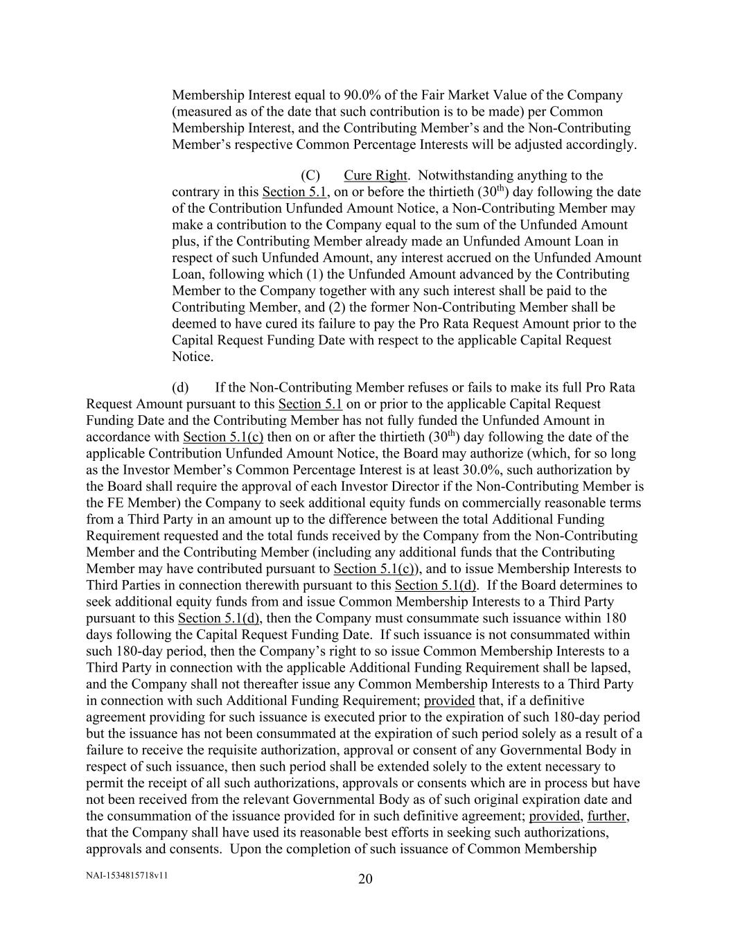 NAI-1534815718v11 20 Membership Interest equal to 90.0% of the Fair Market Value of the Company (measured as of the date that such contribution is to be made) per Common Membership Interest, and the Contributing Member’s and the Non-Contributing Member’s respective Common Percentage Interests will be adjusted accordingly. (C) Cure Right. Notwithstanding anything to the contrary in this Section 5.1, on or before the thirtieth (30th) day following the date of the Contribution Unfunded Amount Notice, a Non-Contributing Member may make a contribution to the Company equal to the sum of the Unfunded Amount plus, if the Contributing Member already made an Unfunded Amount Loan in respect of such Unfunded Amount, any interest accrued on the Unfunded Amount Loan, following which (1) the Unfunded Amount advanced by the Contributing Member to the Company together with any such interest shall be paid to the Contributing Member, and (2) the former Non-Contributing Member shall be deemed to have cured its failure to pay the Pro Rata Request Amount prior to the Capital Request Funding Date with respect to the applicable Capital Request Notice. (d) If the Non-Contributing Member refuses or fails to make its full Pro Rata Request Amount pursuant to this Section 5.1 on or prior to the applicable Capital Request Funding Date and the Contributing Member has not fully funded the Unfunded Amount in accordance with Section 5.1(c) then on or after the thirtieth (30th) day following the date of the applicable Contribution Unfunded Amount Notice, the Board may authorize (which, for so long as the Investor Member’s Common Percentage Interest is at least 30.0%, such authorization by the Board shall require the approval of each Investor Director if the Non-Contributing Member is the FE Member) the Company to seek additional equity funds on commercially reasonable terms from a Third Party in an amount up to the difference between the total Additional Funding Requirement requested and the total funds received by the Company from the Non-Contributing Member and the Contributing Member (including any additional funds that the Contributing Member may have contributed pursuant to Section 5.1(c)), and to issue Membership Interests to Third Parties in connection therewith pursuant to this Section 5.1(d). If the Board determines to seek additional equity funds from and issue Common Membership Interests to a Third Party pursuant to this Section 5.1(d), then the Company must consummate such issuance within 180 days following the Capital Request Funding Date. If such issuance is not consummated within such 180-day period, then the Company’s right to so issue Common Membership Interests to a Third Party in connection with the applicable Additional Funding Requirement shall be lapsed, and the Company shall not thereafter issue any Common Membership Interests to a Third Party in connection with such Additional Funding Requirement; provided that, if a definitive agreement providing for such issuance is executed prior to the expiration of such 180-day period but the issuance has not been consummated at the expiration of such period solely as a result of a failure to receive the requisite authorization, approval or consent of any Governmental Body in respect of such issuance, then such period shall be extended solely to the extent necessary to permit the receipt of all such authorizations, approvals or consents which are in process but have not been received from the relevant Governmental Body as of such original expiration date and the consummation of the issuance provided for in such definitive agreement; provided, further, that the Company shall have used its reasonable best efforts in seeking such authorizations, approvals and consents. Upon the completion of such issuance of Common Membership