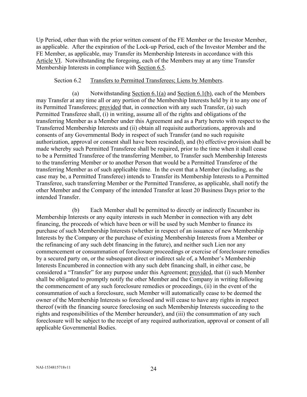 NAI-1534815718v11 24 Up Period, other than with the prior written consent of the FE Member or the Investor Member, as applicable. After the expiration of the Lock-up Period, each of the Investor Member and the FE Member, as applicable, may Transfer its Membership Interests in accordance with this Article VI. Notwithstanding the foregoing, each of the Members may at any time Transfer Membership Interests in compliance with Section 6.5. Section 6.2 Transfers to Permitted Transferees; Liens by Members. (a) Notwithstanding Section 6.1(a) and Section 6.1(b), each of the Members may Transfer at any time all or any portion of the Membership Interests held by it to any one of its Permitted Transferees; provided that, in connection with any such Transfer, (a) such Permitted Transferee shall, (i) in writing, assume all of the rights and obligations of the transferring Member as a Member under this Agreement and as a Party hereto with respect to the Transferred Membership Interests and (ii) obtain all requisite authorizations, approvals and consents of any Governmental Body in respect of such Transfer (and no such requisite authorization, approval or consent shall have been rescinded), and (b) effective provision shall be made whereby such Permitted Transferee shall be required, prior to the time when it shall cease to be a Permitted Transferee of the transferring Member, to Transfer such Membership Interests to the transferring Member or to another Person that would be a Permitted Transferee of the transferring Member as of such applicable time. In the event that a Member (including, as the case may be, a Permitted Transferee) intends to Transfer its Membership Interests to a Permitted Transferee, such transferring Member or the Permitted Transferee, as applicable, shall notify the other Member and the Company of the intended Transfer at least 20 Business Days prior to the intended Transfer. (b) Each Member shall be permitted to directly or indirectly Encumber its Membership Interests or any equity interests in such Member in connection with any debt financing, the proceeds of which have been or will be used by such Member to finance its purchase of such Membership Interests (whether in respect of an issuance of new Membership Interests by the Company or the purchase of existing Membership Interests from a Member or the refinancing of any such debt financing in the future), and neither such Lien nor any commencement or consummation of foreclosure proceedings or exercise of foreclosure remedies by a secured party on, or the subsequent direct or indirect sale of, a Member’s Membership Interests Encumbered in connection with any such debt financing shall, in either case, be considered a “Transfer” for any purpose under this Agreement; provided, that (i) such Member shall be obligated to promptly notify the other Member and the Company in writing following the commencement of any such foreclosure remedies or proceedings, (ii) in the event of the consummation of such a foreclosure, such Member will automatically cease to be deemed the owner of the Membership Interests so foreclosed and will cease to have any rights in respect thereof (with the financing source foreclosing on such Membership Interests succeeding to the rights and responsibilities of the Member hereunder), and (iii) the consummation of any such foreclosure will be subject to the receipt of any required authorization, approval or consent of all applicable Governmental Bodies.