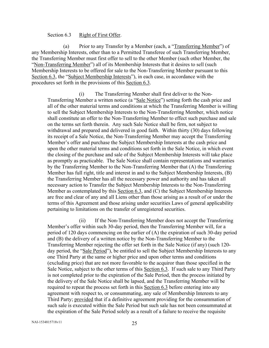 NAI-1534815718v11 25 Section 6.3 Right of First Offer. (a) Prior to any Transfer by a Member (each, a “Transferring Member”) of any Membership Interests, other than to a Permitted Transferee of such Transferring Member, the Transferring Member must first offer to sell to the other Member (such other Member, the “Non-Transferring Member”) all of its Membership Interests that it desires to sell (such Membership Interests to be offered for sale to the Non-Transferring Member pursuant to this Section 6.3, the “Subject Membership Interests”), in each case, in accordance with the procedures set forth in the provisions of this Section 6.3. (i) The Transferring Member shall first deliver to the Non- Transferring Member a written notice (a “Sale Notice”) setting forth the cash price and all of the other material terms and conditions at which the Transferring Member is willing to sell the Subject Membership Interests to the Non-Transferring Member, which notice shall constitute an offer to the Non-Transferring Member to effect such purchase and sale on the terms set forth therein. Any such Sale Notice shall be firm, not subject to withdrawal and prepared and delivered in good faith. Within thirty (30) days following its receipt of a Sale Notice, the Non-Transferring Member may accept the Transferring Member’s offer and purchase the Subject Membership Interests at the cash price and upon the other material terms and conditions set forth in the Sale Notice, in which event the closing of the purchase and sale of the Subject Membership Interests will take place as promptly as practicable. The Sale Notice shall contain representations and warranties by the Transferring Member to the Non-Transferring Member that (A) the Transferring Member has full right, title and interest in and to the Subject Membership Interests, (B) the Transferring Member has all the necessary power and authority and has taken all necessary action to Transfer the Subject Membership Interests to the Non-Transferring Member as contemplated by this Section 6.3, and (C) the Subject Membership Interests are free and clear of any and all Liens other than those arising as a result of or under the terms of this Agreement and those arising under securities Laws of general applicability pertaining to limitations on the transfer of unregistered securities. (ii) If the Non-Transferring Member does not accept the Transferring Member’s offer within such 30-day period, then the Transferring Member will, for a period of 120 days commencing on the earlier of (A) the expiration of such 30-day period and (B) the delivery of a written notice by the Non-Transferring Member to the Transferring Member rejecting the offer set forth in the Sale Notice (if any) (such 120- day period, the “Sale Period”), be entitled to sell the Subject Membership Interests to any one Third Party at the same or higher price and upon other terms and conditions (excluding price) that are not more favorable to the acquiror than those specified in the Sale Notice, subject to the other terms of this Section 6.3. If such sale to any Third Party is not completed prior to the expiration of the Sale Period, then the process initiated by the delivery of the Sale Notice shall be lapsed, and the Transferring Member will be required to repeat the process set forth in this Section 6.3 before entering into any agreement with respect to, or consummating, any sale of Membership Interests to any Third Party; provided that if a definitive agreement providing for the consummation of such sale is executed within the Sale Period but such sale has not been consummated at the expiration of the Sale Period solely as a result of a failure to receive the requisite