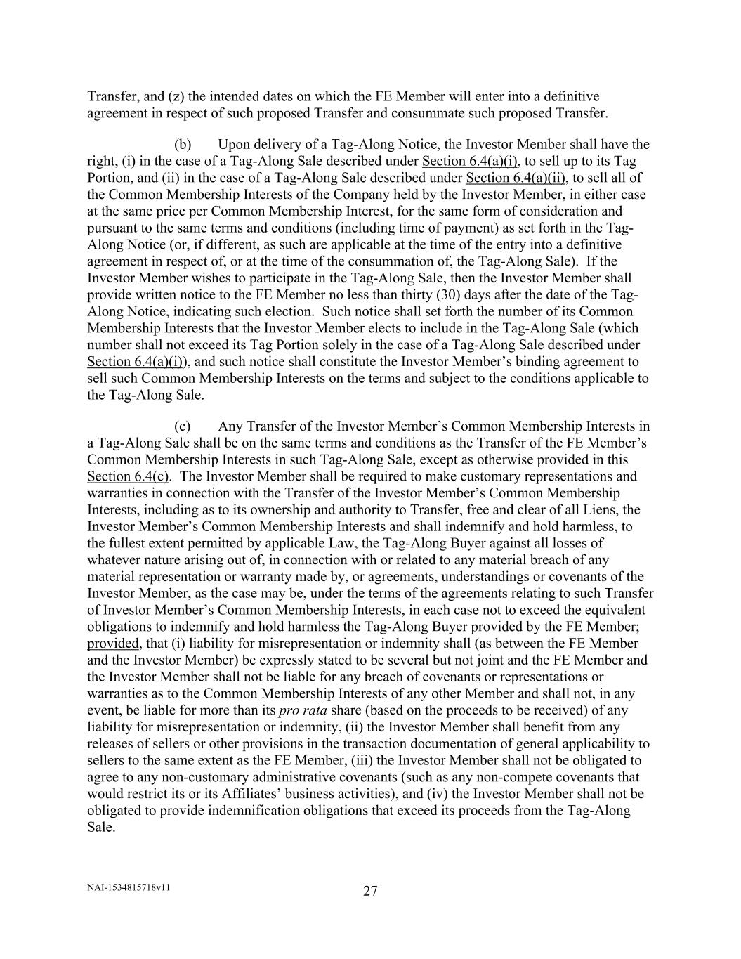 NAI-1534815718v11 27 Transfer, and (z) the intended dates on which the FE Member will enter into a definitive agreement in respect of such proposed Transfer and consummate such proposed Transfer. (b) Upon delivery of a Tag-Along Notice, the Investor Member shall have the right, (i) in the case of a Tag-Along Sale described under Section 6.4(a)(i), to sell up to its Tag Portion, and (ii) in the case of a Tag-Along Sale described under Section 6.4(a)(ii), to sell all of the Common Membership Interests of the Company held by the Investor Member, in either case at the same price per Common Membership Interest, for the same form of consideration and pursuant to the same terms and conditions (including time of payment) as set forth in the Tag- Along Notice (or, if different, as such are applicable at the time of the entry into a definitive agreement in respect of, or at the time of the consummation of, the Tag-Along Sale). If the Investor Member wishes to participate in the Tag-Along Sale, then the Investor Member shall provide written notice to the FE Member no less than thirty (30) days after the date of the Tag- Along Notice, indicating such election. Such notice shall set forth the number of its Common Membership Interests that the Investor Member elects to include in the Tag-Along Sale (which number shall not exceed its Tag Portion solely in the case of a Tag-Along Sale described under Section 6.4(a)(i)), and such notice shall constitute the Investor Member’s binding agreement to sell such Common Membership Interests on the terms and subject to the conditions applicable to the Tag-Along Sale. (c) Any Transfer of the Investor Member’s Common Membership Interests in a Tag-Along Sale shall be on the same terms and conditions as the Transfer of the FE Member’s Common Membership Interests in such Tag-Along Sale, except as otherwise provided in this Section 6.4(c). The Investor Member shall be required to make customary representations and warranties in connection with the Transfer of the Investor Member’s Common Membership Interests, including as to its ownership and authority to Transfer, free and clear of all Liens, the Investor Member’s Common Membership Interests and shall indemnify and hold harmless, to the fullest extent permitted by applicable Law, the Tag-Along Buyer against all losses of whatever nature arising out of, in connection with or related to any material breach of any material representation or warranty made by, or agreements, understandings or covenants of the Investor Member, as the case may be, under the terms of the agreements relating to such Transfer of Investor Member’s Common Membership Interests, in each case not to exceed the equivalent obligations to indemnify and hold harmless the Tag-Along Buyer provided by the FE Member; provided, that (i) liability for misrepresentation or indemnity shall (as between the FE Member and the Investor Member) be expressly stated to be several but not joint and the FE Member and the Investor Member shall not be liable for any breach of covenants or representations or warranties as to the Common Membership Interests of any other Member and shall not, in any event, be liable for more than its pro rata share (based on the proceeds to be received) of any liability for misrepresentation or indemnity, (ii) the Investor Member shall benefit from any releases of sellers or other provisions in the transaction documentation of general applicability to sellers to the same extent as the FE Member, (iii) the Investor Member shall not be obligated to agree to any non-customary administrative covenants (such as any non-compete covenants that would restrict its or its Affiliates’ business activities), and (iv) the Investor Member shall not be obligated to provide indemnification obligations that exceed its proceeds from the Tag-Along Sale.
