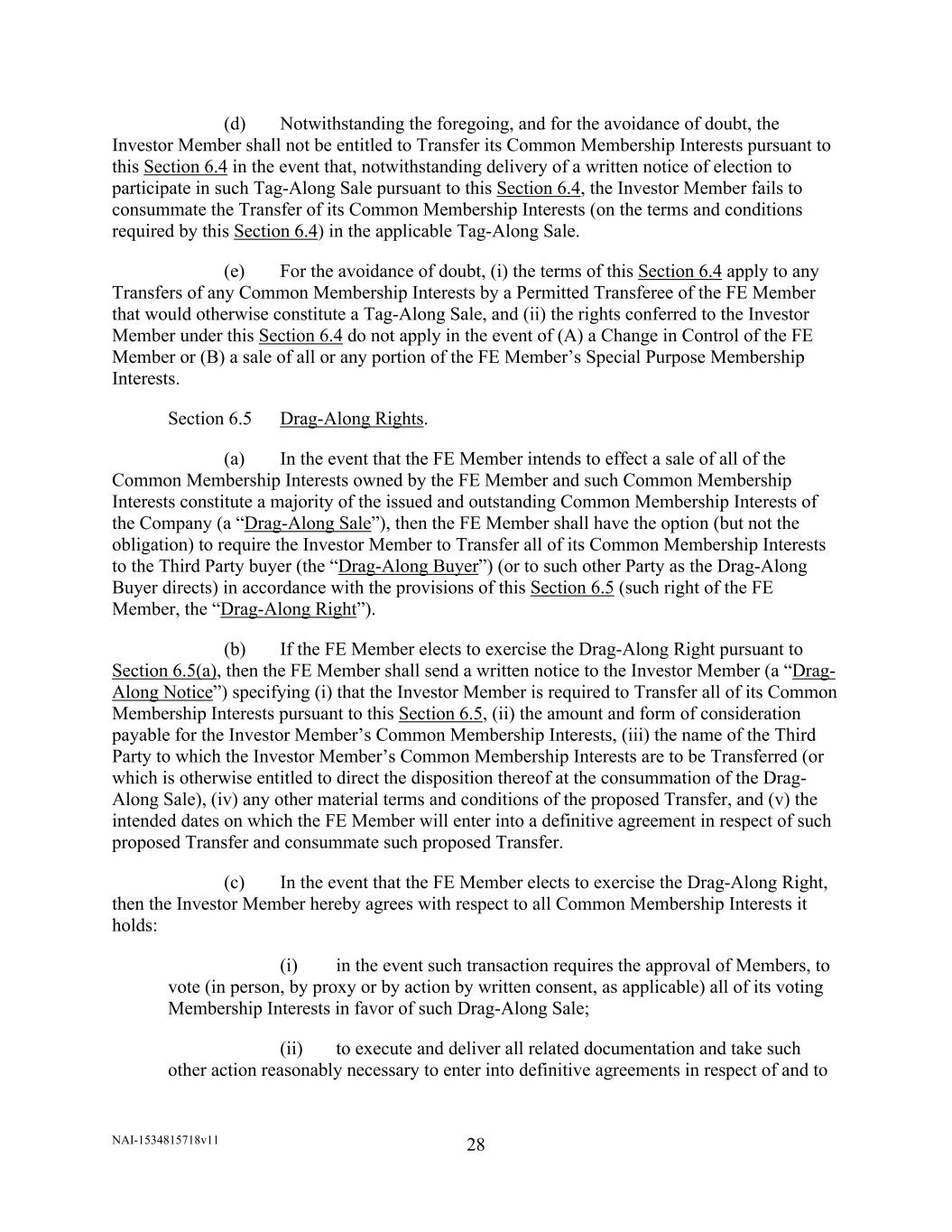 NAI-1534815718v11 28 (d) Notwithstanding the foregoing, and for the avoidance of doubt, the Investor Member shall not be entitled to Transfer its Common Membership Interests pursuant to this Section 6.4 in the event that, notwithstanding delivery of a written notice of election to participate in such Tag-Along Sale pursuant to this Section 6.4, the Investor Member fails to consummate the Transfer of its Common Membership Interests (on the terms and conditions required by this Section 6.4) in the applicable Tag-Along Sale. (e) For the avoidance of doubt, (i) the terms of this Section 6.4 apply to any Transfers of any Common Membership Interests by a Permitted Transferee of the FE Member that would otherwise constitute a Tag-Along Sale, and (ii) the rights conferred to the Investor Member under this Section 6.4 do not apply in the event of (A) a Change in Control of the FE Member or (B) a sale of all or any portion of the FE Member’s Special Purpose Membership Interests. Section 6.5 Drag-Along Rights. (a) In the event that the FE Member intends to effect a sale of all of the Common Membership Interests owned by the FE Member and such Common Membership Interests constitute a majority of the issued and outstanding Common Membership Interests of the Company (a “Drag-Along Sale”), then the FE Member shall have the option (but not the obligation) to require the Investor Member to Transfer all of its Common Membership Interests to the Third Party buyer (the “Drag-Along Buyer”) (or to such other Party as the Drag-Along Buyer directs) in accordance with the provisions of this Section 6.5 (such right of the FE Member, the “Drag-Along Right”). (b) If the FE Member elects to exercise the Drag-Along Right pursuant to Section 6.5(a), then the FE Member shall send a written notice to the Investor Member (a “Drag- Along Notice”) specifying (i) that the Investor Member is required to Transfer all of its Common Membership Interests pursuant to this Section 6.5, (ii) the amount and form of consideration payable for the Investor Member’s Common Membership Interests, (iii) the name of the Third Party to which the Investor Member’s Common Membership Interests are to be Transferred (or which is otherwise entitled to direct the disposition thereof at the consummation of the Drag- Along Sale), (iv) any other material terms and conditions of the proposed Transfer, and (v) the intended dates on which the FE Member will enter into a definitive agreement in respect of such proposed Transfer and consummate such proposed Transfer. (c) In the event that the FE Member elects to exercise the Drag-Along Right, then the Investor Member hereby agrees with respect to all Common Membership Interests it holds: (i) in the event such transaction requires the approval of Members, to vote (in person, by proxy or by action by written consent, as applicable) all of its voting Membership Interests in favor of such Drag-Along Sale; (ii) to execute and deliver all related documentation and take such other action reasonably necessary to enter into definitive agreements in respect of and to