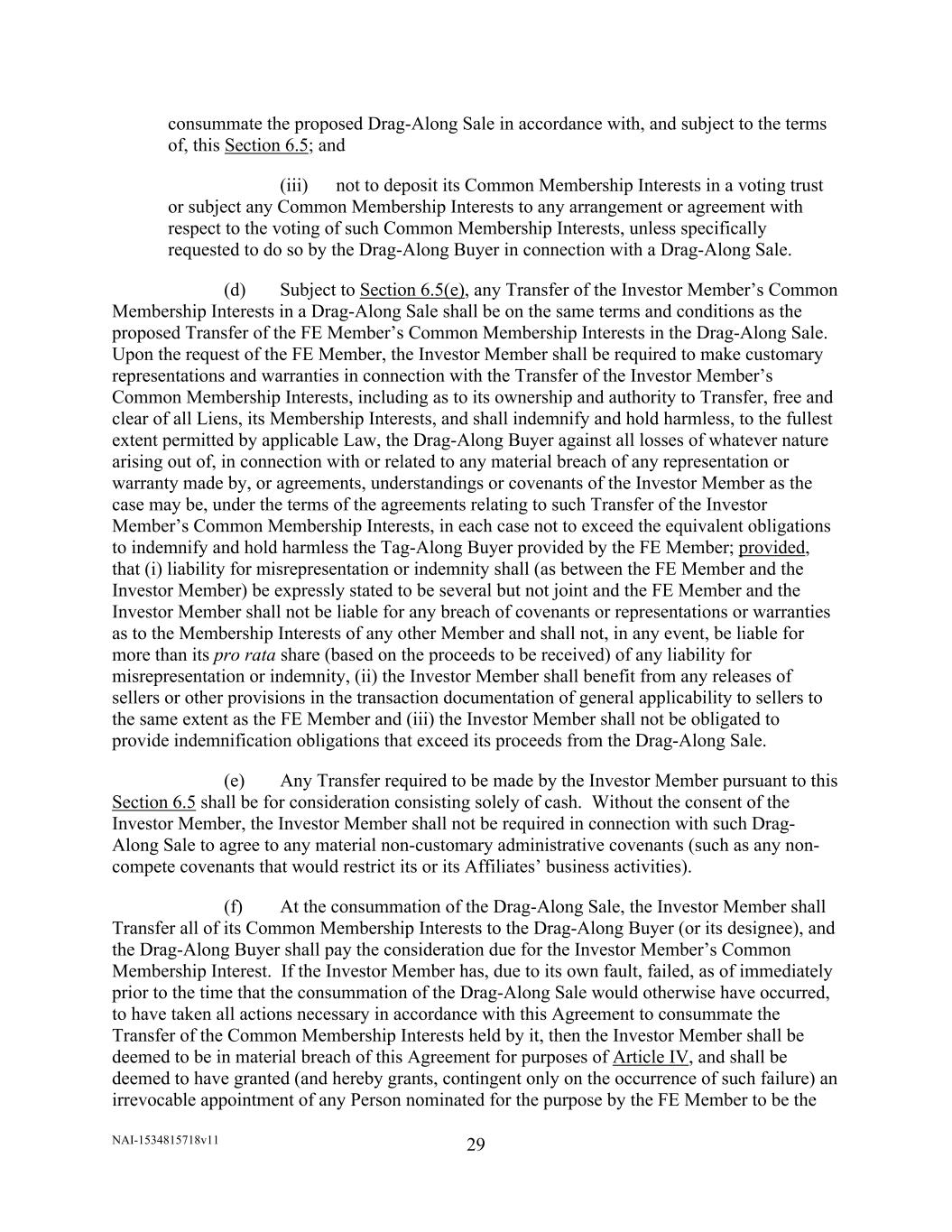 NAI-1534815718v11 29 consummate the proposed Drag-Along Sale in accordance with, and subject to the terms of, this Section 6.5; and (iii) not to deposit its Common Membership Interests in a voting trust or subject any Common Membership Interests to any arrangement or agreement with respect to the voting of such Common Membership Interests, unless specifically requested to do so by the Drag-Along Buyer in connection with a Drag-Along Sale. (d) Subject to Section 6.5(e), any Transfer of the Investor Member’s Common Membership Interests in a Drag-Along Sale shall be on the same terms and conditions as the proposed Transfer of the FE Member’s Common Membership Interests in the Drag-Along Sale. Upon the request of the FE Member, the Investor Member shall be required to make customary representations and warranties in connection with the Transfer of the Investor Member’s Common Membership Interests, including as to its ownership and authority to Transfer, free and clear of all Liens, its Membership Interests, and shall indemnify and hold harmless, to the fullest extent permitted by applicable Law, the Drag-Along Buyer against all losses of whatever nature arising out of, in connection with or related to any material breach of any representation or warranty made by, or agreements, understandings or covenants of the Investor Member as the case may be, under the terms of the agreements relating to such Transfer of the Investor Member’s Common Membership Interests, in each case not to exceed the equivalent obligations to indemnify and hold harmless the Tag-Along Buyer provided by the FE Member; provided, that (i) liability for misrepresentation or indemnity shall (as between the FE Member and the Investor Member) be expressly stated to be several but not joint and the FE Member and the Investor Member shall not be liable for any breach of covenants or representations or warranties as to the Membership Interests of any other Member and shall not, in any event, be liable for more than its pro rata share (based on the proceeds to be received) of any liability for misrepresentation or indemnity, (ii) the Investor Member shall benefit from any releases of sellers or other provisions in the transaction documentation of general applicability to sellers to the same extent as the FE Member and (iii) the Investor Member shall not be obligated to provide indemnification obligations that exceed its proceeds from the Drag-Along Sale. (e) Any Transfer required to be made by the Investor Member pursuant to this Section 6.5 shall be for consideration consisting solely of cash. Without the consent of the Investor Member, the Investor Member shall not be required in connection with such Drag- Along Sale to agree to any material non-customary administrative covenants (such as any non- compete covenants that would restrict its or its Affiliates’ business activities). (f) At the consummation of the Drag-Along Sale, the Investor Member shall Transfer all of its Common Membership Interests to the Drag-Along Buyer (or its designee), and the Drag-Along Buyer shall pay the consideration due for the Investor Member’s Common Membership Interest. If the Investor Member has, due to its own fault, failed, as of immediately prior to the time that the consummation of the Drag-Along Sale would otherwise have occurred, to have taken all actions necessary in accordance with this Agreement to consummate the Transfer of the Common Membership Interests held by it, then the Investor Member shall be deemed to be in material breach of this Agreement for purposes of Article IV, and shall be deemed to have granted (and hereby grants, contingent only on the occurrence of such failure) an irrevocable appointment of any Person nominated for the purpose by the FE Member to be the