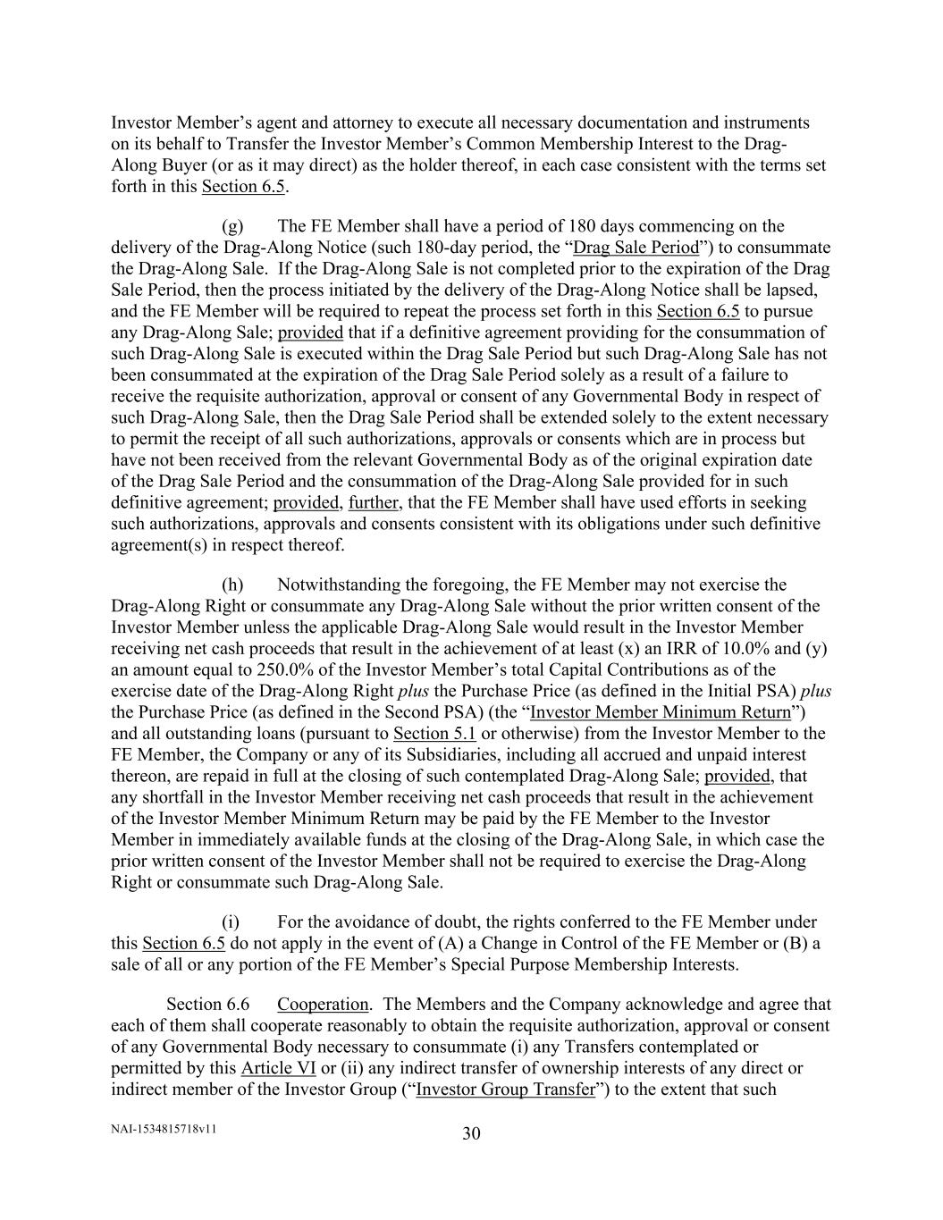 NAI-1534815718v11 30 Investor Member’s agent and attorney to execute all necessary documentation and instruments on its behalf to Transfer the Investor Member’s Common Membership Interest to the Drag- Along Buyer (or as it may direct) as the holder thereof, in each case consistent with the terms set forth in this Section 6.5. (g) The FE Member shall have a period of 180 days commencing on the delivery of the Drag-Along Notice (such 180-day period, the “Drag Sale Period”) to consummate the Drag-Along Sale. If the Drag-Along Sale is not completed prior to the expiration of the Drag Sale Period, then the process initiated by the delivery of the Drag-Along Notice shall be lapsed, and the FE Member will be required to repeat the process set forth in this Section 6.5 to pursue any Drag-Along Sale; provided that if a definitive agreement providing for the consummation of such Drag-Along Sale is executed within the Drag Sale Period but such Drag-Along Sale has not been consummated at the expiration of the Drag Sale Period solely as a result of a failure to receive the requisite authorization, approval or consent of any Governmental Body in respect of such Drag-Along Sale, then the Drag Sale Period shall be extended solely to the extent necessary to permit the receipt of all such authorizations, approvals or consents which are in process but have not been received from the relevant Governmental Body as of the original expiration date of the Drag Sale Period and the consummation of the Drag-Along Sale provided for in such definitive agreement; provided, further, that the FE Member shall have used efforts in seeking such authorizations, approvals and consents consistent with its obligations under such definitive agreement(s) in respect thereof. (h) Notwithstanding the foregoing, the FE Member may not exercise the Drag-Along Right or consummate any Drag-Along Sale without the prior written consent of the Investor Member unless the applicable Drag-Along Sale would result in the Investor Member receiving net cash proceeds that result in the achievement of at least (x) an IRR of 10.0% and (y) an amount equal to 250.0% of the Investor Member’s total Capital Contributions as of the exercise date of the Drag-Along Right plus the Purchase Price (as defined in the Initial PSA) plus the Purchase Price (as defined in the Second PSA) (the “Investor Member Minimum Return”) and all outstanding loans (pursuant to Section 5.1 or otherwise) from the Investor Member to the FE Member, the Company or any of its Subsidiaries, including all accrued and unpaid interest thereon, are repaid in full at the closing of such contemplated Drag-Along Sale; provided, that any shortfall in the Investor Member receiving net cash proceeds that result in the achievement of the Investor Member Minimum Return may be paid by the FE Member to the Investor Member in immediately available funds at the closing of the Drag-Along Sale, in which case the prior written consent of the Investor Member shall not be required to exercise the Drag-Along Right or consummate such Drag-Along Sale. (i) For the avoidance of doubt, the rights conferred to the FE Member under this Section 6.5 do not apply in the event of (A) a Change in Control of the FE Member or (B) a sale of all or any portion of the FE Member’s Special Purpose Membership Interests. Section 6.6 Cooperation. The Members and the Company acknowledge and agree that each of them shall cooperate reasonably to obtain the requisite authorization, approval or consent of any Governmental Body necessary to consummate (i) any Transfers contemplated or permitted by this Article VI or (ii) any indirect transfer of ownership interests of any direct or indirect member of the Investor Group (“Investor Group Transfer”) to the extent that such