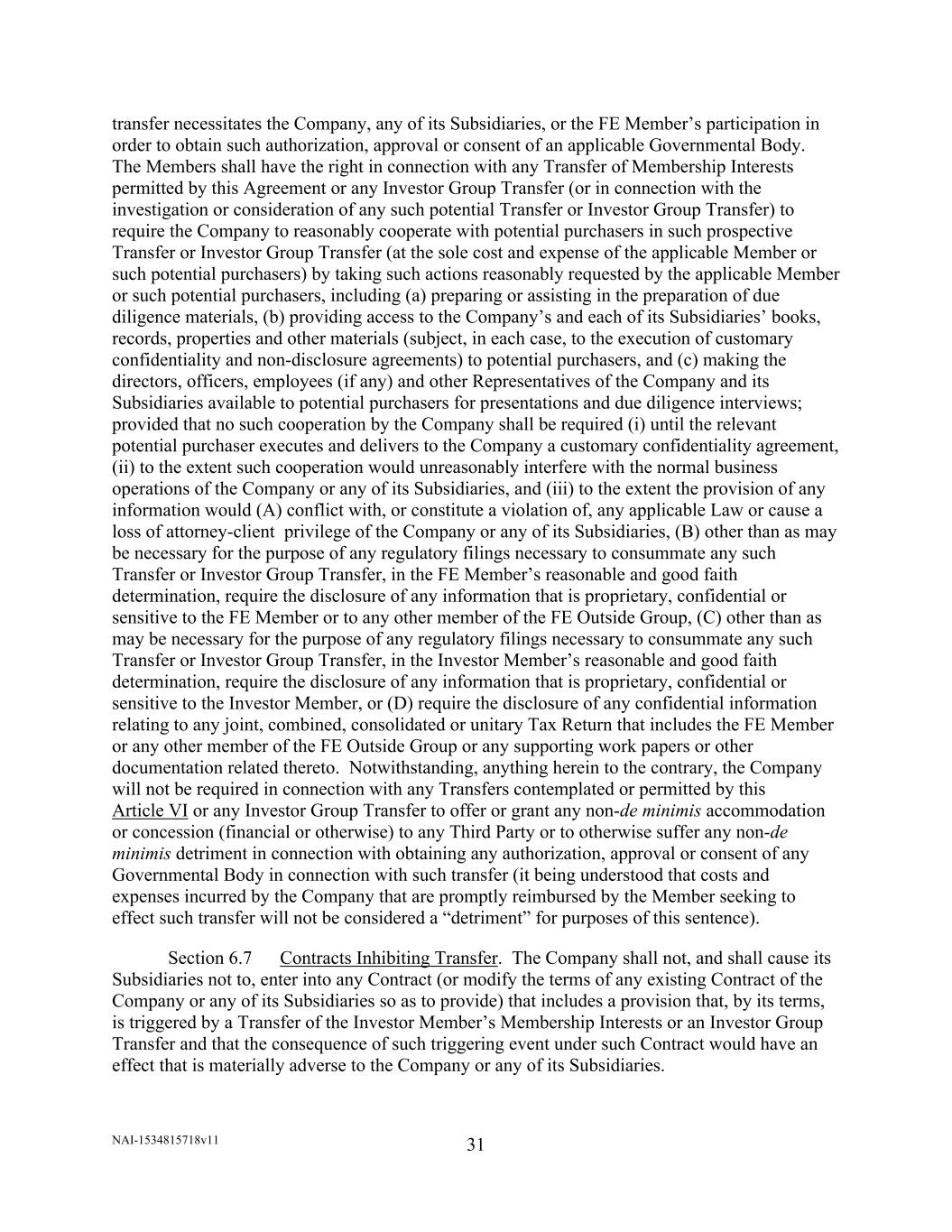 NAI-1534815718v11 31 transfer necessitates the Company, any of its Subsidiaries, or the FE Member’s participation in order to obtain such authorization, approval or consent of an applicable Governmental Body. The Members shall have the right in connection with any Transfer of Membership Interests permitted by this Agreement or any Investor Group Transfer (or in connection with the investigation or consideration of any such potential Transfer or Investor Group Transfer) to require the Company to reasonably cooperate with potential purchasers in such prospective Transfer or Investor Group Transfer (at the sole cost and expense of the applicable Member or such potential purchasers) by taking such actions reasonably requested by the applicable Member or such potential purchasers, including (a) preparing or assisting in the preparation of due diligence materials, (b) providing access to the Company’s and each of its Subsidiaries’ books, records, properties and other materials (subject, in each case, to the execution of customary confidentiality and non-disclosure agreements) to potential purchasers, and (c) making the directors, officers, employees (if any) and other Representatives of the Company and its Subsidiaries available to potential purchasers for presentations and due diligence interviews; provided that no such cooperation by the Company shall be required (i) until the relevant potential purchaser executes and delivers to the Company a customary confidentiality agreement, (ii) to the extent such cooperation would unreasonably interfere with the normal business operations of the Company or any of its Subsidiaries, and (iii) to the extent the provision of any information would (A) conflict with, or constitute a violation of, any applicable Law or cause a loss of attorney-client privilege of the Company or any of its Subsidiaries, (B) other than as may be necessary for the purpose of any regulatory filings necessary to consummate any such Transfer or Investor Group Transfer, in the FE Member’s reasonable and good faith determination, require the disclosure of any information that is proprietary, confidential or sensitive to the FE Member or to any other member of the FE Outside Group, (C) other than as may be necessary for the purpose of any regulatory filings necessary to consummate any such Transfer or Investor Group Transfer, in the Investor Member’s reasonable and good faith determination, require the disclosure of any information that is proprietary, confidential or sensitive to the Investor Member, or (D) require the disclosure of any confidential information relating to any joint, combined, consolidated or unitary Tax Return that includes the FE Member or any other member of the FE Outside Group or any supporting work papers or other documentation related thereto. Notwithstanding, anything herein to the contrary, the Company will not be required in connection with any Transfers contemplated or permitted by this Article VI or any Investor Group Transfer to offer or grant any non-de minimis accommodation or concession (financial or otherwise) to any Third Party or to otherwise suffer any non-de minimis detriment in connection with obtaining any authorization, approval or consent of any Governmental Body in connection with such transfer (it being understood that costs and expenses incurred by the Company that are promptly reimbursed by the Member seeking to effect such transfer will not be considered a “detriment” for purposes of this sentence). Section 6.7 Contracts Inhibiting Transfer. The Company shall not, and shall cause its Subsidiaries not to, enter into any Contract (or modify the terms of any existing Contract of the Company or any of its Subsidiaries so as to provide) that includes a provision that, by its terms, is triggered by a Transfer of the Investor Member’s Membership Interests or an Investor Group Transfer and that the consequence of such triggering event under such Contract would have an effect that is materially adverse to the Company or any of its Subsidiaries.