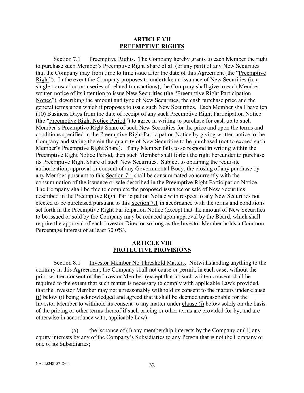 NAI-1534815718v11 32 ARTICLE VII PREEMPTIVE RIGHTS Section 7.1 Preemptive Rights. The Company hereby grants to each Member the right to purchase such Member’s Preemptive Right Share of all (or any part) of any New Securities that the Company may from time to time issue after the date of this Agreement (the “Preemptive Right”). In the event the Company proposes to undertake an issuance of New Securities (in a single transaction or a series of related transactions), the Company shall give to each Member written notice of its intention to issue New Securities (the “Preemptive Right Participation Notice”), describing the amount and type of New Securities, the cash purchase price and the general terms upon which it proposes to issue such New Securities. Each Member shall have ten (10) Business Days from the date of receipt of any such Preemptive Right Participation Notice (the “Preemptive Right Notice Period”) to agree in writing to purchase for cash up to such Member’s Preemptive Right Share of such New Securities for the price and upon the terms and conditions specified in the Preemptive Right Participation Notice by giving written notice to the Company and stating therein the quantity of New Securities to be purchased (not to exceed such Member’s Preemptive Right Share). If any Member fails to so respond in writing within the Preemptive Right Notice Period, then such Member shall forfeit the right hereunder to purchase its Preemptive Right Share of such New Securities. Subject to obtaining the requisite authorization, approval or consent of any Governmental Body, the closing of any purchase by any Member pursuant to this Section 7.1 shall be consummated concurrently with the consummation of the issuance or sale described in the Preemptive Right Participation Notice. The Company shall be free to complete the proposed issuance or sale of New Securities described in the Preemptive Right Participation Notice with respect to any New Securities not elected to be purchased pursuant to this Section 7.1 in accordance with the terms and conditions set forth in the Preemptive Right Participation Notice (except that the amount of New Securities to be issued or sold by the Company may be reduced upon approval by the Board, which shall require the approval of each Investor Director so long as the Investor Member holds a Common Percentage Interest of at least 30.0%). ARTICLE VIII PROTECTIVE PROVISIONS Section 8.1 Investor Member No Threshold Matters. Notwithstanding anything to the contrary in this Agreement, the Company shall not cause or permit, in each case, without the prior written consent of the Investor Member (except that no such written consent shall be required to the extent that such matter is necessary to comply with applicable Law); provided, that the Investor Member may not unreasonably withhold its consent to the matters under clause (i) below (it being acknowledged and agreed that it shall be deemed unreasonable for the Investor Member to withhold its consent to any matter under clause (i) below solely on the basis of the pricing or other terms thereof if such pricing or other terms are provided for by, and are otherwise in accordance with, applicable Law): (a) the issuance of (i) any membership interests by the Company or (ii) any equity interests by any of the Company’s Subsidiaries to any Person that is not the Company or one of its Subsidiaries;
