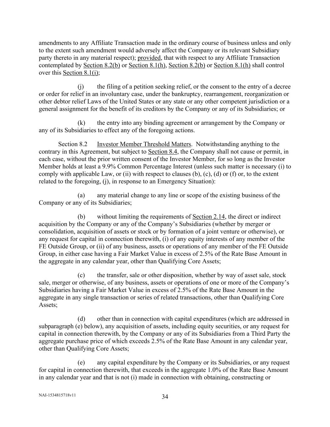 NAI-1534815718v11 34 amendments to any Affiliate Transaction made in the ordinary course of business unless and only to the extent such amendment would adversely affect the Company or its relevant Subsidiary party thereto in any material respect); provided, that with respect to any Affiliate Transaction contemplated by Section 8.2(b) or Section 8.1(h), Section 8.2(b) or Section 8.1(h) shall control over this Section 8.1(i); (j) the filing of a petition seeking relief, or the consent to the entry of a decree or order for relief in an involuntary case, under the bankruptcy, rearrangement, reorganization or other debtor relief Laws of the United States or any state or any other competent jurisdiction or a general assignment for the benefit of its creditors by the Company or any of its Subsidiaries; or (k) the entry into any binding agreement or arrangement by the Company or any of its Subsidiaries to effect any of the foregoing actions. Section 8.2 Investor Member Threshold Matters. Notwithstanding anything to the contrary in this Agreement, but subject to Section 8.4, the Company shall not cause or permit, in each case, without the prior written consent of the Investor Member, for so long as the Investor Member holds at least a 9.9% Common Percentage Interest (unless such matter is necessary (i) to comply with applicable Law, or (ii) with respect to clauses (b), (c), (d) or (f) or, to the extent related to the foregoing, (j), in response to an Emergency Situation): (a) any material change to any line or scope of the existing business of the Company or any of its Subsidiaries; (b) without limiting the requirements of Section 2.14, the direct or indirect acquisition by the Company or any of the Company’s Subsidiaries (whether by merger or consolidation, acquisition of assets or stock or by formation of a joint venture or otherwise), or any request for capital in connection therewith, (i) of any equity interests of any member of the FE Outside Group, or (ii) of any business, assets or operations of any member of the FE Outside Group, in either case having a Fair Market Value in excess of 2.5% of the Rate Base Amount in the aggregate in any calendar year, other than Qualifying Core Assets; (c) the transfer, sale or other disposition, whether by way of asset sale, stock sale, merger or otherwise, of any business, assets or operations of one or more of the Company’s Subsidiaries having a Fair Market Value in excess of 2.5% of the Rate Base Amount in the aggregate in any single transaction or series of related transactions, other than Qualifying Core Assets; (d) other than in connection with capital expenditures (which are addressed in subparagraph (e) below), any acquisition of assets, including equity securities, or any request for capital in connection therewith, by the Company or any of its Subsidiaries from a Third Party the aggregate purchase price of which exceeds 2.5% of the Rate Base Amount in any calendar year, other than Qualifying Core Assets; (e) any capital expenditure by the Company or its Subsidiaries, or any request for capital in connection therewith, that exceeds in the aggregate 1.0% of the Rate Base Amount in any calendar year and that is not (i) made in connection with obtaining, constructing or