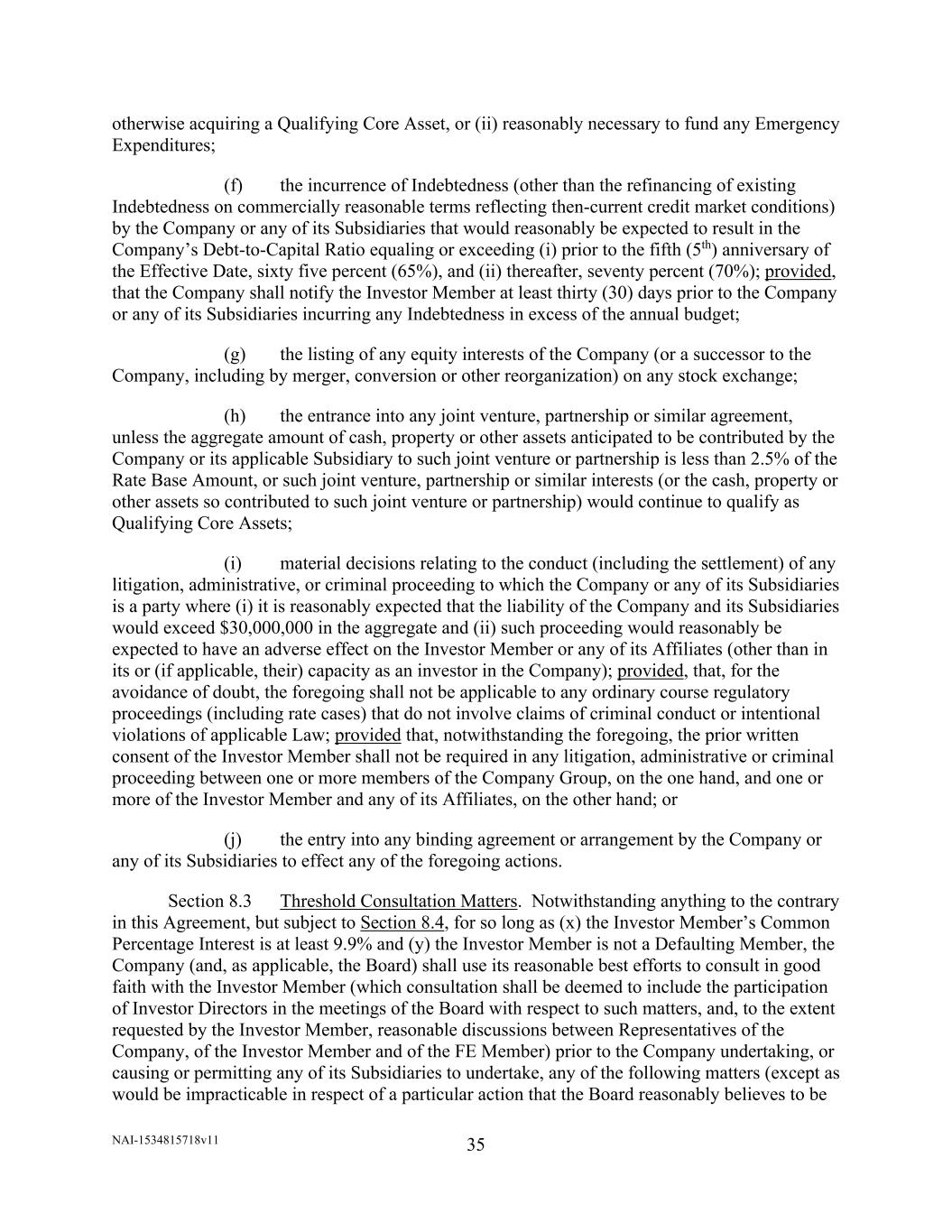 NAI-1534815718v11 35 otherwise acquiring a Qualifying Core Asset, or (ii) reasonably necessary to fund any Emergency Expenditures; (f) the incurrence of Indebtedness (other than the refinancing of existing Indebtedness on commercially reasonable terms reflecting then-current credit market conditions) by the Company or any of its Subsidiaries that would reasonably be expected to result in the Company’s Debt-to-Capital Ratio equaling or exceeding (i) prior to the fifth (5th) anniversary of the Effective Date, sixty five percent (65%), and (ii) thereafter, seventy percent (70%); provided, that the Company shall notify the Investor Member at least thirty (30) days prior to the Company or any of its Subsidiaries incurring any Indebtedness in excess of the annual budget; (g) the listing of any equity interests of the Company (or a successor to the Company, including by merger, conversion or other reorganization) on any stock exchange; (h) the entrance into any joint venture, partnership or similar agreement, unless the aggregate amount of cash, property or other assets anticipated to be contributed by the Company or its applicable Subsidiary to such joint venture or partnership is less than 2.5% of the Rate Base Amount, or such joint venture, partnership or similar interests (or the cash, property or other assets so contributed to such joint venture or partnership) would continue to qualify as Qualifying Core Assets; (i) material decisions relating to the conduct (including the settlement) of any litigation, administrative, or criminal proceeding to which the Company or any of its Subsidiaries is a party where (i) it is reasonably expected that the liability of the Company and its Subsidiaries would exceed $30,000,000 in the aggregate and (ii) such proceeding would reasonably be expected to have an adverse effect on the Investor Member or any of its Affiliates (other than in its or (if applicable, their) capacity as an investor in the Company); provided, that, for the avoidance of doubt, the foregoing shall not be applicable to any ordinary course regulatory proceedings (including rate cases) that do not involve claims of criminal conduct or intentional violations of applicable Law; provided that, notwithstanding the foregoing, the prior written consent of the Investor Member shall not be required in any litigation, administrative or criminal proceeding between one or more members of the Company Group, on the one hand, and one or more of the Investor Member and any of its Affiliates, on the other hand; or (j) the entry into any binding agreement or arrangement by the Company or any of its Subsidiaries to effect any of the foregoing actions. Section 8.3 Threshold Consultation Matters. Notwithstanding anything to the contrary in this Agreement, but subject to Section 8.4, for so long as (x) the Investor Member’s Common Percentage Interest is at least 9.9% and (y) the Investor Member is not a Defaulting Member, the Company (and, as applicable, the Board) shall use its reasonable best efforts to consult in good faith with the Investor Member (which consultation shall be deemed to include the participation of Investor Directors in the meetings of the Board with respect to such matters, and, to the extent requested by the Investor Member, reasonable discussions between Representatives of the Company, of the Investor Member and of the FE Member) prior to the Company undertaking, or causing or permitting any of its Subsidiaries to undertake, any of the following matters (except as would be impracticable in respect of a particular action that the Board reasonably believes to be