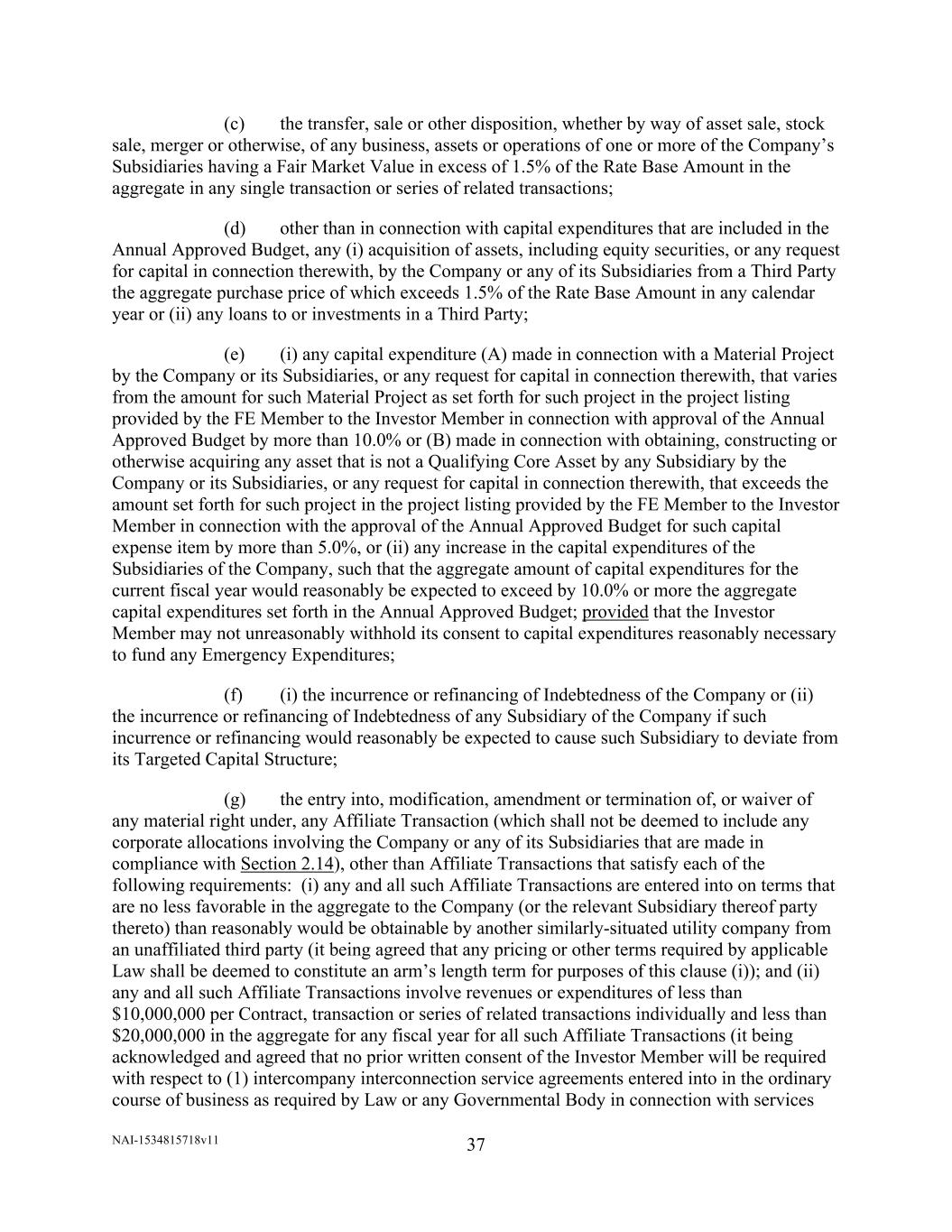 NAI-1534815718v11 37 (c) the transfer, sale or other disposition, whether by way of asset sale, stock sale, merger or otherwise, of any business, assets or operations of one or more of the Company’s Subsidiaries having a Fair Market Value in excess of 1.5% of the Rate Base Amount in the aggregate in any single transaction or series of related transactions; (d) other than in connection with capital expenditures that are included in the Annual Approved Budget, any (i) acquisition of assets, including equity securities, or any request for capital in connection therewith, by the Company or any of its Subsidiaries from a Third Party the aggregate purchase price of which exceeds 1.5% of the Rate Base Amount in any calendar year or (ii) any loans to or investments in a Third Party; (e) (i) any capital expenditure (A) made in connection with a Material Project by the Company or its Subsidiaries, or any request for capital in connection therewith, that varies from the amount for such Material Project as set forth for such project in the project listing provided by the FE Member to the Investor Member in connection with approval of the Annual Approved Budget by more than 10.0% or (B) made in connection with obtaining, constructing or otherwise acquiring any asset that is not a Qualifying Core Asset by any Subsidiary by the Company or its Subsidiaries, or any request for capital in connection therewith, that exceeds the amount set forth for such project in the project listing provided by the FE Member to the Investor Member in connection with the approval of the Annual Approved Budget for such capital expense item by more than 5.0%, or (ii) any increase in the capital expenditures of the Subsidiaries of the Company, such that the aggregate amount of capital expenditures for the current fiscal year would reasonably be expected to exceed by 10.0% or more the aggregate capital expenditures set forth in the Annual Approved Budget; provided that the Investor Member may not unreasonably withhold its consent to capital expenditures reasonably necessary to fund any Emergency Expenditures; (f) (i) the incurrence or refinancing of Indebtedness of the Company or (ii) the incurrence or refinancing of Indebtedness of any Subsidiary of the Company if such incurrence or refinancing would reasonably be expected to cause such Subsidiary to deviate from its Targeted Capital Structure; (g) the entry into, modification, amendment or termination of, or waiver of any material right under, any Affiliate Transaction (which shall not be deemed to include any corporate allocations involving the Company or any of its Subsidiaries that are made in compliance with Section 2.14), other than Affiliate Transactions that satisfy each of the following requirements: (i) any and all such Affiliate Transactions are entered into on terms that are no less favorable in the aggregate to the Company (or the relevant Subsidiary thereof party thereto) than reasonably would be obtainable by another similarly-situated utility company from an unaffiliated third party (it being agreed that any pricing or other terms required by applicable Law shall be deemed to constitute an arm’s length term for purposes of this clause (i)); and (ii) any and all such Affiliate Transactions involve revenues or expenditures of less than $10,000,000 per Contract, transaction or series of related transactions individually and less than $20,000,000 in the aggregate for any fiscal year for all such Affiliate Transactions (it being acknowledged and agreed that no prior written consent of the Investor Member will be required with respect to (1) intercompany interconnection service agreements entered into in the ordinary course of business as required by Law or any Governmental Body in connection with services