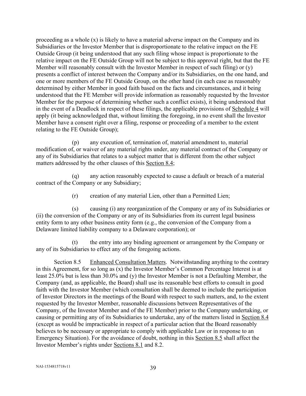 NAI-1534815718v11 39 proceeding as a whole (x) is likely to have a material adverse impact on the Company and its Subsidiaries or the Investor Member that is disproportionate to the relative impact on the FE Outside Group (it being understood that any such filing whose impact is proportionate to the relative impact on the FE Outside Group will not be subject to this approval right, but that the FE Member will reasonably consult with the Investor Member in respect of such filing) or (y) presents a conflict of interest between the Company and/or its Subsidiaries, on the one hand, and one or more members of the FE Outside Group, on the other hand (in each case as reasonably determined by either Member in good faith based on the facts and circumstances, and it being understood that the FE Member will provide information as reasonably requested by the Investor Member for the purpose of determining whether such a conflict exists), it being understood that in the event of a Deadlock in respect of these filings, the applicable provisions of Schedule 4 will apply (it being acknowledged that, without limiting the foregoing, in no event shall the Investor Member have a consent right over a filing, response or proceeding of a member to the extent relating to the FE Outside Group); (p) any execution of, termination of, material amendment to, material modification of, or waiver of any material rights under, any material contract of the Company or any of its Subsidiaries that relates to a subject matter that is different from the other subject matters addressed by the other clauses of this Section 8.4; (q) any action reasonably expected to cause a default or breach of a material contract of the Company or any Subsidiary; (r) creation of any material Lien, other than a Permitted Lien; (s) causing (i) any reorganization of the Company or any of its Subsidiaries or (ii) the conversion of the Company or any of its Subsidiaries from its current legal business entity form to any other business entity form (e.g., the conversion of the Company from a Delaware limited liability company to a Delaware corporation); or (t) the entry into any binding agreement or arrangement by the Company or any of its Subsidiaries to effect any of the foregoing actions. Section 8.5 Enhanced Consultation Matters. Notwithstanding anything to the contrary in this Agreement, for so long as (x) the Investor Member’s Common Percentage Interest is at least 25.0% but is less than 30.0% and (y) the Investor Member is not a Defaulting Member, the Company (and, as applicable, the Board) shall use its reasonable best efforts to consult in good faith with the Investor Member (which consultation shall be deemed to include the participation of Investor Directors in the meetings of the Board with respect to such matters, and, to the extent requested by the Investor Member, reasonable discussions between Representatives of the Company, of the Investor Member and of the FE Member) prior to the Company undertaking, or causing or permitting any of its Subsidiaries to undertake, any of the matters listed in Section 8.4 (except as would be impracticable in respect of a particular action that the Board reasonably believes to be necessary or appropriate to comply with applicable Law or in response to an Emergency Situation). For the avoidance of doubt, nothing in this Section 8.5 shall affect the Investor Member’s rights under Sections 8.1 and 8.2.