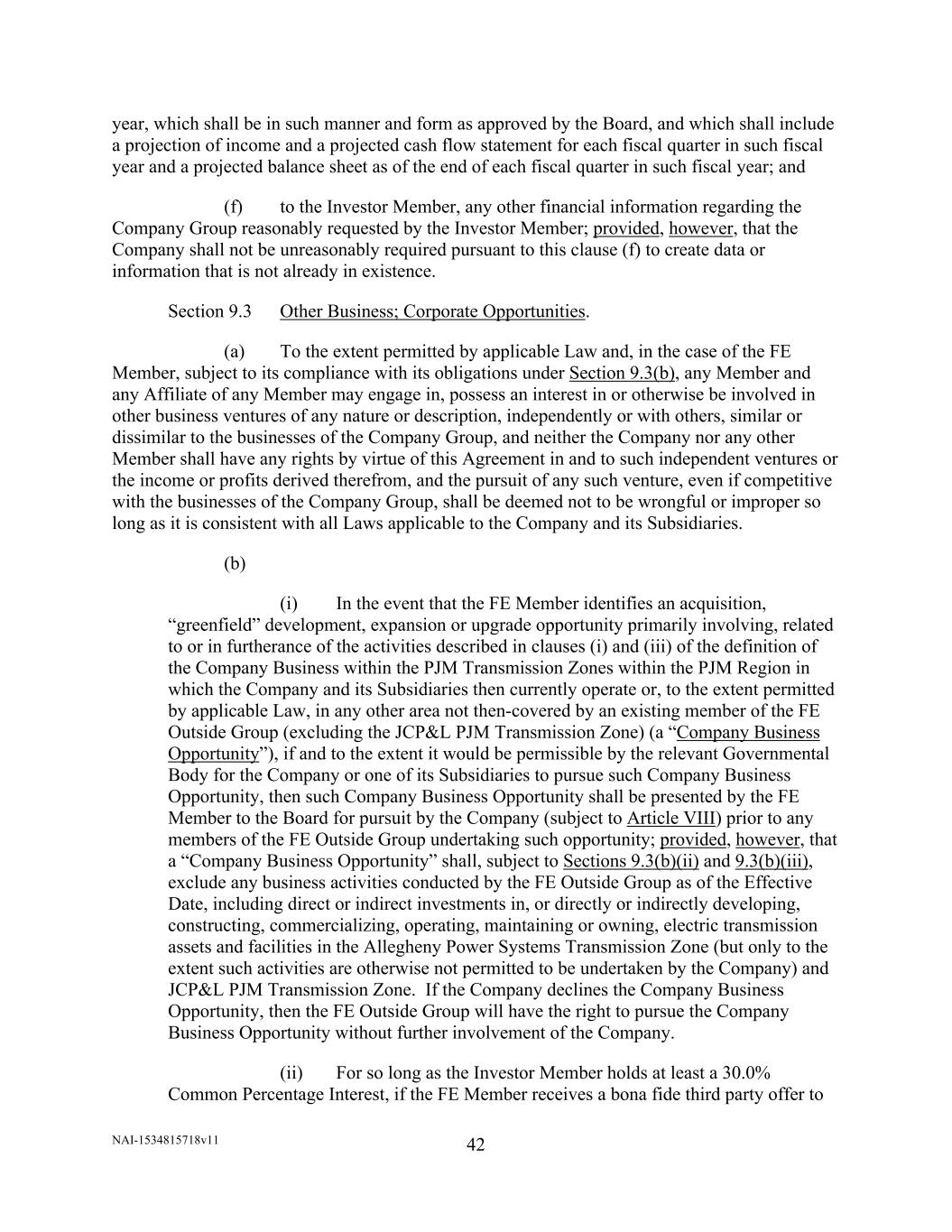 NAI-1534815718v11 42 year, which shall be in such manner and form as approved by the Board, and which shall include a projection of income and a projected cash flow statement for each fiscal quarter in such fiscal year and a projected balance sheet as of the end of each fiscal quarter in such fiscal year; and (f) to the Investor Member, any other financial information regarding the Company Group reasonably requested by the Investor Member; provided, however, that the Company shall not be unreasonably required pursuant to this clause (f) to create data or information that is not already in existence. Section 9.3 Other Business; Corporate Opportunities. (a) To the extent permitted by applicable Law and, in the case of the FE Member, subject to its compliance with its obligations under Section 9.3(b), any Member and any Affiliate of any Member may engage in, possess an interest in or otherwise be involved in other business ventures of any nature or description, independently or with others, similar or dissimilar to the businesses of the Company Group, and neither the Company nor any other Member shall have any rights by virtue of this Agreement in and to such independent ventures or the income or profits derived therefrom, and the pursuit of any such venture, even if competitive with the businesses of the Company Group, shall be deemed not to be wrongful or improper so long as it is consistent with all Laws applicable to the Company and its Subsidiaries. (b) (i) In the event that the FE Member identifies an acquisition, “greenfield” development, expansion or upgrade opportunity primarily involving, related to or in furtherance of the activities described in clauses (i) and (iii) of the definition of the Company Business within the PJM Transmission Zones within the PJM Region in which the Company and its Subsidiaries then currently operate or, to the extent permitted by applicable Law, in any other area not then-covered by an existing member of the FE Outside Group (excluding the JCP&L PJM Transmission Zone) (a “Company Business Opportunity”), if and to the extent it would be permissible by the relevant Governmental Body for the Company or one of its Subsidiaries to pursue such Company Business Opportunity, then such Company Business Opportunity shall be presented by the FE Member to the Board for pursuit by the Company (subject to Article VIII) prior to any members of the FE Outside Group undertaking such opportunity; provided, however, that a “Company Business Opportunity” shall, subject to Sections 9.3(b)(ii) and 9.3(b)(iii), exclude any business activities conducted by the FE Outside Group as of the Effective Date, including direct or indirect investments in, or directly or indirectly developing, constructing, commercializing, operating, maintaining or owning, electric transmission assets and facilities in the Allegheny Power Systems Transmission Zone (but only to the extent such activities are otherwise not permitted to be undertaken by the Company) and JCP&L PJM Transmission Zone. If the Company declines the Company Business Opportunity, then the FE Outside Group will have the right to pursue the Company Business Opportunity without further involvement of the Company. (ii) For so long as the Investor Member holds at least a 30.0% Common Percentage Interest, if the FE Member receives a bona fide third party offer to