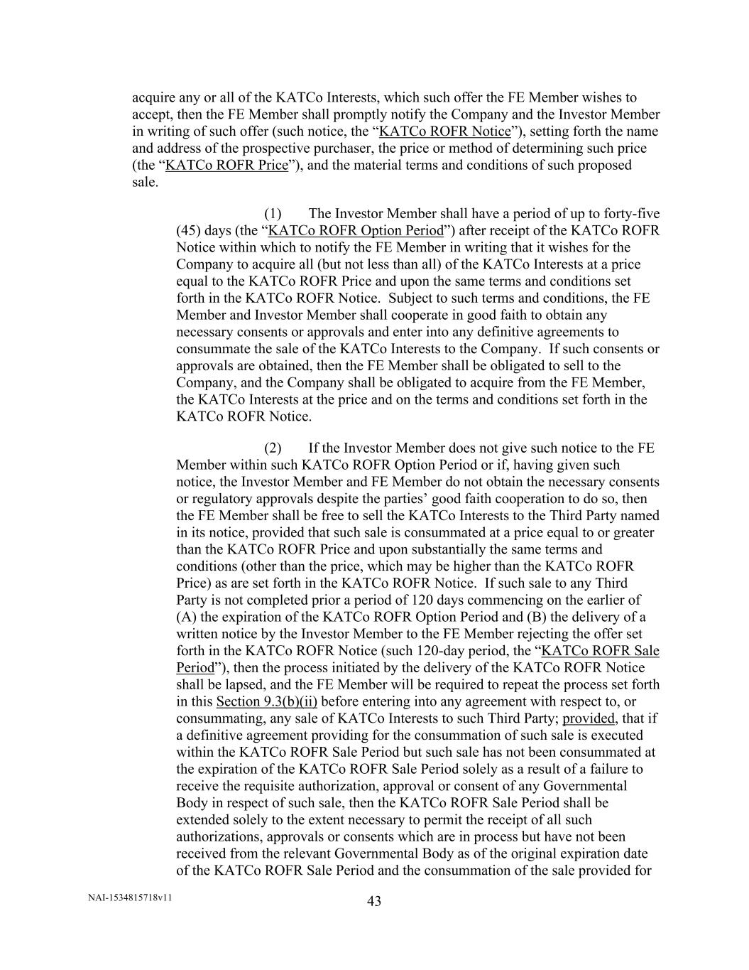 NAI-1534815718v11 43 acquire any or all of the KATCo Interests, which such offer the FE Member wishes to accept, then the FE Member shall promptly notify the Company and the Investor Member in writing of such offer (such notice, the “KATCo ROFR Notice”), setting forth the name and address of the prospective purchaser, the price or method of determining such price (the “KATCo ROFR Price”), and the material terms and conditions of such proposed sale. (1) The Investor Member shall have a period of up to forty-five (45) days (the “KATCo ROFR Option Period”) after receipt of the KATCo ROFR Notice within which to notify the FE Member in writing that it wishes for the Company to acquire all (but not less than all) of the KATCo Interests at a price equal to the KATCo ROFR Price and upon the same terms and conditions set forth in the KATCo ROFR Notice. Subject to such terms and conditions, the FE Member and Investor Member shall cooperate in good faith to obtain any necessary consents or approvals and enter into any definitive agreements to consummate the sale of the KATCo Interests to the Company. If such consents or approvals are obtained, then the FE Member shall be obligated to sell to the Company, and the Company shall be obligated to acquire from the FE Member, the KATCo Interests at the price and on the terms and conditions set forth in the KATCo ROFR Notice. (2) If the Investor Member does not give such notice to the FE Member within such KATCo ROFR Option Period or if, having given such notice, the Investor Member and FE Member do not obtain the necessary consents or regulatory approvals despite the parties’ good faith cooperation to do so, then the FE Member shall be free to sell the KATCo Interests to the Third Party named in its notice, provided that such sale is consummated at a price equal to or greater than the KATCo ROFR Price and upon substantially the same terms and conditions (other than the price, which may be higher than the KATCo ROFR Price) as are set forth in the KATCo ROFR Notice. If such sale to any Third Party is not completed prior a period of 120 days commencing on the earlier of (A) the expiration of the KATCo ROFR Option Period and (B) the delivery of a written notice by the Investor Member to the FE Member rejecting the offer set forth in the KATCo ROFR Notice (such 120-day period, the “KATCo ROFR Sale Period”), then the process initiated by the delivery of the KATCo ROFR Notice shall be lapsed, and the FE Member will be required to repeat the process set forth in this Section 9.3(b)(ii) before entering into any agreement with respect to, or consummating, any sale of KATCo Interests to such Third Party; provided, that if a definitive agreement providing for the consummation of such sale is executed within the KATCo ROFR Sale Period but such sale has not been consummated at the expiration of the KATCo ROFR Sale Period solely as a result of a failure to receive the requisite authorization, approval or consent of any Governmental Body in respect of such sale, then the KATCo ROFR Sale Period shall be extended solely to the extent necessary to permit the receipt of all such authorizations, approvals or consents which are in process but have not been received from the relevant Governmental Body as of the original expiration date of the KATCo ROFR Sale Period and the consummation of the sale provided for