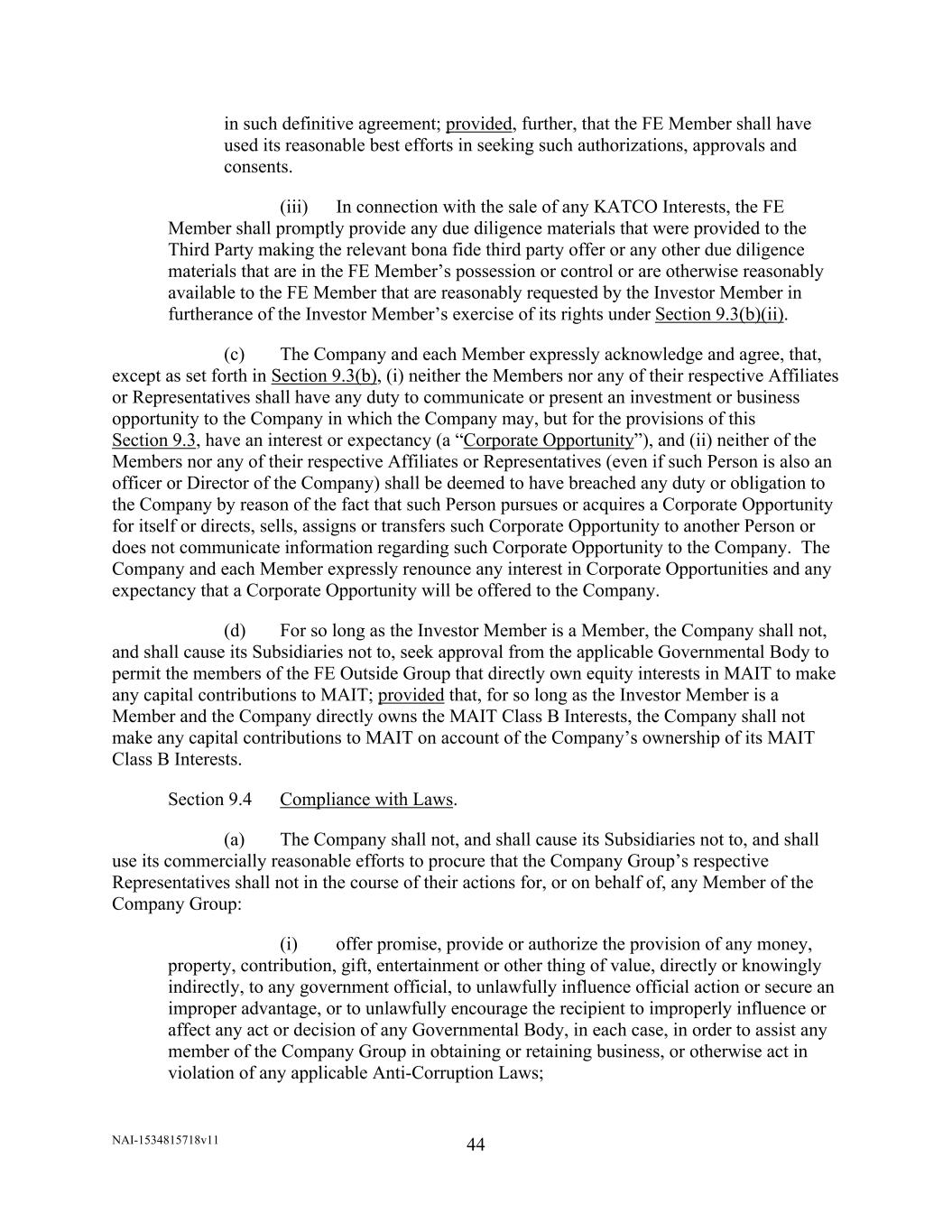 NAI-1534815718v11 44 in such definitive agreement; provided, further, that the FE Member shall have used its reasonable best efforts in seeking such authorizations, approvals and consents. (iii) In connection with the sale of any KATCO Interests, the FE Member shall promptly provide any due diligence materials that were provided to the Third Party making the relevant bona fide third party offer or any other due diligence materials that are in the FE Member’s possession or control or are otherwise reasonably available to the FE Member that are reasonably requested by the Investor Member in furtherance of the Investor Member’s exercise of its rights under Section 9.3(b)(ii). (c) The Company and each Member expressly acknowledge and agree, that, except as set forth in Section 9.3(b), (i) neither the Members nor any of their respective Affiliates or Representatives shall have any duty to communicate or present an investment or business opportunity to the Company in which the Company may, but for the provisions of this Section 9.3, have an interest or expectancy (a “Corporate Opportunity”), and (ii) neither of the Members nor any of their respective Affiliates or Representatives (even if such Person is also an officer or Director of the Company) shall be deemed to have breached any duty or obligation to the Company by reason of the fact that such Person pursues or acquires a Corporate Opportunity for itself or directs, sells, assigns or transfers such Corporate Opportunity to another Person or does not communicate information regarding such Corporate Opportunity to the Company. The Company and each Member expressly renounce any interest in Corporate Opportunities and any expectancy that a Corporate Opportunity will be offered to the Company. (d) For so long as the Investor Member is a Member, the Company shall not, and shall cause its Subsidiaries not to, seek approval from the applicable Governmental Body to permit the members of the FE Outside Group that directly own equity interests in MAIT to make any capital contributions to MAIT; provided that, for so long as the Investor Member is a Member and the Company directly owns the MAIT Class B Interests, the Company shall not make any capital contributions to MAIT on account of the Company’s ownership of its MAIT Class B Interests. Section 9.4 Compliance with Laws. (a) The Company shall not, and shall cause its Subsidiaries not to, and shall use its commercially reasonable efforts to procure that the Company Group’s respective Representatives shall not in the course of their actions for, or on behalf of, any Member of the Company Group: (i) offer promise, provide or authorize the provision of any money, property, contribution, gift, entertainment or other thing of value, directly or knowingly indirectly, to any government official, to unlawfully influence official action or secure an improper advantage, or to unlawfully encourage the recipient to improperly influence or affect any act or decision of any Governmental Body, in each case, in order to assist any member of the Company Group in obtaining or retaining business, or otherwise act in violation of any applicable Anti-Corruption Laws;