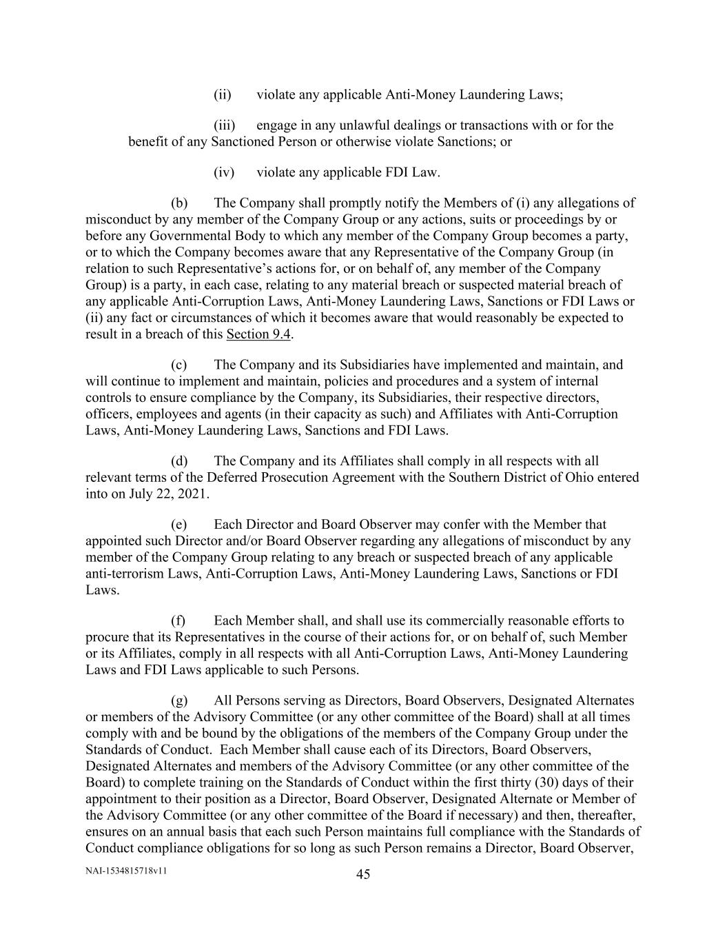 NAI-1534815718v11 45 (ii) violate any applicable Anti-Money Laundering Laws; (iii) engage in any unlawful dealings or transactions with or for the benefit of any Sanctioned Person or otherwise violate Sanctions; or (iv) violate any applicable FDI Law. (b) The Company shall promptly notify the Members of (i) any allegations of misconduct by any member of the Company Group or any actions, suits or proceedings by or before any Governmental Body to which any member of the Company Group becomes a party, or to which the Company becomes aware that any Representative of the Company Group (in relation to such Representative’s actions for, or on behalf of, any member of the Company Group) is a party, in each case, relating to any material breach or suspected material breach of any applicable Anti-Corruption Laws, Anti-Money Laundering Laws, Sanctions or FDI Laws or (ii) any fact or circumstances of which it becomes aware that would reasonably be expected to result in a breach of this Section 9.4. (c) The Company and its Subsidiaries have implemented and maintain, and will continue to implement and maintain, policies and procedures and a system of internal controls to ensure compliance by the Company, its Subsidiaries, their respective directors, officers, employees and agents (in their capacity as such) and Affiliates with Anti-Corruption Laws, Anti-Money Laundering Laws, Sanctions and FDI Laws. (d) The Company and its Affiliates shall comply in all respects with all relevant terms of the Deferred Prosecution Agreement with the Southern District of Ohio entered into on July 22, 2021. (e) Each Director and Board Observer may confer with the Member that appointed such Director and/or Board Observer regarding any allegations of misconduct by any member of the Company Group relating to any breach or suspected breach of any applicable anti-terrorism Laws, Anti-Corruption Laws, Anti-Money Laundering Laws, Sanctions or FDI Laws. (f) Each Member shall, and shall use its commercially reasonable efforts to procure that its Representatives in the course of their actions for, or on behalf of, such Member or its Affiliates, comply in all respects with all Anti-Corruption Laws, Anti-Money Laundering Laws and FDI Laws applicable to such Persons. (g) All Persons serving as Directors, Board Observers, Designated Alternates or members of the Advisory Committee (or any other committee of the Board) shall at all times comply with and be bound by the obligations of the members of the Company Group under the Standards of Conduct. Each Member shall cause each of its Directors, Board Observers, Designated Alternates and members of the Advisory Committee (or any other committee of the Board) to complete training on the Standards of Conduct within the first thirty (30) days of their appointment to their position as a Director, Board Observer, Designated Alternate or Member of the Advisory Committee (or any other committee of the Board if necessary) and then, thereafter, ensures on an annual basis that each such Person maintains full compliance with the Standards of Conduct compliance obligations for so long as such Person remains a Director, Board Observer,