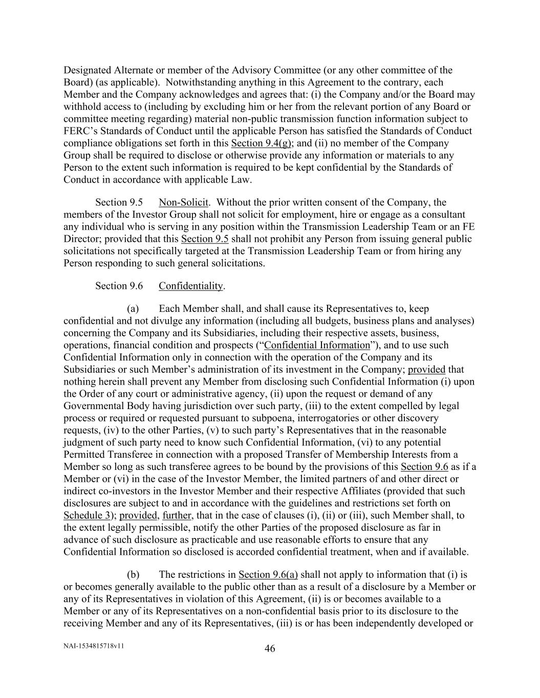 NAI-1534815718v11 46 Designated Alternate or member of the Advisory Committee (or any other committee of the Board) (as applicable). Notwithstanding anything in this Agreement to the contrary, each Member and the Company acknowledges and agrees that: (i) the Company and/or the Board may withhold access to (including by excluding him or her from the relevant portion of any Board or committee meeting regarding) material non-public transmission function information subject to FERC’s Standards of Conduct until the applicable Person has satisfied the Standards of Conduct compliance obligations set forth in this Section 9.4(g); and (ii) no member of the Company Group shall be required to disclose or otherwise provide any information or materials to any Person to the extent such information is required to be kept confidential by the Standards of Conduct in accordance with applicable Law. Section 9.5 Non-Solicit. Without the prior written consent of the Company, the members of the Investor Group shall not solicit for employment, hire or engage as a consultant any individual who is serving in any position within the Transmission Leadership Team or an FE Director; provided that this Section 9.5 shall not prohibit any Person from issuing general public solicitations not specifically targeted at the Transmission Leadership Team or from hiring any Person responding to such general solicitations. Section 9.6 Confidentiality. (a) Each Member shall, and shall cause its Representatives to, keep confidential and not divulge any information (including all budgets, business plans and analyses) concerning the Company and its Subsidiaries, including their respective assets, business, operations, financial condition and prospects (“Confidential Information”), and to use such Confidential Information only in connection with the operation of the Company and its Subsidiaries or such Member’s administration of its investment in the Company; provided that nothing herein shall prevent any Member from disclosing such Confidential Information (i) upon the Order of any court or administrative agency, (ii) upon the request or demand of any Governmental Body having jurisdiction over such party, (iii) to the extent compelled by legal process or required or requested pursuant to subpoena, interrogatories or other discovery requests, (iv) to the other Parties, (v) to such party’s Representatives that in the reasonable judgment of such party need to know such Confidential Information, (vi) to any potential Permitted Transferee in connection with a proposed Transfer of Membership Interests from a Member so long as such transferee agrees to be bound by the provisions of this Section 9.6 as if a Member or (vi) in the case of the Investor Member, the limited partners of and other direct or indirect co-investors in the Investor Member and their respective Affiliates (provided that such disclosures are subject to and in accordance with the guidelines and restrictions set forth on Schedule 3); provided, further, that in the case of clauses (i), (ii) or (iii), such Member shall, to the extent legally permissible, notify the other Parties of the proposed disclosure as far in advance of such disclosure as practicable and use reasonable efforts to ensure that any Confidential Information so disclosed is accorded confidential treatment, when and if available. (b) The restrictions in Section 9.6(a) shall not apply to information that (i) is or becomes generally available to the public other than as a result of a disclosure by a Member or any of its Representatives in violation of this Agreement, (ii) is or becomes available to a Member or any of its Representatives on a non-confidential basis prior to its disclosure to the receiving Member and any of its Representatives, (iii) is or has been independently developed or