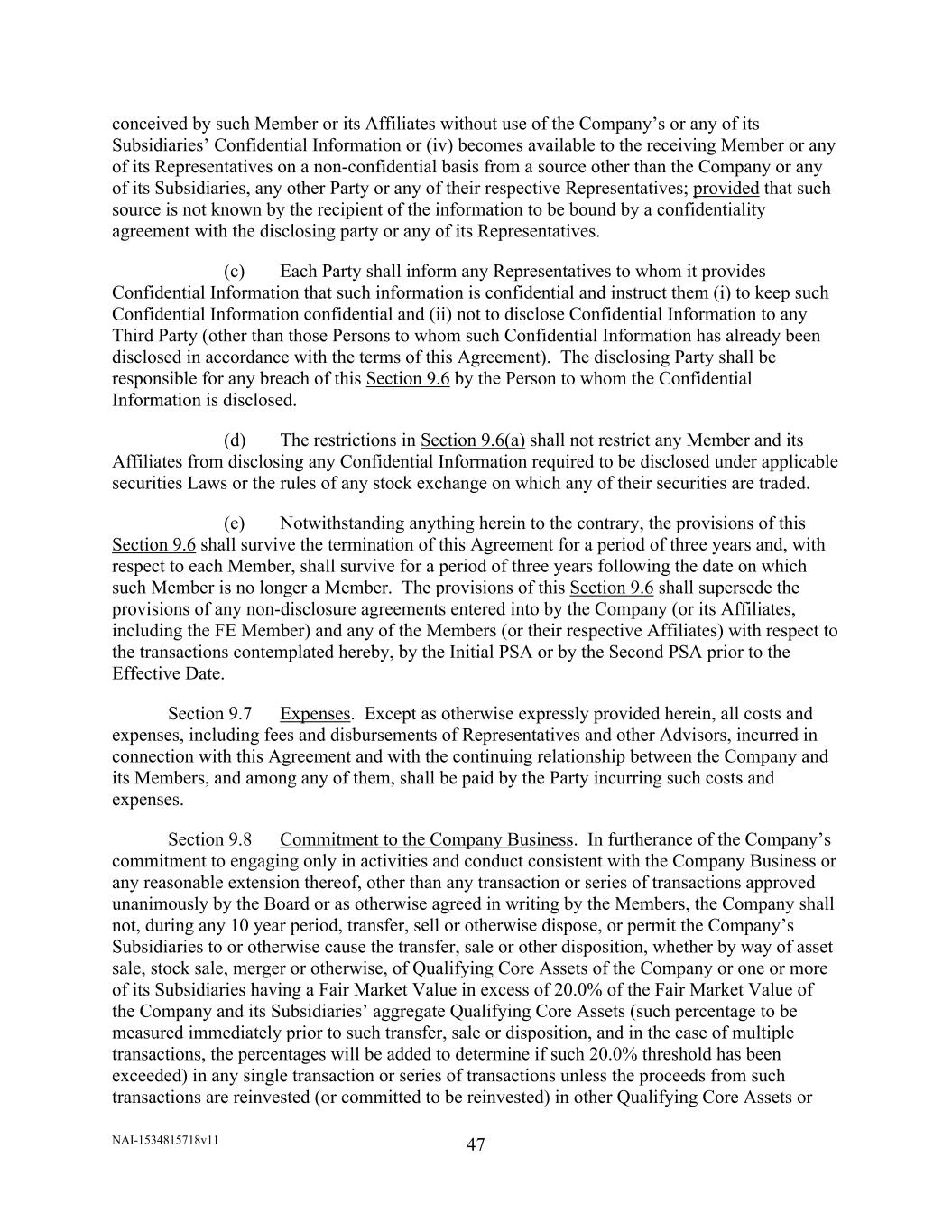 NAI-1534815718v11 47 conceived by such Member or its Affiliates without use of the Company’s or any of its Subsidiaries’ Confidential Information or (iv) becomes available to the receiving Member or any of its Representatives on a non-confidential basis from a source other than the Company or any of its Subsidiaries, any other Party or any of their respective Representatives; provided that such source is not known by the recipient of the information to be bound by a confidentiality agreement with the disclosing party or any of its Representatives. (c) Each Party shall inform any Representatives to whom it provides Confidential Information that such information is confidential and instruct them (i) to keep such Confidential Information confidential and (ii) not to disclose Confidential Information to any Third Party (other than those Persons to whom such Confidential Information has already been disclosed in accordance with the terms of this Agreement). The disclosing Party shall be responsible for any breach of this Section 9.6 by the Person to whom the Confidential Information is disclosed. (d) The restrictions in Section 9.6(a) shall not restrict any Member and its Affiliates from disclosing any Confidential Information required to be disclosed under applicable securities Laws or the rules of any stock exchange on which any of their securities are traded. (e) Notwithstanding anything herein to the contrary, the provisions of this Section 9.6 shall survive the termination of this Agreement for a period of three years and, with respect to each Member, shall survive for a period of three years following the date on which such Member is no longer a Member. The provisions of this Section 9.6 shall supersede the provisions of any non-disclosure agreements entered into by the Company (or its Affiliates, including the FE Member) and any of the Members (or their respective Affiliates) with respect to the transactions contemplated hereby, by the Initial PSA or by the Second PSA prior to the Effective Date. Section 9.7 Expenses. Except as otherwise expressly provided herein, all costs and expenses, including fees and disbursements of Representatives and other Advisors, incurred in connection with this Agreement and with the continuing relationship between the Company and its Members, and among any of them, shall be paid by the Party incurring such costs and expenses. Section 9.8 Commitment to the Company Business. In furtherance of the Company’s commitment to engaging only in activities and conduct consistent with the Company Business or any reasonable extension thereof, other than any transaction or series of transactions approved unanimously by the Board or as otherwise agreed in writing by the Members, the Company shall not, during any 10 year period, transfer, sell or otherwise dispose, or permit the Company’s Subsidiaries to or otherwise cause the transfer, sale or other disposition, whether by way of asset sale, stock sale, merger or otherwise, of Qualifying Core Assets of the Company or one or more of its Subsidiaries having a Fair Market Value in excess of 20.0% of the Fair Market Value of the Company and its Subsidiaries’ aggregate Qualifying Core Assets (such percentage to be measured immediately prior to such transfer, sale or disposition, and in the case of multiple transactions, the percentages will be added to determine if such 20.0% threshold has been exceeded) in any single transaction or series of transactions unless the proceeds from such transactions are reinvested (or committed to be reinvested) in other Qualifying Core Assets or