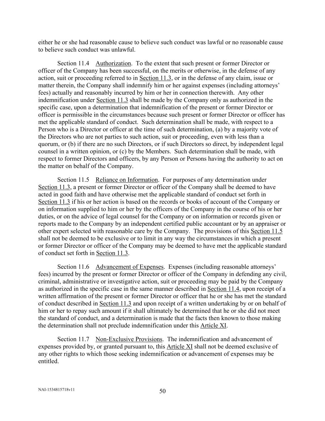 NAI-1534815718v11 50 either he or she had reasonable cause to believe such conduct was lawful or no reasonable cause to believe such conduct was unlawful. Section 11.4 Authorization. To the extent that such present or former Director or officer of the Company has been successful, on the merits or otherwise, in the defense of any action, suit or proceeding referred to in Section 11.3, or in the defense of any claim, issue or matter therein, the Company shall indemnify him or her against expenses (including attorneys’ fees) actually and reasonably incurred by him or her in connection therewith. Any other indemnification under Section 11.3 shall be made by the Company only as authorized in the specific case, upon a determination that indemnification of the present or former Director or officer is permissible in the circumstances because such present or former Director or officer has met the applicable standard of conduct. Such determination shall be made, with respect to a Person who is a Director or officer at the time of such determination, (a) by a majority vote of the Directors who are not parties to such action, suit or proceeding, even with less than a quorum, or (b) if there are no such Directors, or if such Directors so direct, by independent legal counsel in a written opinion, or (c) by the Members. Such determination shall be made, with respect to former Directors and officers, by any Person or Persons having the authority to act on the matter on behalf of the Company. Section 11.5 Reliance on Information. For purposes of any determination under Section 11.3, a present or former Director or officer of the Company shall be deemed to have acted in good faith and have otherwise met the applicable standard of conduct set forth in Section 11.3 if his or her action is based on the records or books of account of the Company or on information supplied to him or her by the officers of the Company in the course of his or her duties, or on the advice of legal counsel for the Company or on information or records given or reports made to the Company by an independent certified public accountant or by an appraiser or other expert selected with reasonable care by the Company. The provisions of this Section 11.5 shall not be deemed to be exclusive or to limit in any way the circumstances in which a present or former Director or officer of the Company may be deemed to have met the applicable standard of conduct set forth in Section 11.3. Section 11.6 Advancement of Expenses. Expenses (including reasonable attorneys’ fees) incurred by the present or former Director or officer of the Company in defending any civil, criminal, administrative or investigative action, suit or proceeding may be paid by the Company as authorized in the specific case in the same manner described in Section 11.4, upon receipt of a written affirmation of the present or former Director or officer that he or she has met the standard of conduct described in Section 11.3 and upon receipt of a written undertaking by or on behalf of him or her to repay such amount if it shall ultimately be determined that he or she did not meet the standard of conduct, and a determination is made that the facts then known to those making the determination shall not preclude indemnification under this Article XI. Section 11.7 Non-Exclusive Provisions. The indemnification and advancement of expenses provided by, or granted pursuant to, this Article XI shall not be deemed exclusive of any other rights to which those seeking indemnification or advancement of expenses may be entitled.