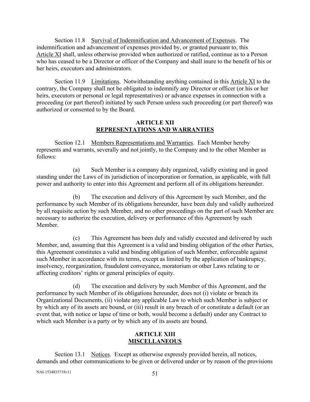 NAI-1534815718v11 51 Section 11.8 Survival of Indemnification and Advancement of Expenses. The indemnification and advancement of expenses provided by, or granted pursuant to, this Article XI shall, unless otherwise provided when authorized or ratified, continue as to a Person who has ceased to be a Director or officer of the Company and shall inure to the benefit of his or her heirs, executors and administrators. Section 11.9 Limitations. Notwithstanding anything contained in this Article XI to the contrary, the Company shall not be obligated to indemnify any Director or officer (or his or her heirs, executors or personal or legal representatives) or advance expenses in connection with a proceeding (or part thereof) initiated by such Person unless such proceeding (or part thereof) was authorized or consented to by the Board. ARTICLE XII REPRESENTATIONS AND WARRANTIES Section 12.1 Members Representations and Warranties. Each Member hereby represents and warrants, severally and not jointly, to the Company and to the other Member as follows: (a) Such Member is a company duly organized, validly existing and in good standing under the Laws of its jurisdiction of incorporation or formation, as applicable, with full power and authority to enter into this Agreement and perform all of its obligations hereunder. (b) The execution and delivery of this Agreement by such Member, and the performance by such Member of its obligations hereunder, have been duly and validly authorized by all requisite action by such Member, and no other proceedings on the part of such Member are necessary to authorize the execution, delivery or performance of this Agreement by such Member. (c) This Agreement has been duly and validly executed and delivered by such Member, and, assuming that this Agreement is a valid and binding obligation of the other Parties, this Agreement constitutes a valid and binding obligation of such Member, enforceable against such Member in accordance with its terms, except as limited by the application of bankruptcy, insolvency, reorganization, fraudulent conveyance, moratorium or other Laws relating to or affecting creditors’ rights or general principles of equity. (d) The execution and delivery by such Member of this Agreement, and the performance by such Member of its obligations hereunder, does not (i) violate or breach its Organizational Documents, (ii) violate any applicable Law to which such Member is subject or by which any of its assets are bound, or (iii) result in any breach of or constitute a default (or an event that, with notice or lapse of time or both, would become a default) under any Contract to which such Member is a party or by which any of its assets are bound. ARTICLE XIII MISCELLANEOUS Section 13.1 Notices. Except as otherwise expressly provided herein, all notices, demands and other communications to be given or delivered under or by reason of the provisions