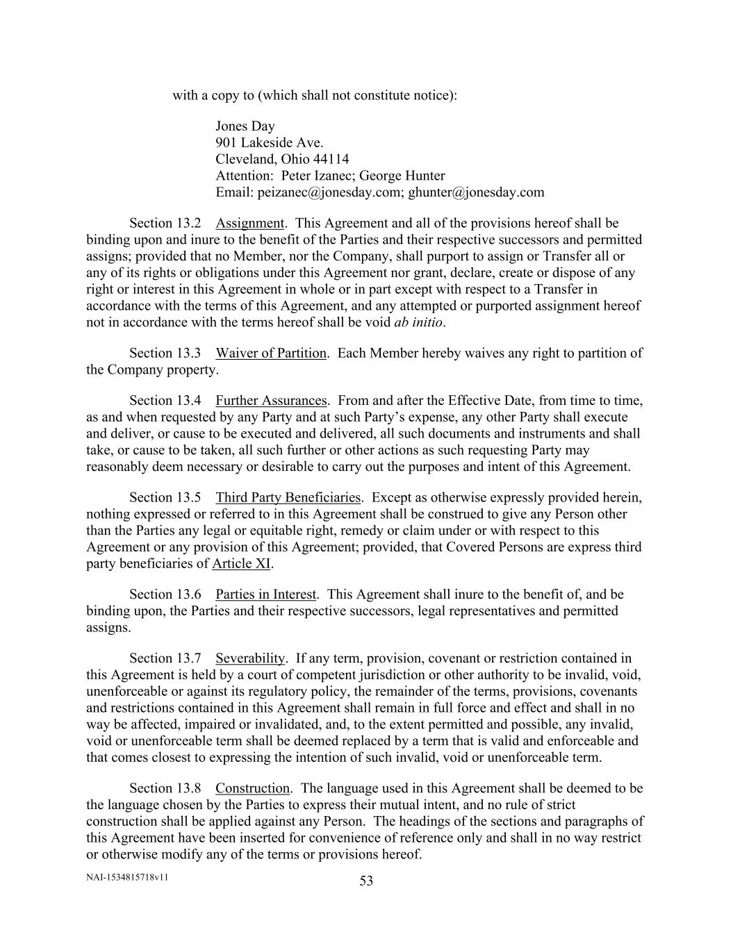 NAI-1534815718v11 53 with a copy to (which shall not constitute notice): Jones Day 901 Lakeside Ave. Cleveland, Ohio 44114 Attention: Peter Izanec; George Hunter Email: peizanec@jonesday.com; ghunter@jonesday.com Section 13.2 Assignment. This Agreement and all of the provisions hereof shall be binding upon and inure to the benefit of the Parties and their respective successors and permitted assigns; provided that no Member, nor the Company, shall purport to assign or Transfer all or any of its rights or obligations under this Agreement nor grant, declare, create or dispose of any right or interest in this Agreement in whole or in part except with respect to a Transfer in accordance with the terms of this Agreement, and any attempted or purported assignment hereof not in accordance with the terms hereof shall be void ab initio. Section 13.3 Waiver of Partition. Each Member hereby waives any right to partition of the Company property. Section 13.4 Further Assurances. From and after the Effective Date, from time to time, as and when requested by any Party and at such Party’s expense, any other Party shall execute and deliver, or cause to be executed and delivered, all such documents and instruments and shall take, or cause to be taken, all such further or other actions as such requesting Party may reasonably deem necessary or desirable to carry out the purposes and intent of this Agreement. Section 13.5 Third Party Beneficiaries. Except as otherwise expressly provided herein, nothing expressed or referred to in this Agreement shall be construed to give any Person other than the Parties any legal or equitable right, remedy or claim under or with respect to this Agreement or any provision of this Agreement; provided, that Covered Persons are express third party beneficiaries of Article XI. Section 13.6 Parties in Interest. This Agreement shall inure to the benefit of, and be binding upon, the Parties and their respective successors, legal representatives and permitted assigns. Section 13.7 Severability. If any term, provision, covenant or restriction contained in this Agreement is held by a court of competent jurisdiction or other authority to be invalid, void, unenforceable or against its regulatory policy, the remainder of the terms, provisions, covenants and restrictions contained in this Agreement shall remain in full force and effect and shall in no way be affected, impaired or invalidated, and, to the extent permitted and possible, any invalid, void or unenforceable term shall be deemed replaced by a term that is valid and enforceable and that comes closest to expressing the intention of such invalid, void or unenforceable term. Section 13.8 Construction. The language used in this Agreement shall be deemed to be the language chosen by the Parties to express their mutual intent, and no rule of strict construction shall be applied against any Person. The headings of the sections and paragraphs of this Agreement have been inserted for convenience of reference only and shall in no way restrict or otherwise modify any of the terms or provisions hereof.