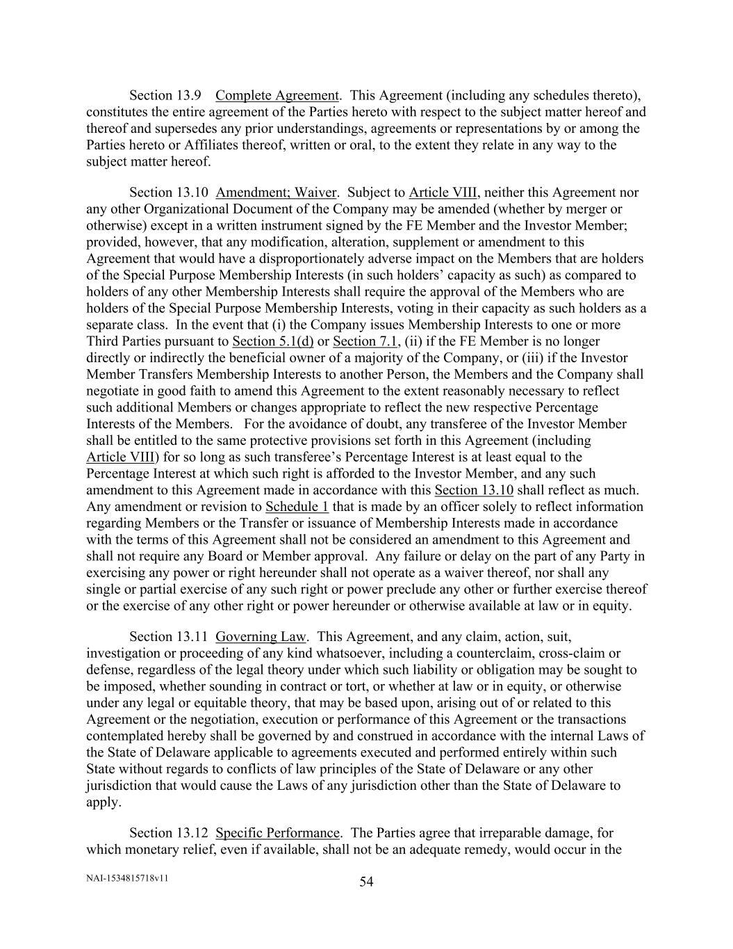 NAI-1534815718v11 54 Section 13.9 Complete Agreement. This Agreement (including any schedules thereto), constitutes the entire agreement of the Parties hereto with respect to the subject matter hereof and thereof and supersedes any prior understandings, agreements or representations by or among the Parties hereto or Affiliates thereof, written or oral, to the extent they relate in any way to the subject matter hereof. Section 13.10 Amendment; Waiver. Subject to Article VIII, neither this Agreement nor any other Organizational Document of the Company may be amended (whether by merger or otherwise) except in a written instrument signed by the FE Member and the Investor Member; provided, however, that any modification, alteration, supplement or amendment to this Agreement that would have a disproportionately adverse impact on the Members that are holders of the Special Purpose Membership Interests (in such holders’ capacity as such) as compared to holders of any other Membership Interests shall require the approval of the Members who are holders of the Special Purpose Membership Interests, voting in their capacity as such holders as a separate class. In the event that (i) the Company issues Membership Interests to one or more Third Parties pursuant to Section 5.1(d) or Section 7.1, (ii) if the FE Member is no longer directly or indirectly the beneficial owner of a majority of the Company, or (iii) if the Investor Member Transfers Membership Interests to another Person, the Members and the Company shall negotiate in good faith to amend this Agreement to the extent reasonably necessary to reflect such additional Members or changes appropriate to reflect the new respective Percentage Interests of the Members. For the avoidance of doubt, any transferee of the Investor Member shall be entitled to the same protective provisions set forth in this Agreement (including Article VIII) for so long as such transferee’s Percentage Interest is at least equal to the Percentage Interest at which such right is afforded to the Investor Member, and any such amendment to this Agreement made in accordance with this Section 13.10 shall reflect as much. Any amendment or revision to Schedule 1 that is made by an officer solely to reflect information regarding Members or the Transfer or issuance of Membership Interests made in accordance with the terms of this Agreement shall not be considered an amendment to this Agreement and shall not require any Board or Member approval. Any failure or delay on the part of any Party in exercising any power or right hereunder shall not operate as a waiver thereof, nor shall any single or partial exercise of any such right or power preclude any other or further exercise thereof or the exercise of any other right or power hereunder or otherwise available at law or in equity. Section 13.11 Governing Law. This Agreement, and any claim, action, suit, investigation or proceeding of any kind whatsoever, including a counterclaim, cross-claim or defense, regardless of the legal theory under which such liability or obligation may be sought to be imposed, whether sounding in contract or tort, or whether at law or in equity, or otherwise under any legal or equitable theory, that may be based upon, arising out of or related to this Agreement or the negotiation, execution or performance of this Agreement or the transactions contemplated hereby shall be governed by and construed in accordance with the internal Laws of the State of Delaware applicable to agreements executed and performed entirely within such State without regards to conflicts of law principles of the State of Delaware or any other jurisdiction that would cause the Laws of any jurisdiction other than the State of Delaware to apply. Section 13.12 Specific Performance. The Parties agree that irreparable damage, for which monetary relief, even if available, shall not be an adequate remedy, would occur in the