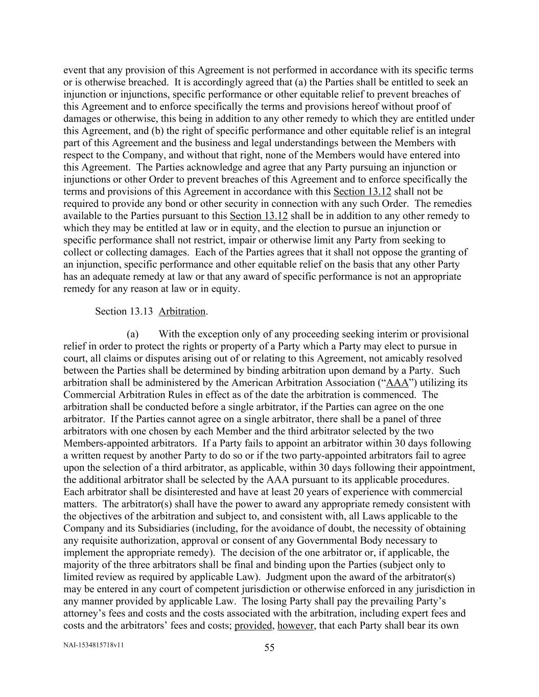 NAI-1534815718v11 55 event that any provision of this Agreement is not performed in accordance with its specific terms or is otherwise breached. It is accordingly agreed that (a) the Parties shall be entitled to seek an injunction or injunctions, specific performance or other equitable relief to prevent breaches of this Agreement and to enforce specifically the terms and provisions hereof without proof of damages or otherwise, this being in addition to any other remedy to which they are entitled under this Agreement, and (b) the right of specific performance and other equitable relief is an integral part of this Agreement and the business and legal understandings between the Members with respect to the Company, and without that right, none of the Members would have entered into this Agreement. The Parties acknowledge and agree that any Party pursuing an injunction or injunctions or other Order to prevent breaches of this Agreement and to enforce specifically the terms and provisions of this Agreement in accordance with this Section 13.12 shall not be required to provide any bond or other security in connection with any such Order. The remedies available to the Parties pursuant to this Section 13.12 shall be in addition to any other remedy to which they may be entitled at law or in equity, and the election to pursue an injunction or specific performance shall not restrict, impair or otherwise limit any Party from seeking to collect or collecting damages. Each of the Parties agrees that it shall not oppose the granting of an injunction, specific performance and other equitable relief on the basis that any other Party has an adequate remedy at law or that any award of specific performance is not an appropriate remedy for any reason at law or in equity. Section 13.13 Arbitration. (a) With the exception only of any proceeding seeking interim or provisional relief in order to protect the rights or property of a Party which a Party may elect to pursue in court, all claims or disputes arising out of or relating to this Agreement, not amicably resolved between the Parties shall be determined by binding arbitration upon demand by a Party. Such arbitration shall be administered by the American Arbitration Association (“AAA”) utilizing its Commercial Arbitration Rules in effect as of the date the arbitration is commenced. The arbitration shall be conducted before a single arbitrator, if the Parties can agree on the one arbitrator. If the Parties cannot agree on a single arbitrator, there shall be a panel of three arbitrators with one chosen by each Member and the third arbitrator selected by the two Members-appointed arbitrators. If a Party fails to appoint an arbitrator within 30 days following a written request by another Party to do so or if the two party-appointed arbitrators fail to agree upon the selection of a third arbitrator, as applicable, within 30 days following their appointment, the additional arbitrator shall be selected by the AAA pursuant to its applicable procedures. Each arbitrator shall be disinterested and have at least 20 years of experience with commercial matters. The arbitrator(s) shall have the power to award any appropriate remedy consistent with the objectives of the arbitration and subject to, and consistent with, all Laws applicable to the Company and its Subsidiaries (including, for the avoidance of doubt, the necessity of obtaining any requisite authorization, approval or consent of any Governmental Body necessary to implement the appropriate remedy). The decision of the one arbitrator or, if applicable, the majority of the three arbitrators shall be final and binding upon the Parties (subject only to limited review as required by applicable Law). Judgment upon the award of the arbitrator(s) may be entered in any court of competent jurisdiction or otherwise enforced in any jurisdiction in any manner provided by applicable Law. The losing Party shall pay the prevailing Party’s attorney’s fees and costs and the costs associated with the arbitration, including expert fees and costs and the arbitrators’ fees and costs; provided, however, that each Party shall bear its own