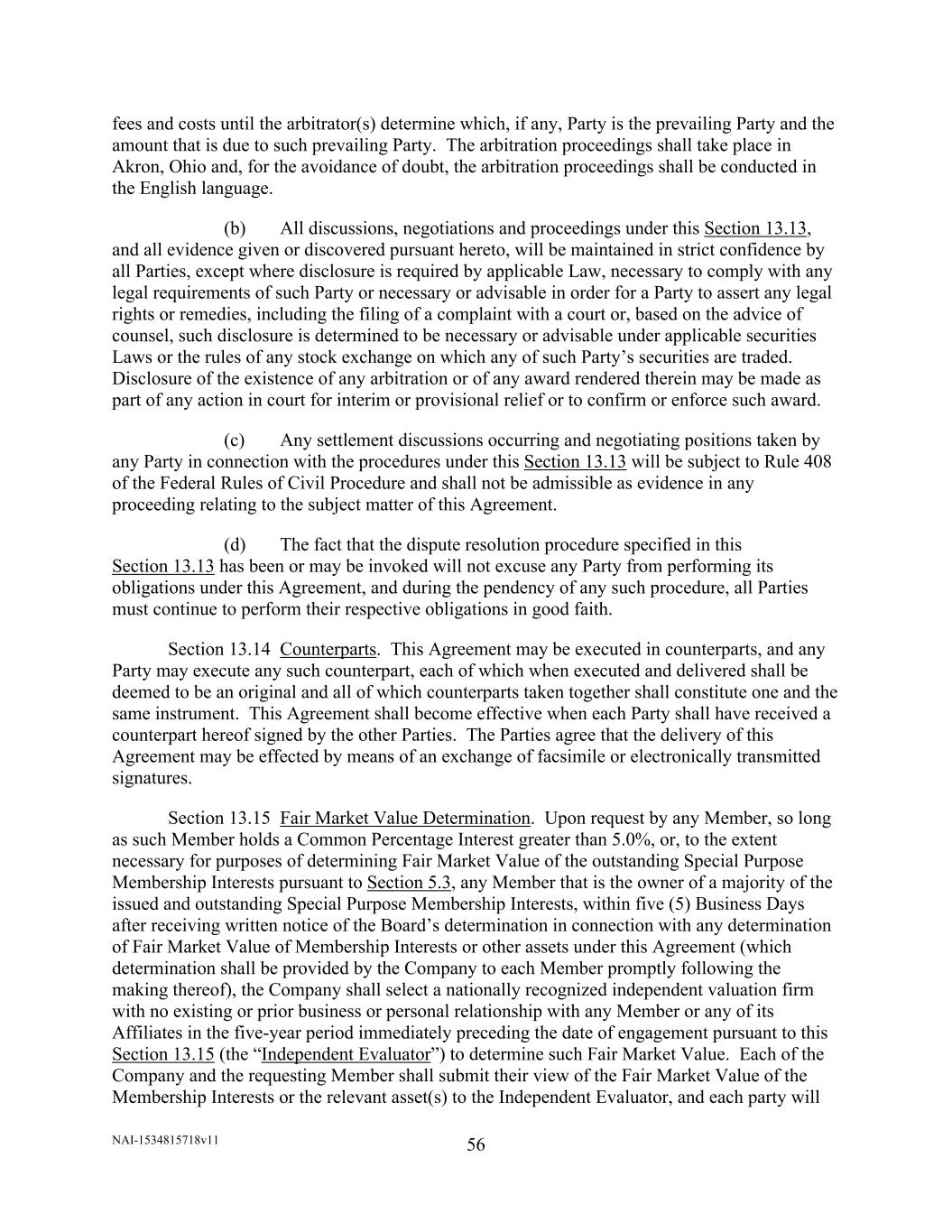 NAI-1534815718v11 56 fees and costs until the arbitrator(s) determine which, if any, Party is the prevailing Party and the amount that is due to such prevailing Party. The arbitration proceedings shall take place in Akron, Ohio and, for the avoidance of doubt, the arbitration proceedings shall be conducted in the English language. (b) All discussions, negotiations and proceedings under this Section 13.13, and all evidence given or discovered pursuant hereto, will be maintained in strict confidence by all Parties, except where disclosure is required by applicable Law, necessary to comply with any legal requirements of such Party or necessary or advisable in order for a Party to assert any legal rights or remedies, including the filing of a complaint with a court or, based on the advice of counsel, such disclosure is determined to be necessary or advisable under applicable securities Laws or the rules of any stock exchange on which any of such Party’s securities are traded. Disclosure of the existence of any arbitration or of any award rendered therein may be made as part of any action in court for interim or provisional relief or to confirm or enforce such award. (c) Any settlement discussions occurring and negotiating positions taken by any Party in connection with the procedures under this Section 13.13 will be subject to Rule 408 of the Federal Rules of Civil Procedure and shall not be admissible as evidence in any proceeding relating to the subject matter of this Agreement. (d) The fact that the dispute resolution procedure specified in this Section 13.13 has been or may be invoked will not excuse any Party from performing its obligations under this Agreement, and during the pendency of any such procedure, all Parties must continue to perform their respective obligations in good faith. Section 13.14 Counterparts. This Agreement may be executed in counterparts, and any Party may execute any such counterpart, each of which when executed and delivered shall be deemed to be an original and all of which counterparts taken together shall constitute one and the same instrument. This Agreement shall become effective when each Party shall have received a counterpart hereof signed by the other Parties. The Parties agree that the delivery of this Agreement may be effected by means of an exchange of facsimile or electronically transmitted signatures. Section 13.15 Fair Market Value Determination. Upon request by any Member, so long as such Member holds a Common Percentage Interest greater than 5.0%, or, to the extent necessary for purposes of determining Fair Market Value of the outstanding Special Purpose Membership Interests pursuant to Section 5.3, any Member that is the owner of a majority of the issued and outstanding Special Purpose Membership Interests, within five (5) Business Days after receiving written notice of the Board’s determination in connection with any determination of Fair Market Value of Membership Interests or other assets under this Agreement (which determination shall be provided by the Company to each Member promptly following the making thereof), the Company shall select a nationally recognized independent valuation firm with no existing or prior business or personal relationship with any Member or any of its Affiliates in the five-year period immediately preceding the date of engagement pursuant to this Section 13.15 (the “Independent Evaluator”) to determine such Fair Market Value. Each of the Company and the requesting Member shall submit their view of the Fair Market Value of the Membership Interests or the relevant asset(s) to the Independent Evaluator, and each party will