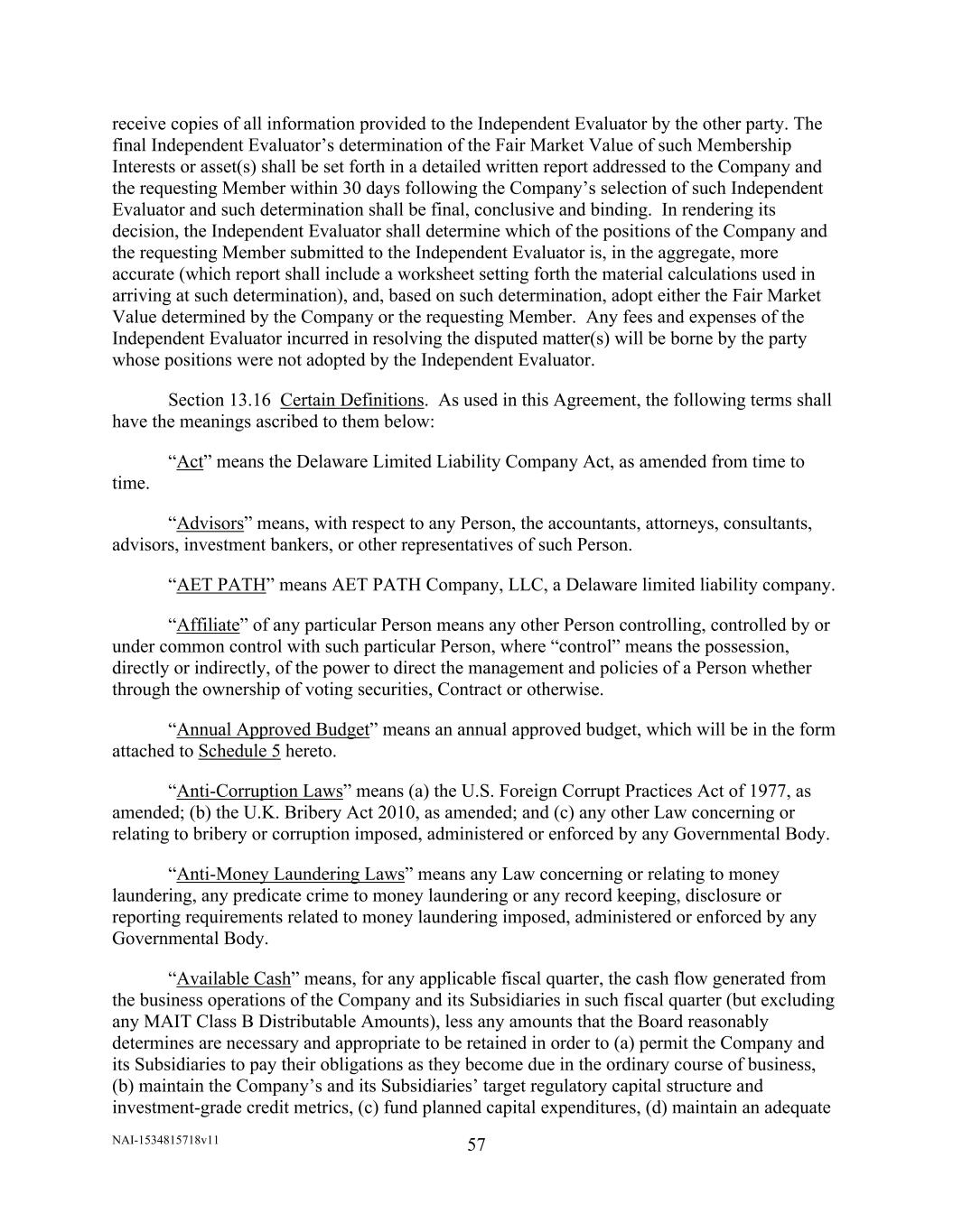 NAI-1534815718v11 57 receive copies of all information provided to the Independent Evaluator by the other party. The final Independent Evaluator’s determination of the Fair Market Value of such Membership Interests or asset(s) shall be set forth in a detailed written report addressed to the Company and the requesting Member within 30 days following the Company’s selection of such Independent Evaluator and such determination shall be final, conclusive and binding. In rendering its decision, the Independent Evaluator shall determine which of the positions of the Company and the requesting Member submitted to the Independent Evaluator is, in the aggregate, more accurate (which report shall include a worksheet setting forth the material calculations used in arriving at such determination), and, based on such determination, adopt either the Fair Market Value determined by the Company or the requesting Member. Any fees and expenses of the Independent Evaluator incurred in resolving the disputed matter(s) will be borne by the party whose positions were not adopted by the Independent Evaluator. Section 13.16 Certain Definitions. As used in this Agreement, the following terms shall have the meanings ascribed to them below: “Act” means the Delaware Limited Liability Company Act, as amended from time to time. “Advisors” means, with respect to any Person, the accountants, attorneys, consultants, advisors, investment bankers, or other representatives of such Person. “AET PATH” means AET PATH Company, LLC, a Delaware limited liability company. “Affiliate” of any particular Person means any other Person controlling, controlled by or under common control with such particular Person, where “control” means the possession, directly or indirectly, of the power to direct the management and policies of a Person whether through the ownership of voting securities, Contract or otherwise. “Annual Approved Budget” means an annual approved budget, which will be in the form attached to Schedule 5 hereto. “Anti-Corruption Laws” means (a) the U.S. Foreign Corrupt Practices Act of 1977, as amended; (b) the U.K. Bribery Act 2010, as amended; and (c) any other Law concerning or relating to bribery or corruption imposed, administered or enforced by any Governmental Body. “Anti-Money Laundering Laws” means any Law concerning or relating to money laundering, any predicate crime to money laundering or any record keeping, disclosure or reporting requirements related to money laundering imposed, administered or enforced by any Governmental Body. “Available Cash” means, for any applicable fiscal quarter, the cash flow generated from the business operations of the Company and its Subsidiaries in such fiscal quarter (but excluding any MAIT Class B Distributable Amounts), less any amounts that the Board reasonably determines are necessary and appropriate to be retained in order to (a) permit the Company and its Subsidiaries to pay their obligations as they become due in the ordinary course of business, (b) maintain the Company’s and its Subsidiaries’ target regulatory capital structure and investment-grade credit metrics, (c) fund planned capital expenditures, (d) maintain an adequate