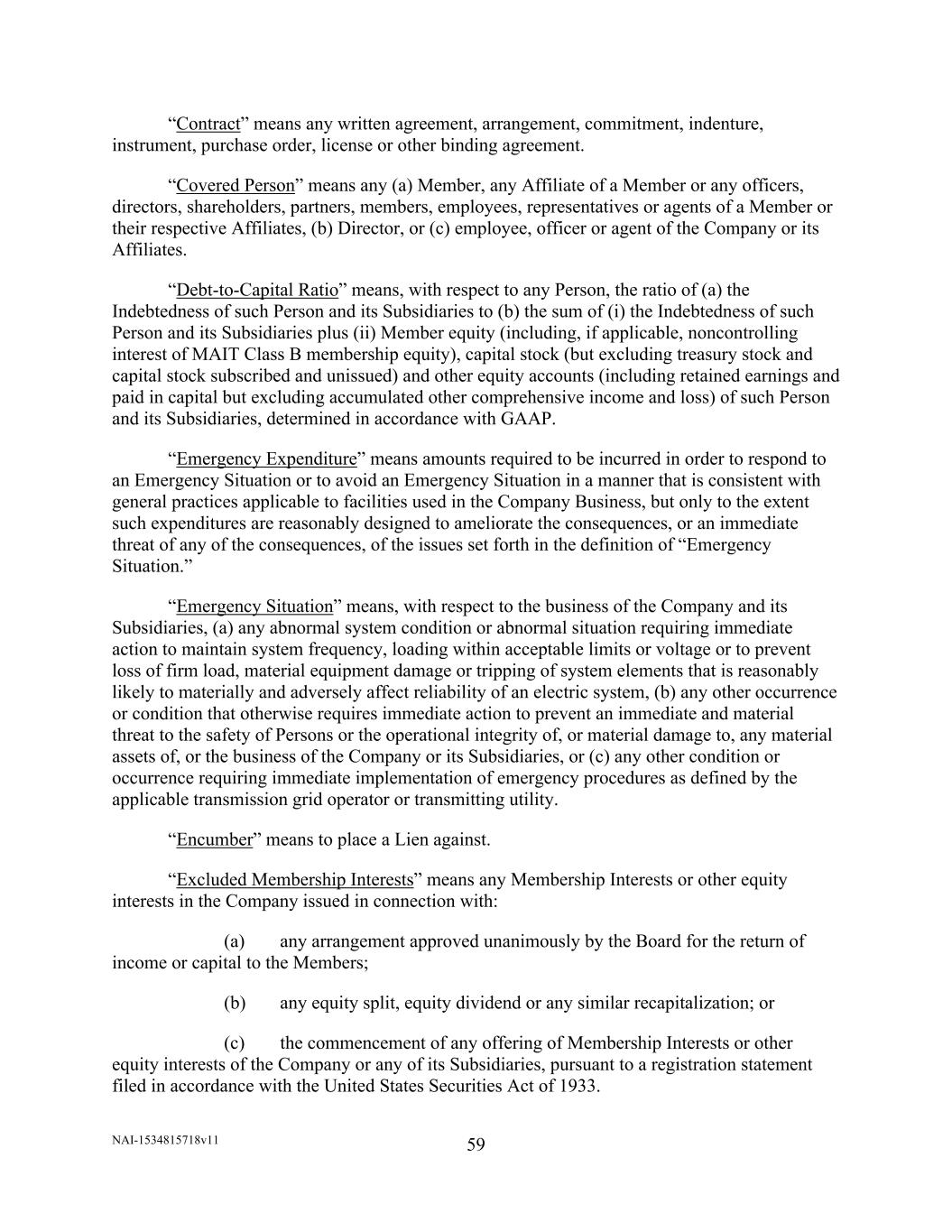 NAI-1534815718v11 59 “Contract” means any written agreement, arrangement, commitment, indenture, instrument, purchase order, license or other binding agreement. “Covered Person” means any (a) Member, any Affiliate of a Member or any officers, directors, shareholders, partners, members, employees, representatives or agents of a Member or their respective Affiliates, (b) Director, or (c) employee, officer or agent of the Company or its Affiliates. “Debt-to-Capital Ratio” means, with respect to any Person, the ratio of (a) the Indebtedness of such Person and its Subsidiaries to (b) the sum of (i) the Indebtedness of such Person and its Subsidiaries plus (ii) Member equity (including, if applicable, noncontrolling interest of MAIT Class B membership equity), capital stock (but excluding treasury stock and capital stock subscribed and unissued) and other equity accounts (including retained earnings and paid in capital but excluding accumulated other comprehensive income and loss) of such Person and its Subsidiaries, determined in accordance with GAAP. “Emergency Expenditure” means amounts required to be incurred in order to respond to an Emergency Situation or to avoid an Emergency Situation in a manner that is consistent with general practices applicable to facilities used in the Company Business, but only to the extent such expenditures are reasonably designed to ameliorate the consequences, or an immediate threat of any of the consequences, of the issues set forth in the definition of “Emergency Situation.” “Emergency Situation” means, with respect to the business of the Company and its Subsidiaries, (a) any abnormal system condition or abnormal situation requiring immediate action to maintain system frequency, loading within acceptable limits or voltage or to prevent loss of firm load, material equipment damage or tripping of system elements that is reasonably likely to materially and adversely affect reliability of an electric system, (b) any other occurrence or condition that otherwise requires immediate action to prevent an immediate and material threat to the safety of Persons or the operational integrity of, or material damage to, any material assets of, or the business of the Company or its Subsidiaries, or (c) any other condition or occurrence requiring immediate implementation of emergency procedures as defined by the applicable transmission grid operator or transmitting utility. “Encumber” means to place a Lien against. “Excluded Membership Interests” means any Membership Interests or other equity interests in the Company issued in connection with: (a) any arrangement approved unanimously by the Board for the return of income or capital to the Members; (b) any equity split, equity dividend or any similar recapitalization; or (c) the commencement of any offering of Membership Interests or other equity interests of the Company or any of its Subsidiaries, pursuant to a registration statement filed in accordance with the United States Securities Act of 1933.