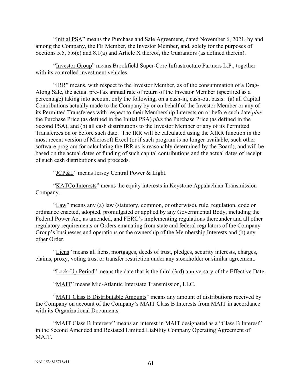 NAI-1534815718v11 61 “Initial PSA” means the Purchase and Sale Agreement, dated November 6, 2021, by and among the Company, the FE Member, the Investor Member, and, solely for the purposes of Sections 5.5, 5.6(c) and 8.1(a) and Article X thereof, the Guarantors (as defined therein). “Investor Group” means Brookfield Super-Core Infrastructure Partners L.P., together with its controlled investment vehicles. “IRR” means, with respect to the Investor Member, as of the consummation of a Drag- Along Sale, the actual pre-Tax annual rate of return of the Investor Member (specified as a percentage) taking into account only the following, on a cash-in, cash-out basis: (a) all Capital Contributions actually made to the Company by or on behalf of the Investor Member or any of its Permitted Transferees with respect to their Membership Interests on or before such date plus the Purchase Price (as defined in the Initial PSA) plus the Purchase Price (as defined in the Second PSA), and (b) all cash distributions to the Investor Member or any of its Permitted Transferees on or before such date. The IRR will be calculated using the XIRR function in the most recent version of Microsoft Excel (or if such program is no longer available, such other software program for calculating the IRR as is reasonably determined by the Board), and will be based on the actual dates of funding of such capital contributions and the actual dates of receipt of such cash distributions and proceeds. “JCP&L” means Jersey Central Power & Light. “KATCo Interests” means the equity interests in Keystone Appalachian Transmission Company. “Law” means any (a) law (statutory, common, or otherwise), rule, regulation, code or ordinance enacted, adopted, promulgated or applied by any Governmental Body, including the Federal Power Act, as amended, and FERC’s implementing regulations thereunder and all other regulatory requirements or Orders emanating from state and federal regulators of the Company Group’s businesses and operations or the ownership of the Membership Interests and (b) any other Order. “Liens” means all liens, mortgages, deeds of trust, pledges, security interests, charges, claims, proxy, voting trust or transfer restriction under any stockholder or similar agreement. “Lock-Up Period” means the date that is the third (3rd) anniversary of the Effective Date. “MAIT” means Mid-Atlantic Interstate Transmission, LLC. “MAIT Class B Distributable Amounts” means any amount of distributions received by the Company on account of the Company’s MAIT Class B Interests from MAIT in accordance with its Organizational Documents. “MAIT Class B Interests” means an interest in MAIT designated as a “Class B Interest” in the Second Amended and Restated Limited Liability Company Operating Agreement of MAIT.