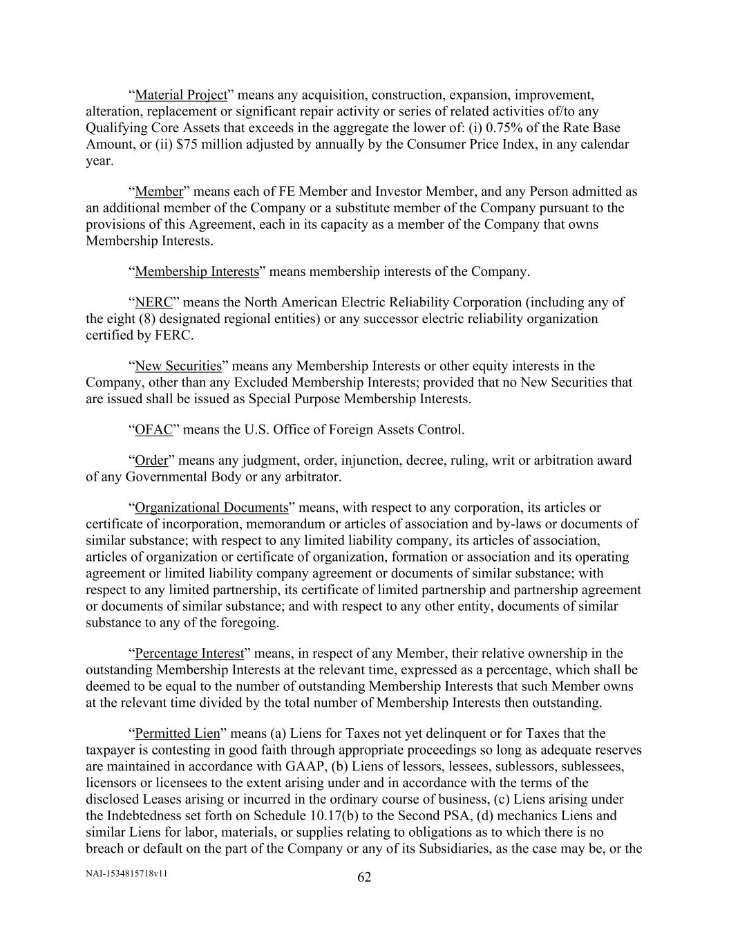 NAI-1534815718v11 62 “Material Project” means any acquisition, construction, expansion, improvement, alteration, replacement or significant repair activity or series of related activities of/to any Qualifying Core Assets that exceeds in the aggregate the lower of: (i) 0.75% of the Rate Base Amount, or (ii) $75 million adjusted by annually by the Consumer Price Index, in any calendar year. “Member” means each of FE Member and Investor Member, and any Person admitted as an additional member of the Company or a substitute member of the Company pursuant to the provisions of this Agreement, each in its capacity as a member of the Company that owns Membership Interests. “Membership Interests” means membership interests of the Company. “NERC” means the North American Electric Reliability Corporation (including any of the eight (8) designated regional entities) or any successor electric reliability organization certified by FERC. “New Securities” means any Membership Interests or other equity interests in the Company, other than any Excluded Membership Interests; provided that no New Securities that are issued shall be issued as Special Purpose Membership Interests. “OFAC” means the U.S. Office of Foreign Assets Control. “Order” means any judgment, order, injunction, decree, ruling, writ or arbitration award of any Governmental Body or any arbitrator. “Organizational Documents” means, with respect to any corporation, its articles or certificate of incorporation, memorandum or articles of association and by-laws or documents of similar substance; with respect to any limited liability company, its articles of association, articles of organization or certificate of organization, formation or association and its operating agreement or limited liability company agreement or documents of similar substance; with respect to any limited partnership, its certificate of limited partnership and partnership agreement or documents of similar substance; and with respect to any other entity, documents of similar substance to any of the foregoing. “Percentage Interest” means, in respect of any Member, their relative ownership in the outstanding Membership Interests at the relevant time, expressed as a percentage, which shall be deemed to be equal to the number of outstanding Membership Interests that such Member owns at the relevant time divided by the total number of Membership Interests then outstanding. “Permitted Lien” means (a) Liens for Taxes not yet delinquent or for Taxes that the taxpayer is contesting in good faith through appropriate proceedings so long as adequate reserves are maintained in accordance with GAAP, (b) Liens of lessors, lessees, sublessors, sublessees, licensors or licensees to the extent arising under and in accordance with the terms of the disclosed Leases arising or incurred in the ordinary course of business, (c) Liens arising under the Indebtedness set forth on Schedule 10.17(b) to the Second PSA, (d) mechanics Liens and similar Liens for labor, materials, or supplies relating to obligations as to which there is no breach or default on the part of the Company or any of its Subsidiaries, as the case may be, or the