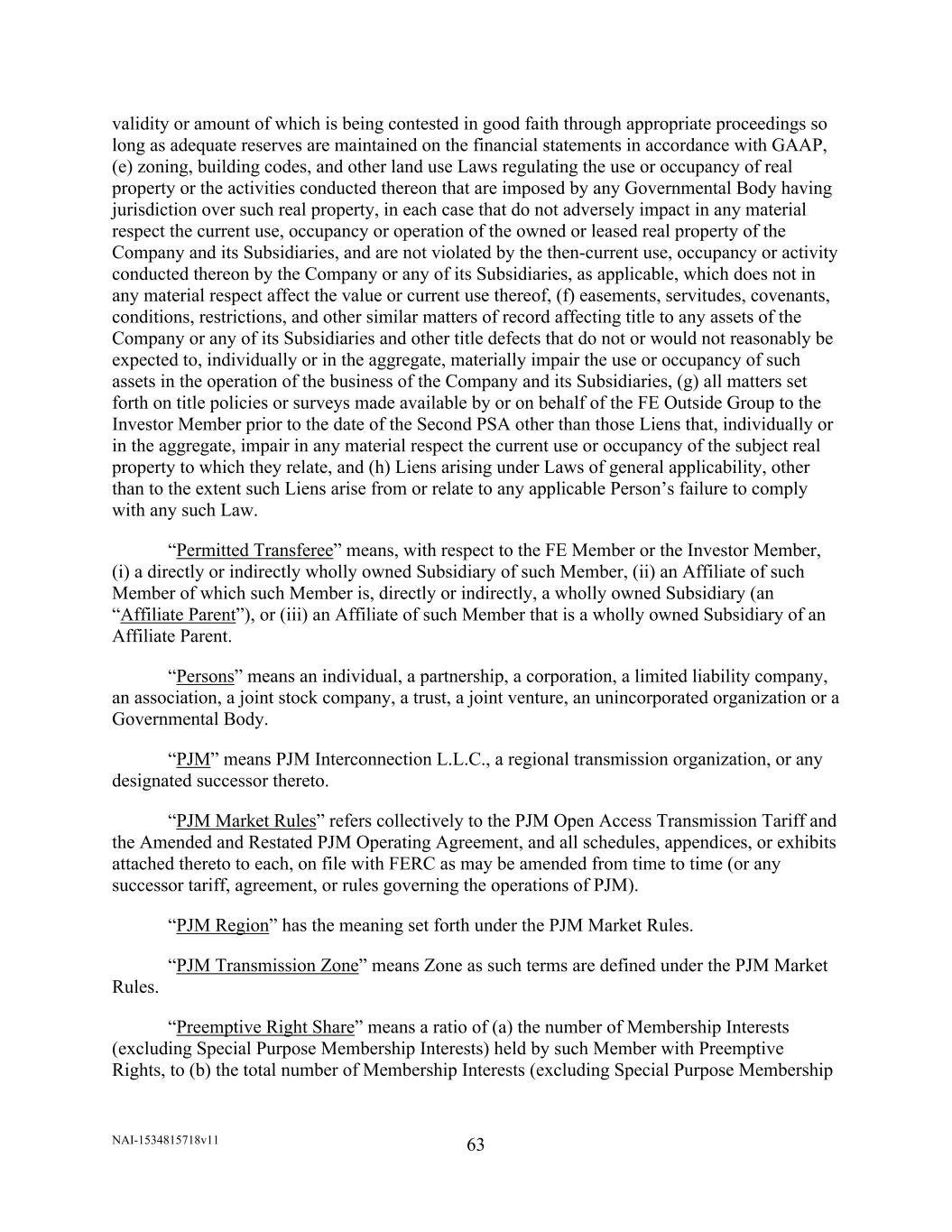 NAI-1534815718v11 63 validity or amount of which is being contested in good faith through appropriate proceedings so long as adequate reserves are maintained on the financial statements in accordance with GAAP, (e) zoning, building codes, and other land use Laws regulating the use or occupancy of real property or the activities conducted thereon that are imposed by any Governmental Body having jurisdiction over such real property, in each case that do not adversely impact in any material respect the current use, occupancy or operation of the owned or leased real property of the Company and its Subsidiaries, and are not violated by the then-current use, occupancy or activity conducted thereon by the Company or any of its Subsidiaries, as applicable, which does not in any material respect affect the value or current use thereof, (f) easements, servitudes, covenants, conditions, restrictions, and other similar matters of record affecting title to any assets of the Company or any of its Subsidiaries and other title defects that do not or would not reasonably be expected to, individually or in the aggregate, materially impair the use or occupancy of such assets in the operation of the business of the Company and its Subsidiaries, (g) all matters set forth on title policies or surveys made available by or on behalf of the FE Outside Group to the Investor Member prior to the date of the Second PSA other than those Liens that, individually or in the aggregate, impair in any material respect the current use or occupancy of the subject real property to which they relate, and (h) Liens arising under Laws of general applicability, other than to the extent such Liens arise from or relate to any applicable Person’s failure to comply with any such Law. “Permitted Transferee” means, with respect to the FE Member or the Investor Member, (i) a directly or indirectly wholly owned Subsidiary of such Member, (ii) an Affiliate of such Member of which such Member is, directly or indirectly, a wholly owned Subsidiary (an “Affiliate Parent”), or (iii) an Affiliate of such Member that is a wholly owned Subsidiary of an Affiliate Parent. “Persons” means an individual, a partnership, a corporation, a limited liability company, an association, a joint stock company, a trust, a joint venture, an unincorporated organization or a Governmental Body. “PJM” means PJM Interconnection L.L.C., a regional transmission organization, or any designated successor thereto. “PJM Market Rules” refers collectively to the PJM Open Access Transmission Tariff and the Amended and Restated PJM Operating Agreement, and all schedules, appendices, or exhibits attached thereto to each, on file with FERC as may be amended from time to time (or any successor tariff, agreement, or rules governing the operations of PJM). “PJM Region” has the meaning set forth under the PJM Market Rules. “PJM Transmission Zone” means Zone as such terms are defined under the PJM Market Rules. “Preemptive Right Share” means a ratio of (a) the number of Membership Interests (excluding Special Purpose Membership Interests) held by such Member with Preemptive Rights, to (b) the total number of Membership Interests (excluding Special Purpose Membership