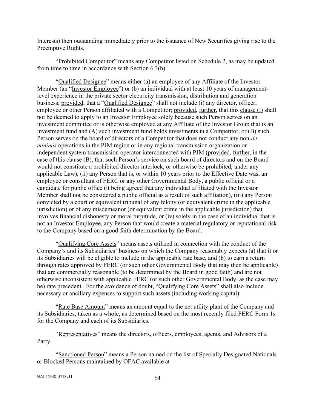 NAI-1534815718v11 64 Interests) then outstanding immediately prior to the issuance of New Securities giving rise to the Preemptive Rights. “Prohibited Competitor” means any Competitor listed on Schedule 2, as may be updated from time to time in accordance with Section 6.3(b). “Qualified Designee” means either (a) an employee of any Affiliate of the Investor Member (an “Investor Employee”) or (b) an individual with at least 10 years of management- level experience in the private sector electricity transmission, distribution and generation business; provided, that a “Qualified Designee” shall not include (i) any director, officer, employee or other Person affiliated with a Competitor; provided, further, that this clause (i) shall not be deemed to apply to an Investor Employee solely because such Person serves on an investment committee or is otherwise employed at any Affiliate of the Investor Group that is an investment fund and (A) such investment fund holds investments in a Competitor, or (B) such Person serves on the board of directors of a Competitor that does not conduct any non-de minimis operations in the PJM region or in any regional transmission organization or independent system transmission operator interconnected with PJM (provided, further, in the case of this clause (B), that such Person’s service on such board of directors and on the Board would not constitute a prohibited director interlock, or otherwise be prohibited, under any applicable Law), (ii) any Person that is, or within 10 years prior to the Effective Date was, an employee or consultant of FERC or any other Governmental Body, a public official or a candidate for public office (it being agreed that any individual affiliated with the Investor Member shall not be considered a public official as a result of such affiliation), (iii) any Person convicted by a court or equivalent tribunal of any felony (or equivalent crime in the applicable jurisdiction) or of any misdemeanor (or equivalent crime in the applicable jurisdiction) that involves financial dishonesty or moral turpitude, or (iv) solely in the case of an individual that is not an Investor Employee, any Person that would create a material regulatory or reputational risk to the Company based on a good-faith determination by the Board. “Qualifying Core Assets” means assets utilized in connection with the conduct of the Company’s and its Subsidiaries’ business on which the Company reasonably expects (a) that it or its Subsidiaries will be eligible to include in the applicable rate base, and (b) to earn a return through rates approved by FERC (or such other Governmental Body that may then be applicable) that are commercially reasonable (to be determined by the Board in good faith) and are not otherwise inconsistent with applicable FERC (or such other Governmental Body, as the case may be) rate precedent. For the avoidance of doubt, “Qualifying Core Assets” shall also include necessary or ancillary expenses to support such assets (including working capital). “Rate Base Amount” means an amount equal to the net utility plant of the Company and its Subsidiaries, taken as a whole, as determined based on the most recently filed FERC Form 1s for the Company and each of its Subsidiaries. “Representatives” means the directors, officers, employees, agents, and Advisors of a Party. “Sanctioned Person” means a Person named on the list of Specially Designated Nationals or Blocked Persons maintained by OFAC available at