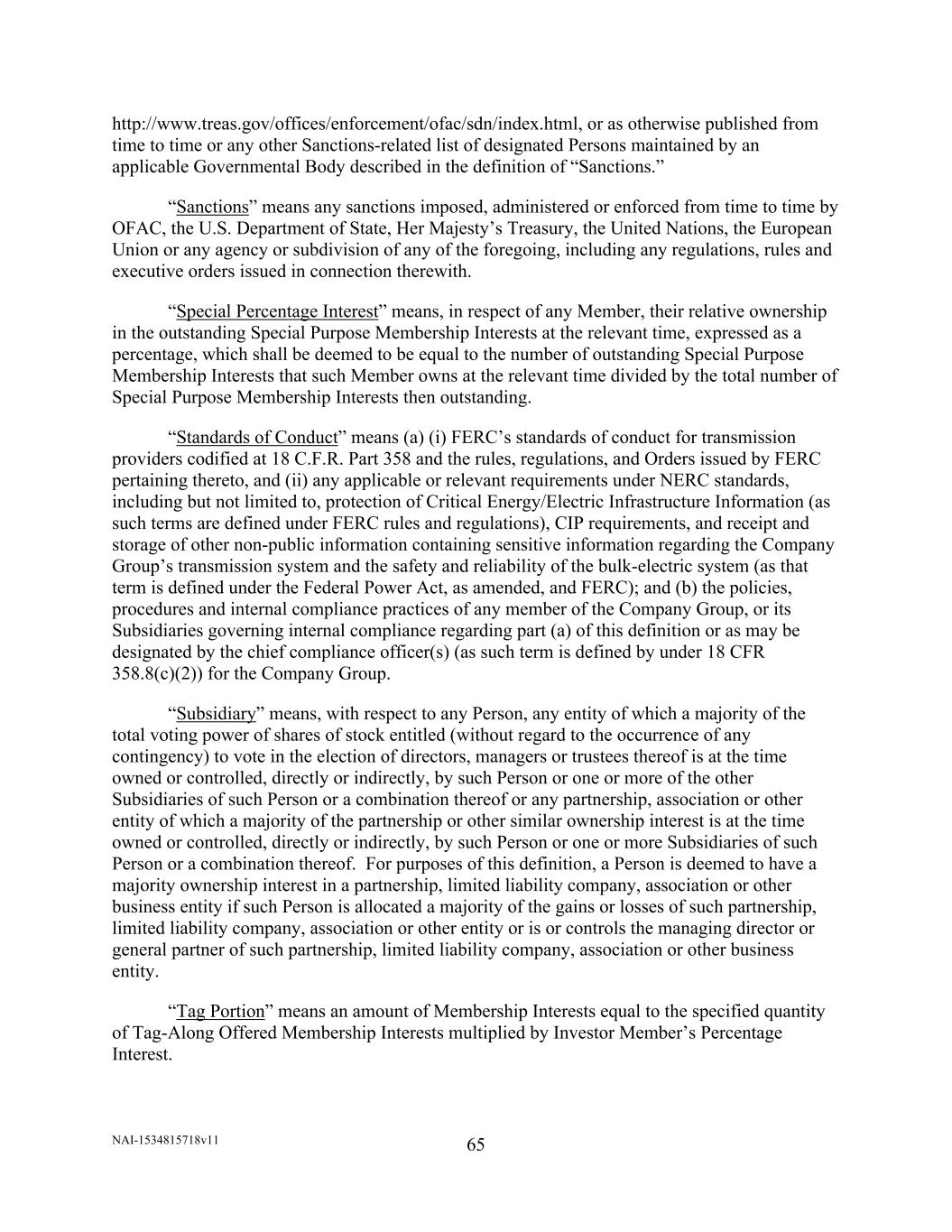 NAI-1534815718v11 65 http://www.treas.gov/offices/enforcement/ofac/sdn/index.html, or as otherwise published from time to time or any other Sanctions-related list of designated Persons maintained by an applicable Governmental Body described in the definition of “Sanctions.” “Sanctions” means any sanctions imposed, administered or enforced from time to time by OFAC, the U.S. Department of State, Her Majesty’s Treasury, the United Nations, the European Union or any agency or subdivision of any of the foregoing, including any regulations, rules and executive orders issued in connection therewith. “Special Percentage Interest” means, in respect of any Member, their relative ownership in the outstanding Special Purpose Membership Interests at the relevant time, expressed as a percentage, which shall be deemed to be equal to the number of outstanding Special Purpose Membership Interests that such Member owns at the relevant time divided by the total number of Special Purpose Membership Interests then outstanding. “Standards of Conduct” means (a) (i) FERC’s standards of conduct for transmission providers codified at 18 C.F.R. Part 358 and the rules, regulations, and Orders issued by FERC pertaining thereto, and (ii) any applicable or relevant requirements under NERC standards, including but not limited to, protection of Critical Energy/Electric Infrastructure Information (as such terms are defined under FERC rules and regulations), CIP requirements, and receipt and storage of other non-public information containing sensitive information regarding the Company Group’s transmission system and the safety and reliability of the bulk-electric system (as that term is defined under the Federal Power Act, as amended, and FERC); and (b) the policies, procedures and internal compliance practices of any member of the Company Group, or its Subsidiaries governing internal compliance regarding part (a) of this definition or as may be designated by the chief compliance officer(s) (as such term is defined by under 18 CFR 358.8(c)(2)) for the Company Group. “Subsidiary” means, with respect to any Person, any entity of which a majority of the total voting power of shares of stock entitled (without regard to the occurrence of any contingency) to vote in the election of directors, managers or trustees thereof is at the time owned or controlled, directly or indirectly, by such Person or one or more of the other Subsidiaries of such Person or a combination thereof or any partnership, association or other entity of which a majority of the partnership or other similar ownership interest is at the time owned or controlled, directly or indirectly, by such Person or one or more Subsidiaries of such Person or a combination thereof. For purposes of this definition, a Person is deemed to have a majority ownership interest in a partnership, limited liability company, association or other business entity if such Person is allocated a majority of the gains or losses of such partnership, limited liability company, association or other entity or is or controls the managing director or general partner of such partnership, limited liability company, association or other business entity. “Tag Portion” means an amount of Membership Interests equal to the specified quantity of Tag-Along Offered Membership Interests multiplied by Investor Member’s Percentage Interest.