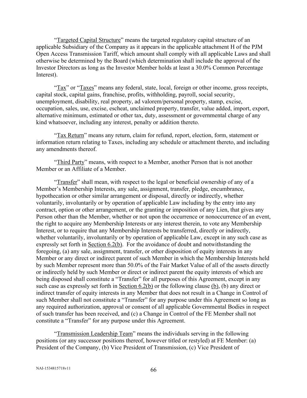 NAI-1534815718v11 66 “Targeted Capital Structure” means the targeted regulatory capital structure of an applicable Subsidiary of the Company as it appears in the applicable attachment H of the PJM Open Access Transmission Tariff, which amount shall comply with all applicable Laws and shall otherwise be determined by the Board (which determination shall include the approval of the Investor Directors as long as the Investor Member holds at least a 30.0% Common Percentage Interest). “Tax” or “Taxes” means any federal, state, local, foreign or other income, gross receipts, capital stock, capital gains, franchise, profits, withholding, payroll, social security, unemployment, disability, real property, ad valorem/personal property, stamp, excise, occupation, sales, use, excise, escheat, unclaimed property, transfer, value added, import, export, alternative minimum, estimated or other tax, duty, assessment or governmental charge of any kind whatsoever, including any interest, penalty or addition thereto. “Tax Return” means any return, claim for refund, report, election, form, statement or information return relating to Taxes, including any schedule or attachment thereto, and including any amendments thereof. “Third Party” means, with respect to a Member, another Person that is not another Member or an Affiliate of a Member. “Transfer” shall mean, with respect to the legal or beneficial ownership of any of a Member’s Membership Interests, any sale, assignment, transfer, pledge, encumbrance, hypothecation or other similar arrangement or disposal, directly or indirectly, whether voluntarily, involuntarily or by operation of applicable Law including by the entry into any contract, option or other arrangement, or the granting or imposition of any Lien, that gives any Person other than the Member, whether or not upon the occurrence or nonoccurrence of an event, the right to acquire any Membership Interests or any interest therein, to vote any Membership Interest, or to require that any Membership Interests be transferred, directly or indirectly, whether voluntarily, involuntarily or by operation of applicable Law, except in any such case as expressly set forth in Section 6.2(b). For the avoidance of doubt and notwithstanding the foregoing, (a) any sale, assignment, transfer, or other disposition of equity interests in any Member or any direct or indirect parent of such Member in which the Membership Interests held by such Member represent more than 50.0% of the Fair Market Value of all of the assets directly or indirectly held by such Member or direct or indirect parent the equity interests of which are being disposed shall constitute a “Transfer” for all purposes of this Agreement, except in any such case as expressly set forth in Section 6.2(b) or the following clause (b), (b) any direct or indirect transfer of equity interests in any Member that does not result in a Change in Control of such Member shall not constitute a “Transfer” for any purpose under this Agreement so long as any required authorization, approval or consent of all applicable Governmental Bodies in respect of such transfer has been received, and (c) a Change in Control of the FE Member shall not constitute a “Transfer” for any purpose under this Agreement. “Transmission Leadership Team” means the individuals serving in the following positions (or any successor positions thereof, however titled or restyled) at FE Member: (a) President of the Company, (b) Vice President of Transmission, (c) Vice President of